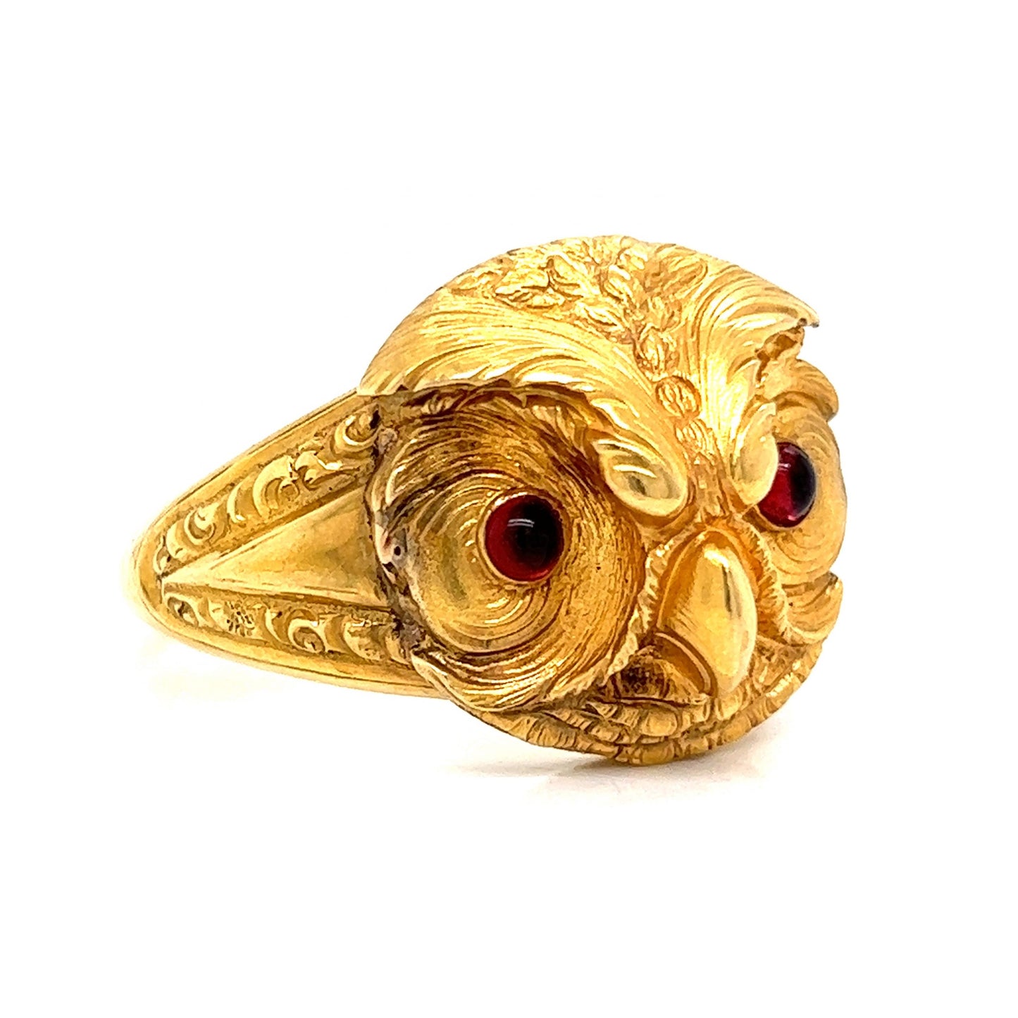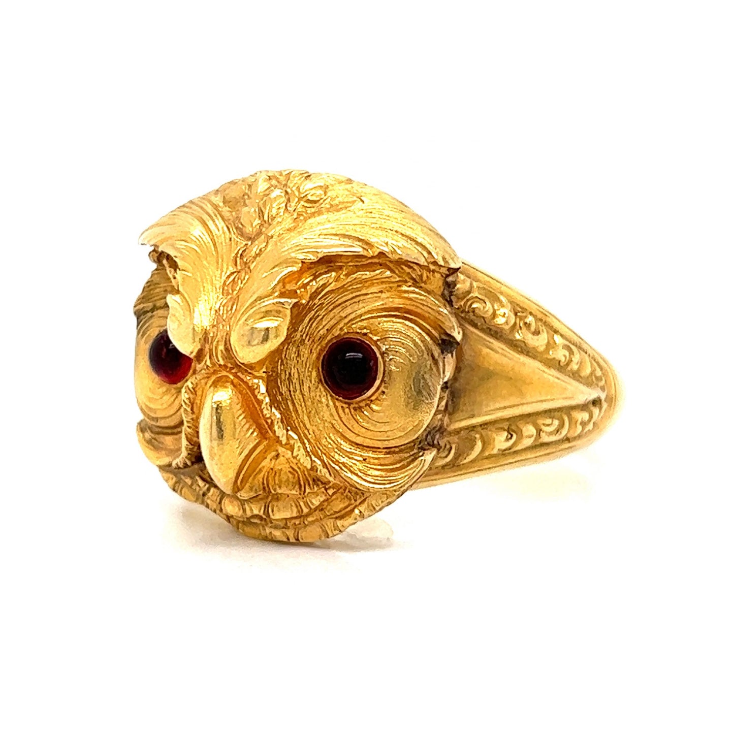 This mens Victorian ring features an engraved owl motif with red garnet eyes in 18 karat yellow gold. Two (2) cabochon garnets with a deep burgundy hue create the owl eyes. The gemstones weigh a total of .36 carats. The detailing and carving of the owl face is absolutely stunning and extends down the shank of the ring.  Cast in 18 karat gold, this piece has a rich warm yellow tone. A stunning gift for an antique jewelry lover.