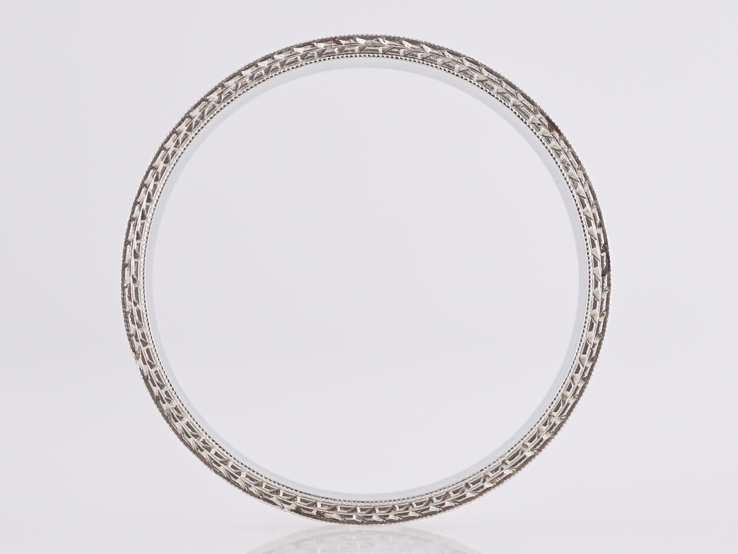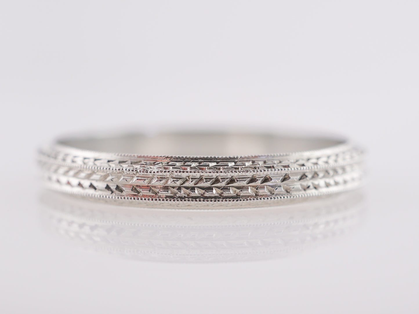 Mens Engraved Art Deco Wedding Band in 18K. This exceptionally beautiful men’s Art Deco wedding band features geometric engravings in 18k white gold. Resembling the graphic stylings of the era, this Art Deco band has precise linear patterns that, in repetition, create a beautiful harmony. This ring reaches 1.46 mm above the finger and weighs 3.8 grams. Engraved wedding bands are potentially resizable.