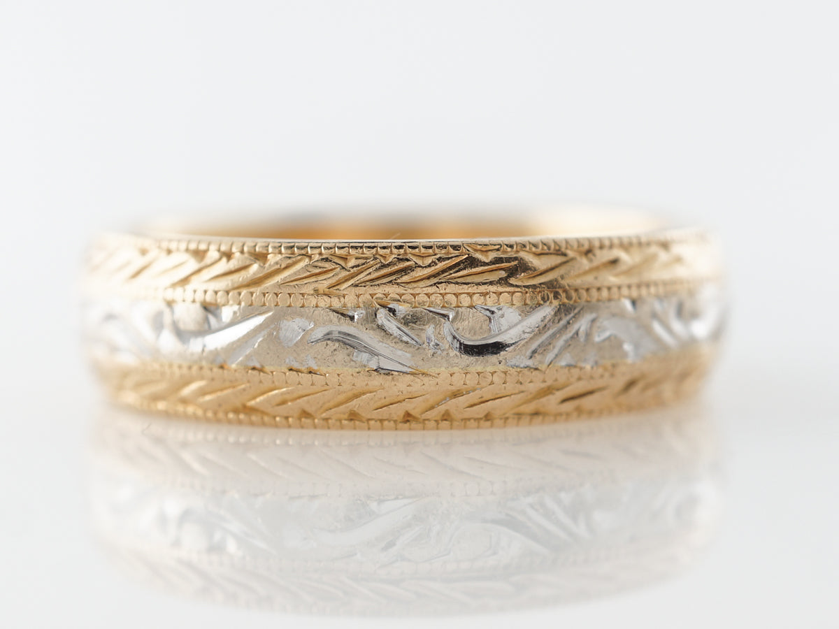 Mens Engraved Wedding Band in 14k Yellow White Gold. This mens wedding band is finished in 14 karat yellow and white gold and features skillful engraving throughout. The outer sections of the ring contain repeating engravings in the same direction in yellow gold inside milgrain bead work. The center section is made of flowing engravings in white gold. The contrast of metals and engravings make this band quite a special piece.