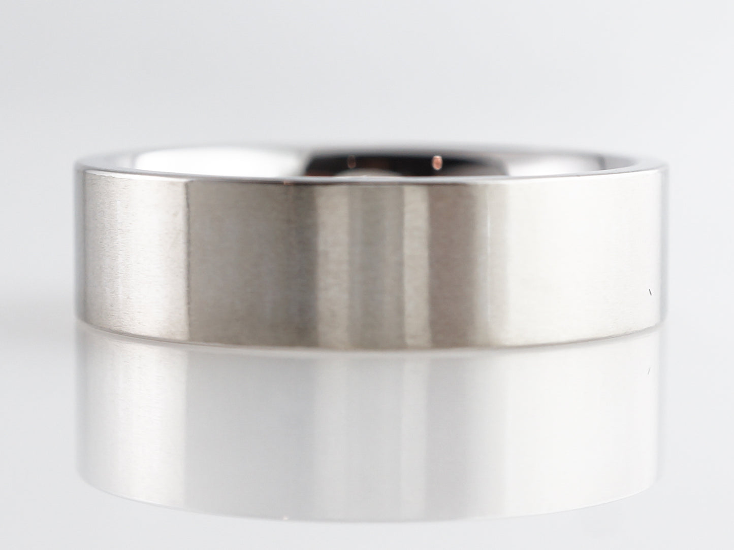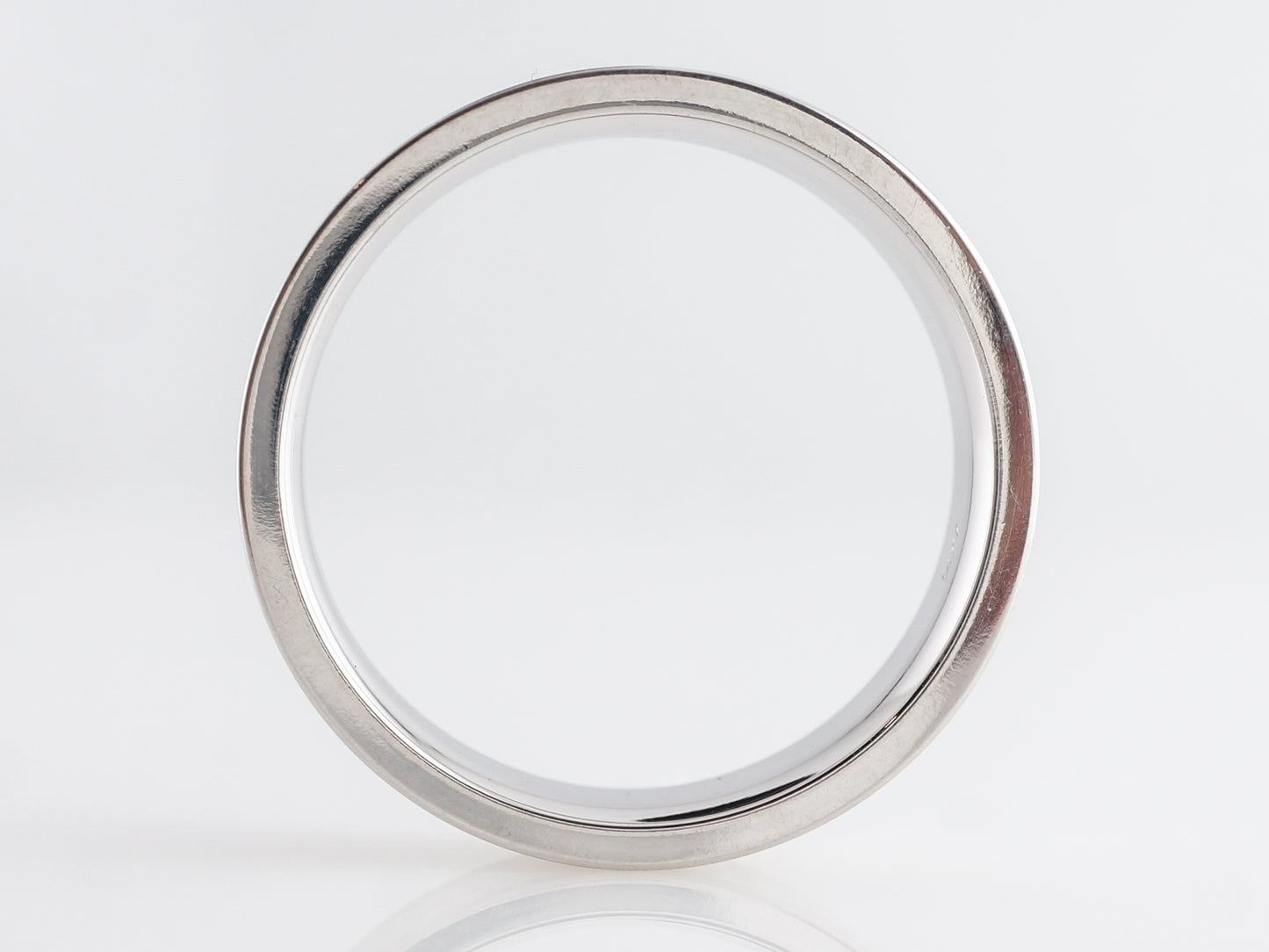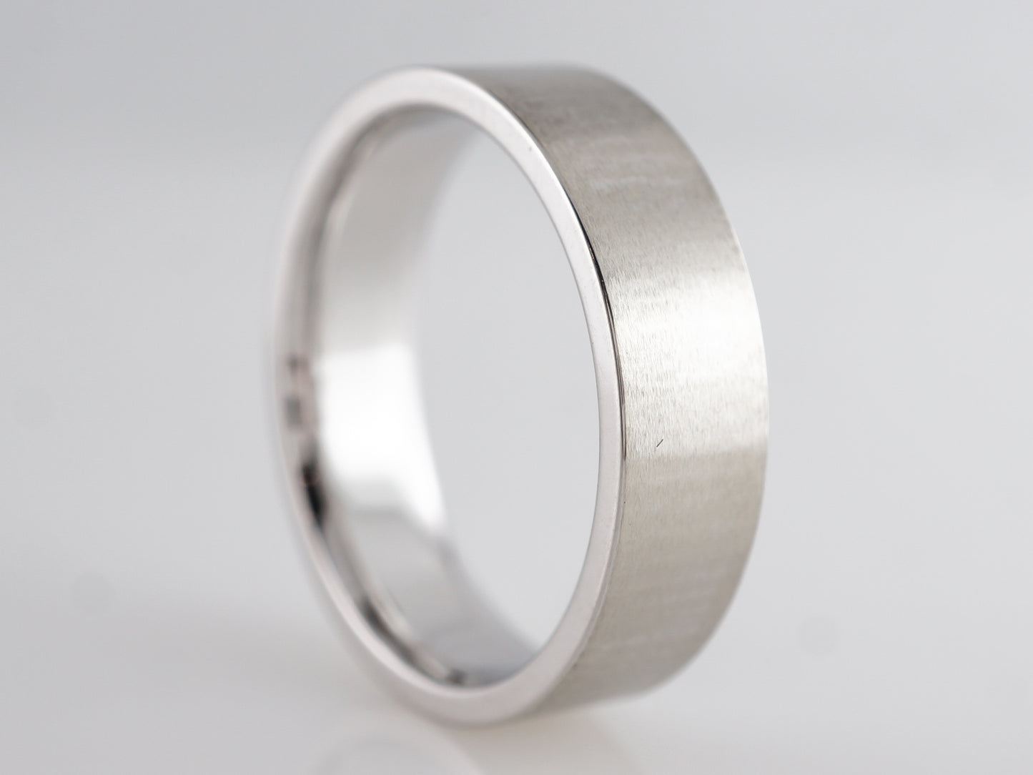 This modern wedding band has a width of 6 millimeters and weighs 9.5 grams. The ring features a flat edge profile and comfort fit interior. The ring is finished in high polished 14 karat white gold.
