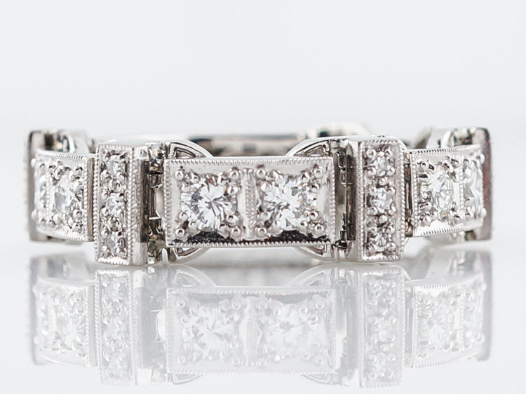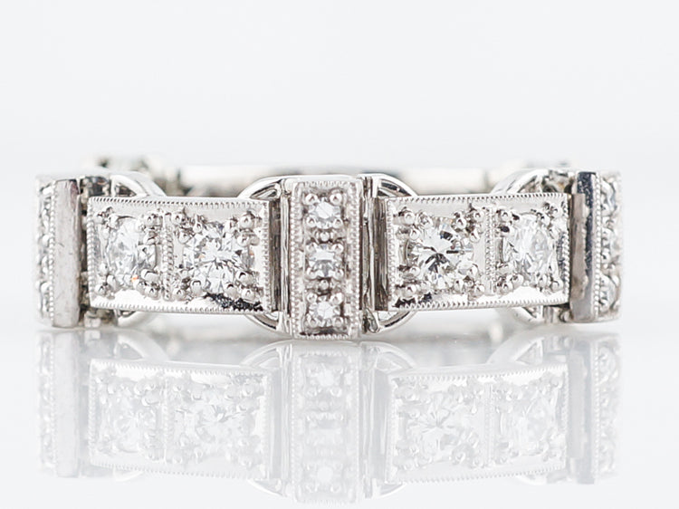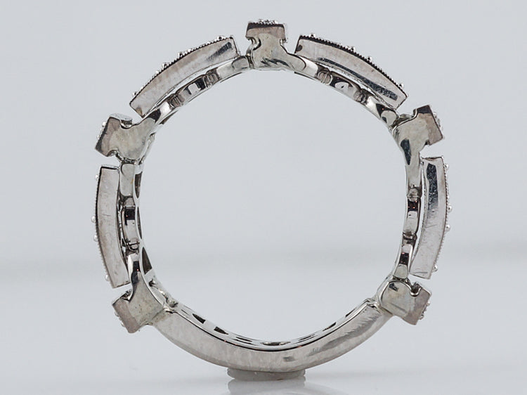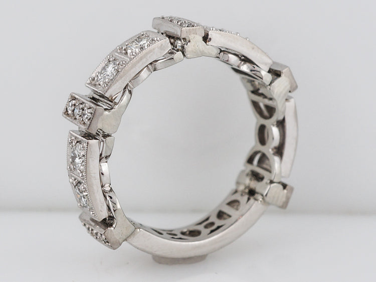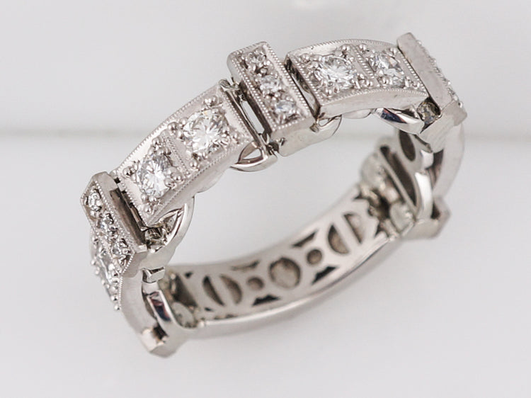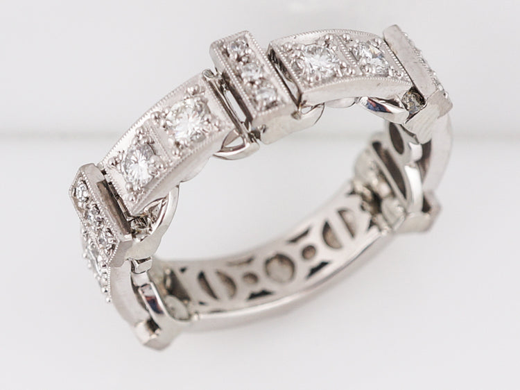 This fabulous Modern mens wedding band is beautifully crafted in a mixture of brightly polished 18k white gold and platinum. It features vertical geometric stations of three (3) round brilliant cut diamonds next to horizontal stations with larger fishtail set round brilliant cut diamonds. The pattern repeats itself nearly the entire length of the ring, but leave a plain section at its rear allowing for the ability to be size. The link design paired with the fishtail bring setting of the the diamonds is a definite nod to the geometric stylings of the 1920s Art Deco era.