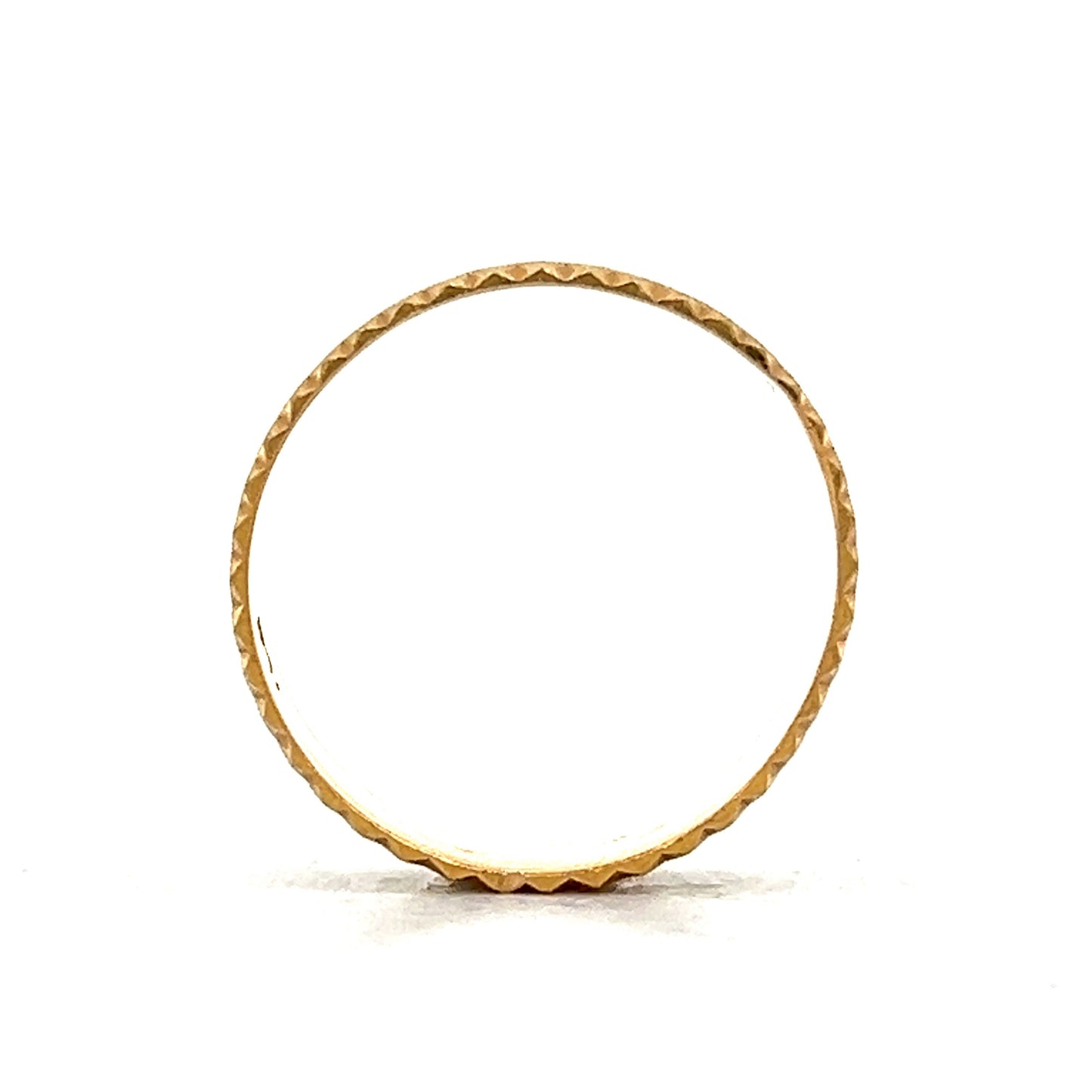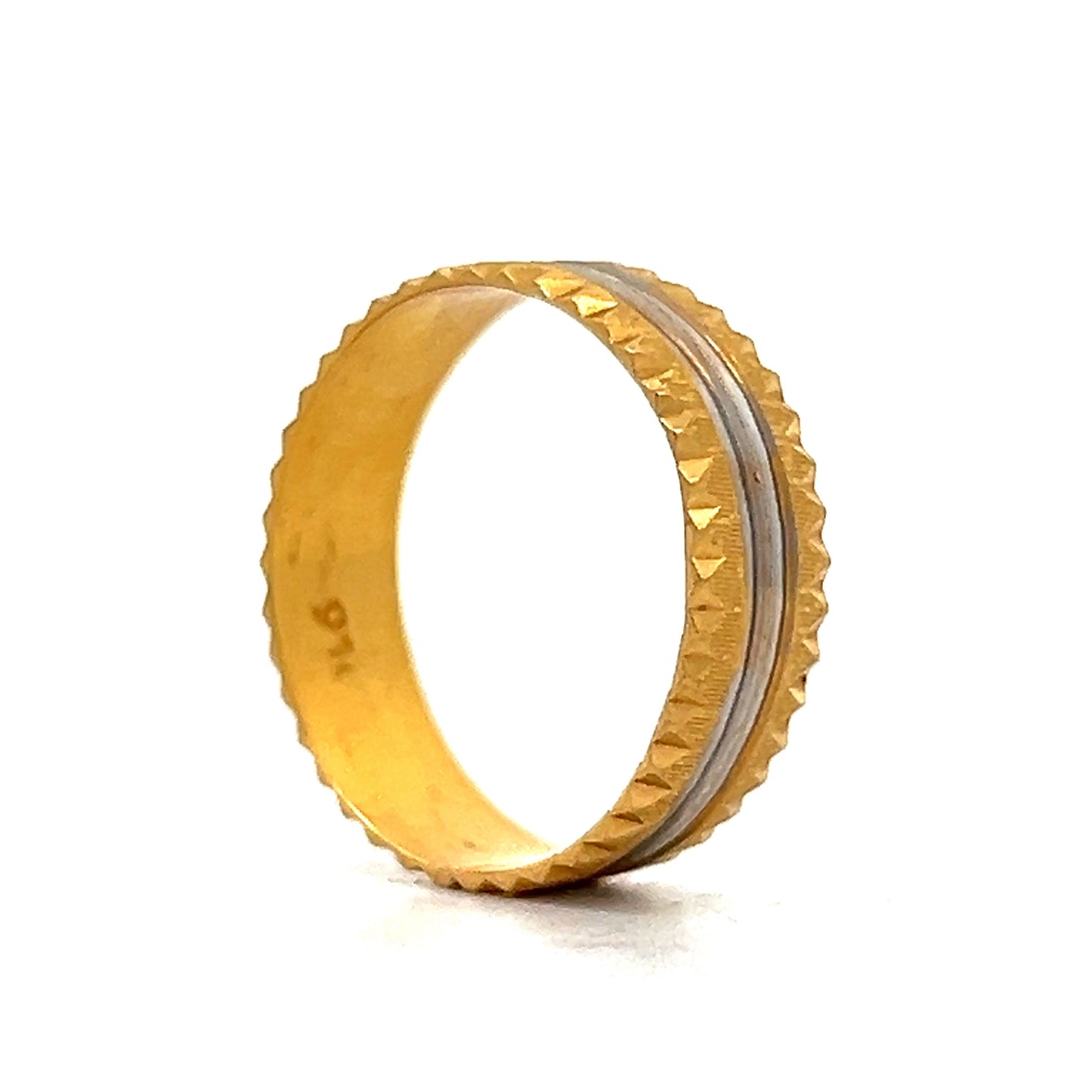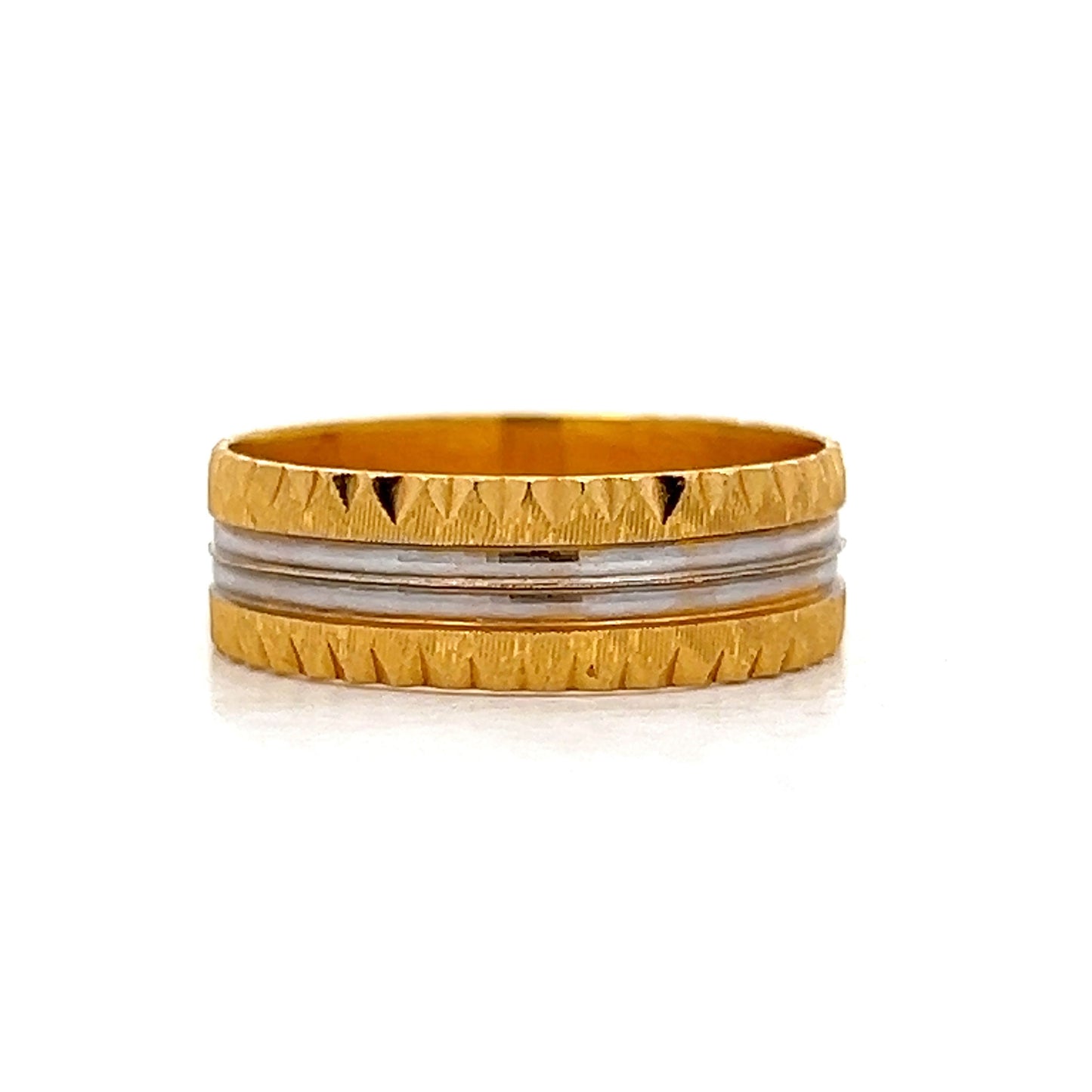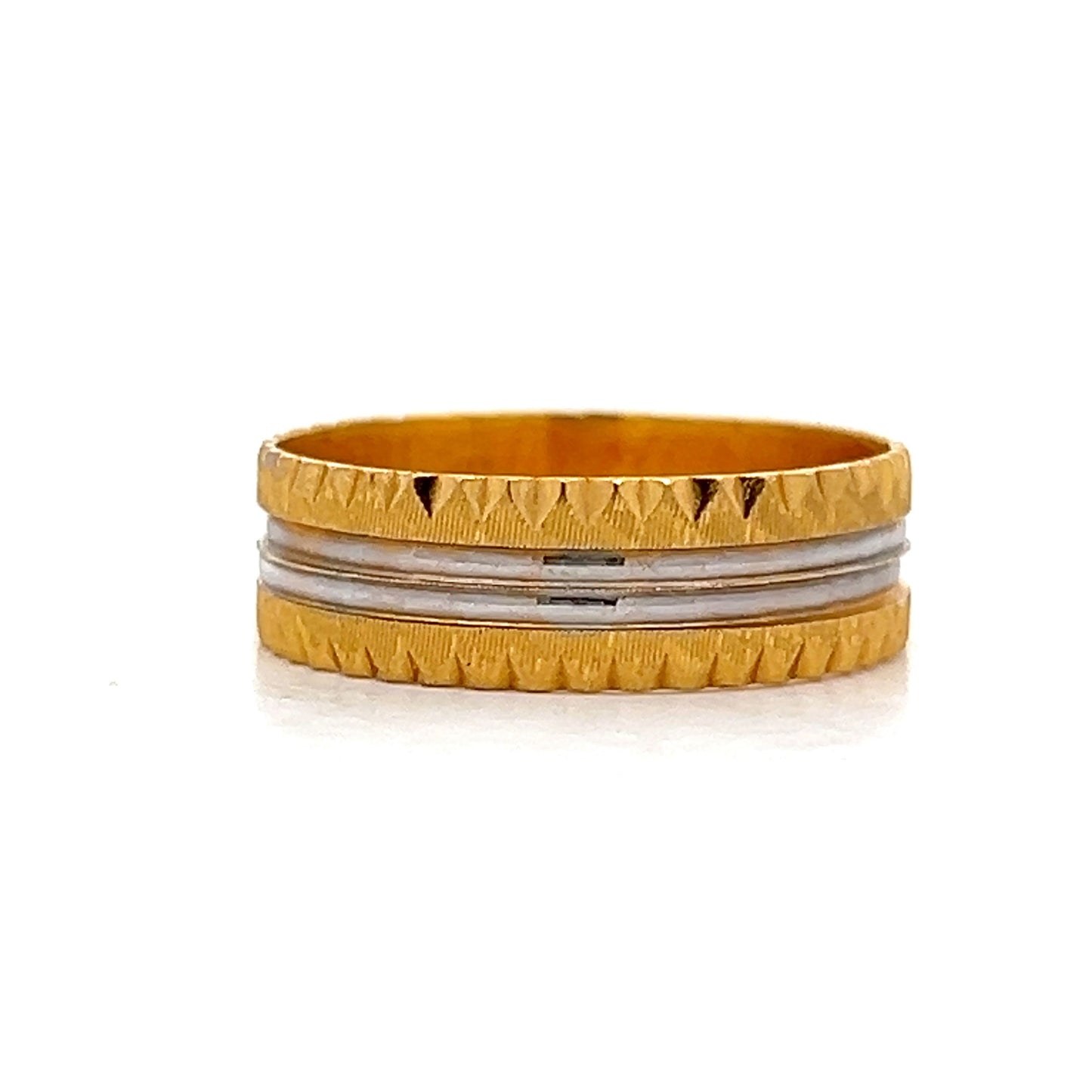 This 22 karat yellow gold men’s wedding band combines bold style with classic touches, featuring a white gold center highlighted by a diamond-cut ridge that adds texture and edge. The contrasting yellow gold edges bring depth and dimension, creating a standout two-tone look. Whether marking a special moment or making a statement, this band’s mix of sleek lines and rich finishes speaks to those who value distinctive style with a nod to tradition.