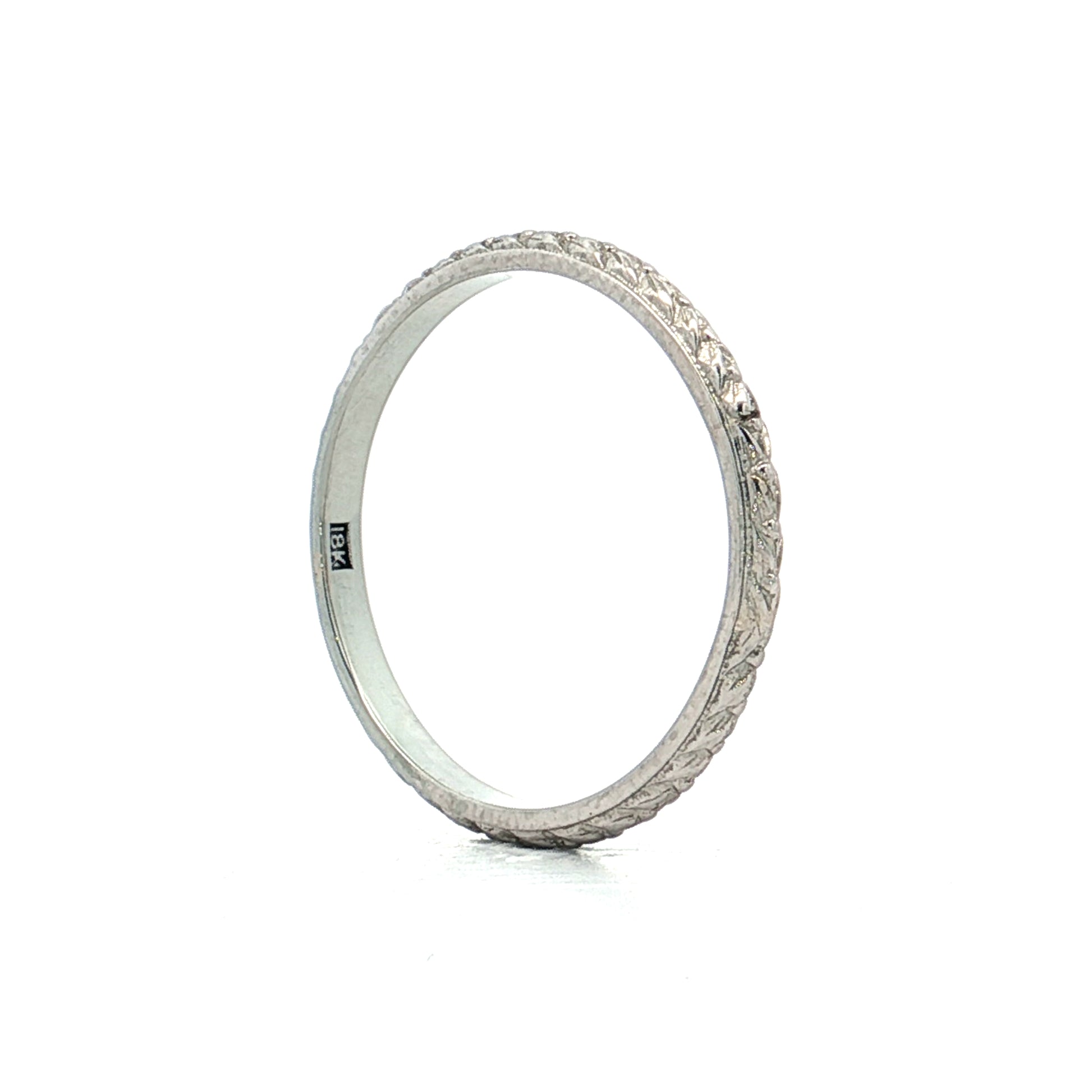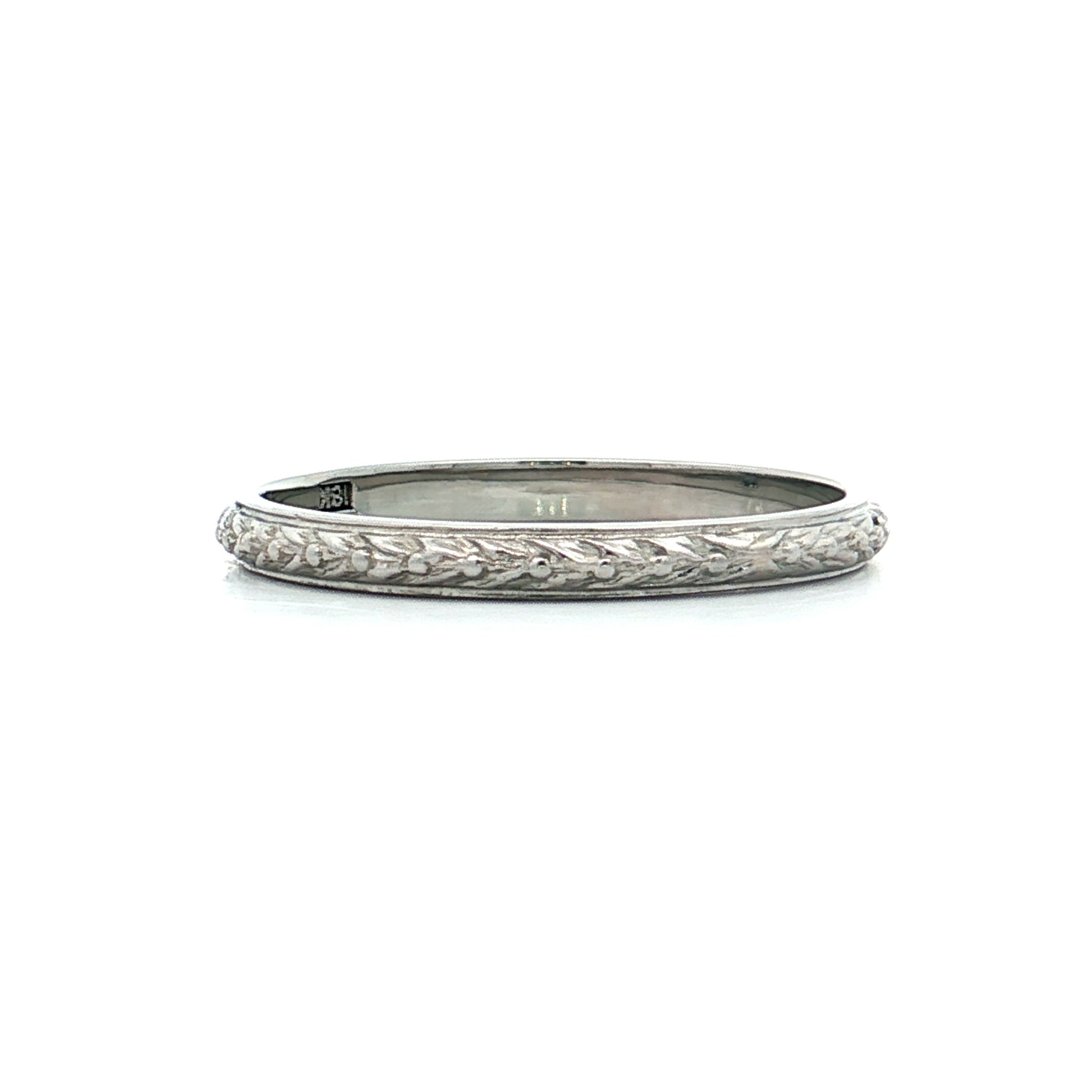 This Art Deco men's wedding band is made of 18 karat white gold and features an engraved chevron pattern running around the band. The ring measures 2.5mm wide, making it a comfortable everyday width that's substantial without being bulky. The chevron engraving is characteristic of 1920s-1930s design and adds texture and dimension to the band's surface. White gold provides a bright, cool-toned finish that's durable for daily wear.