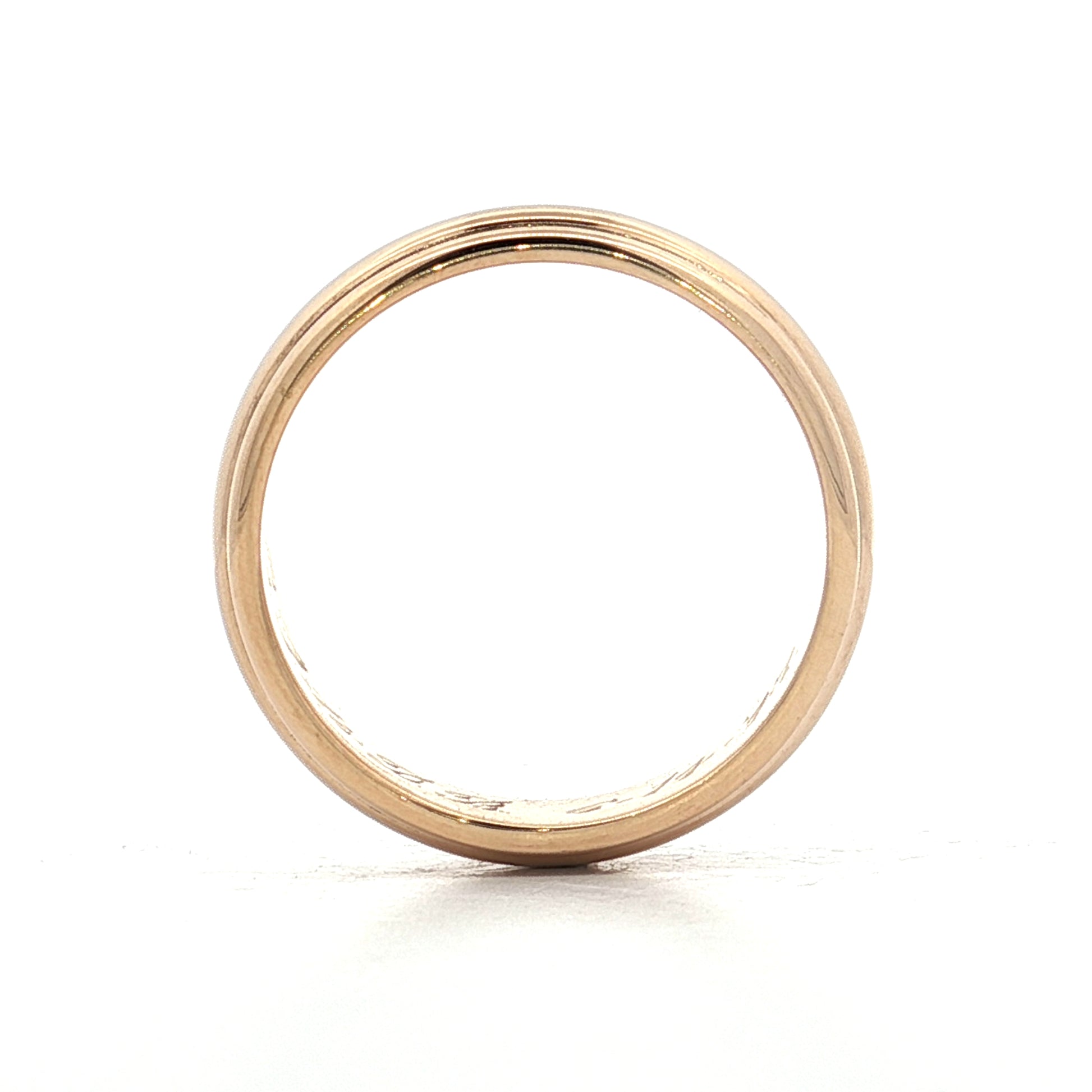 This Retro-era men's wedding band is made of 14 karat yellow gold with a ridge band design running around the ring. The half-round profile measures 5.5mm wide with a standard fit, making it comfortable for everyday wear without being too heavy or wide. An original engraving reads "EG to DB 6.14.'47" on the interior. The ridge pattern adds texture and dimension to the surface rather than a plain polished finish.