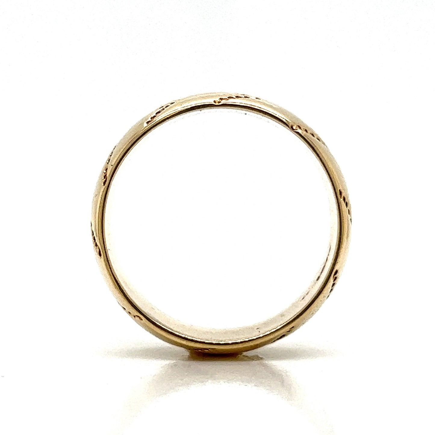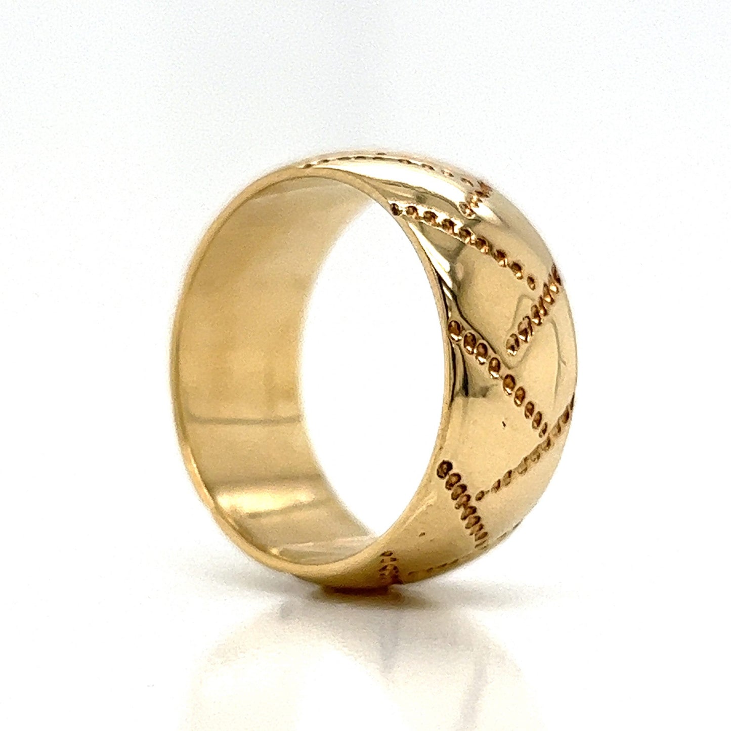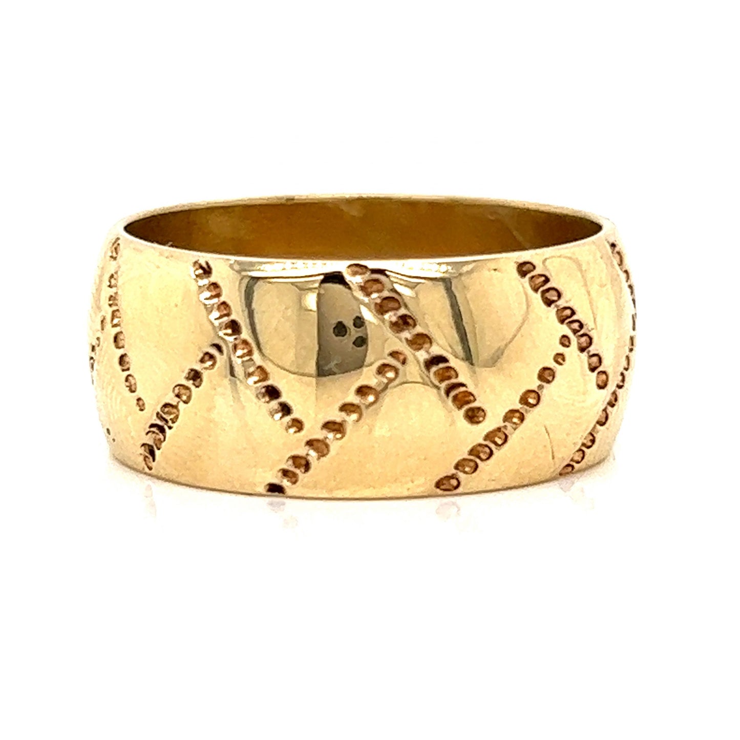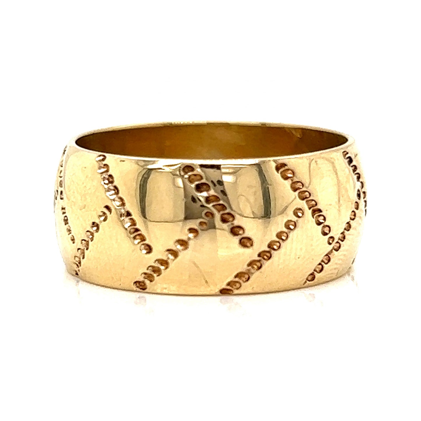 This modern men’s wedding band features a woven engraved motif in 14 karat yellow gold. The pointed engraved lines create a designer braid pattern around the entire ring. The band measures 9mm wide and weighs 8.9 grams. An expertly designed men’s wedding band with a handsome profile.