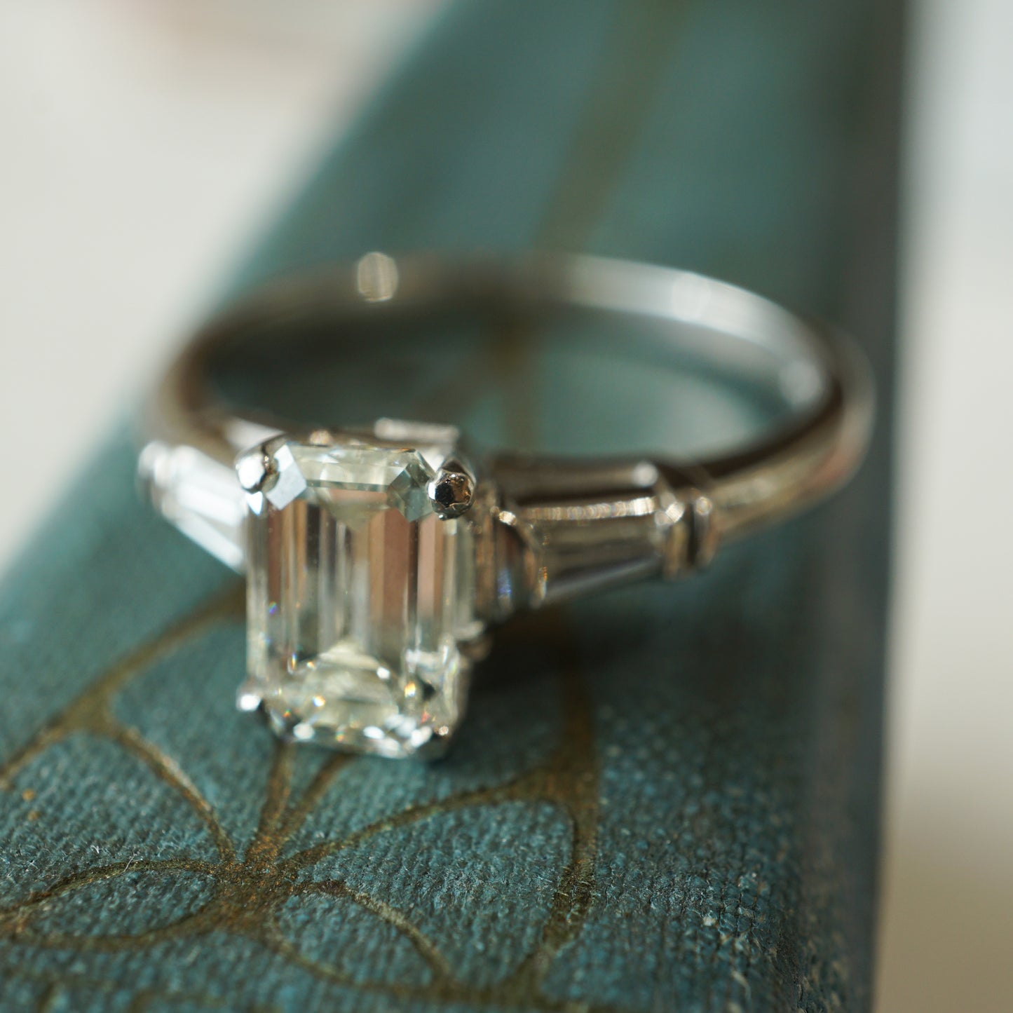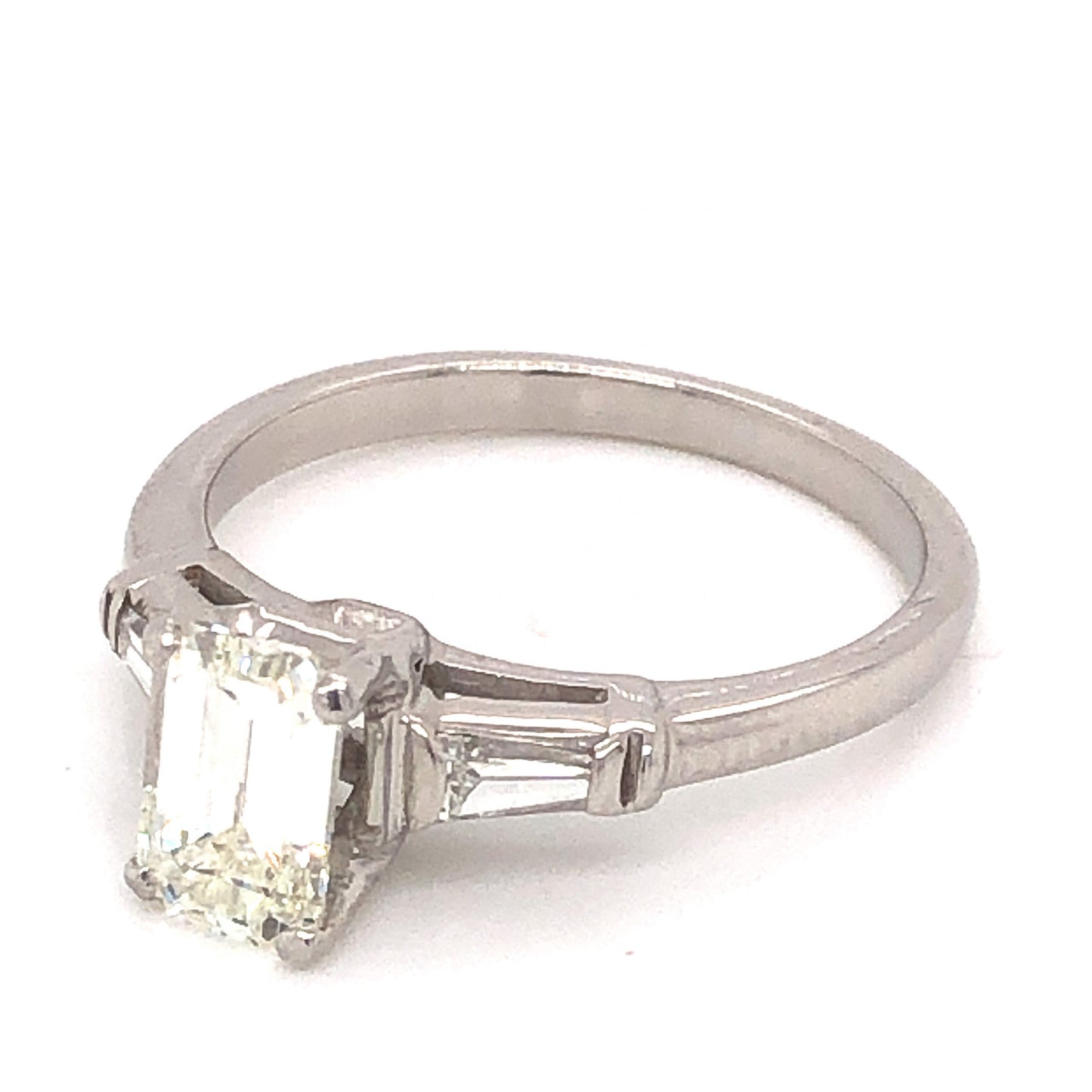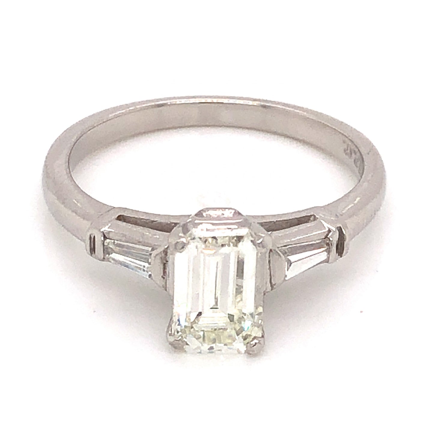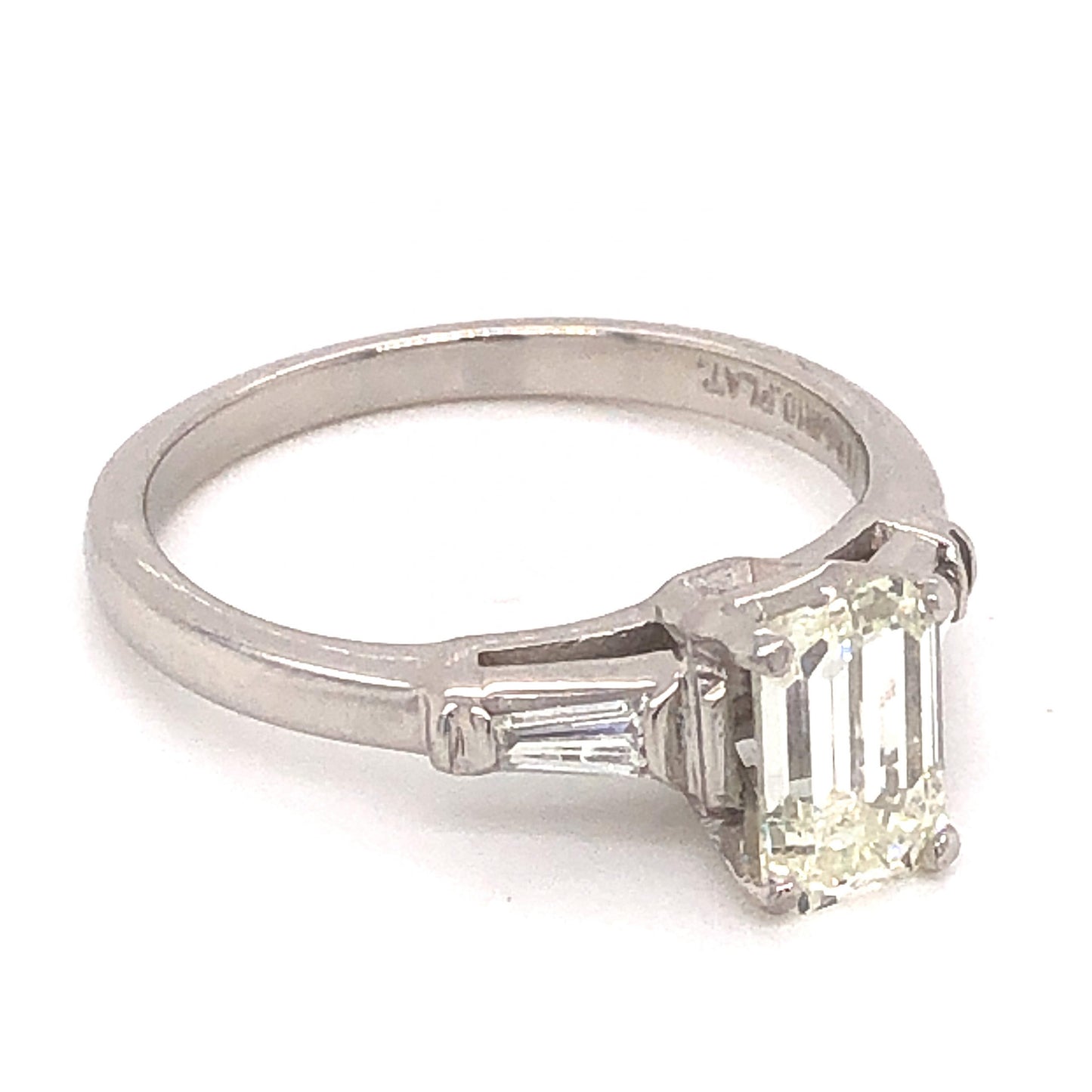 Mid-Century 1.00 GIA Diamond Engagement Ring in Platinum. This Mid-Century engagement ring features a 1.00 carat GIA-certified emerald cut diamond finished in shimmering platinum. The primary diamond has a faint warm hue and is chiseled with elongated step cuts that offer an abundant amount of brilliance. The center diamond is prong set and flanked by two (2) .09 carat diamonds on the shoulders of the band. The accent diamonds are near colorless and present an elegant contrast to the faint champagne hue of the center stone. From the profile, the gallery has a structured, stable base mounting and is finished in platinum. For a sleek and durable engagement ring with Mid-Century charm, this GIA diamond engagement ring is the one to have!
