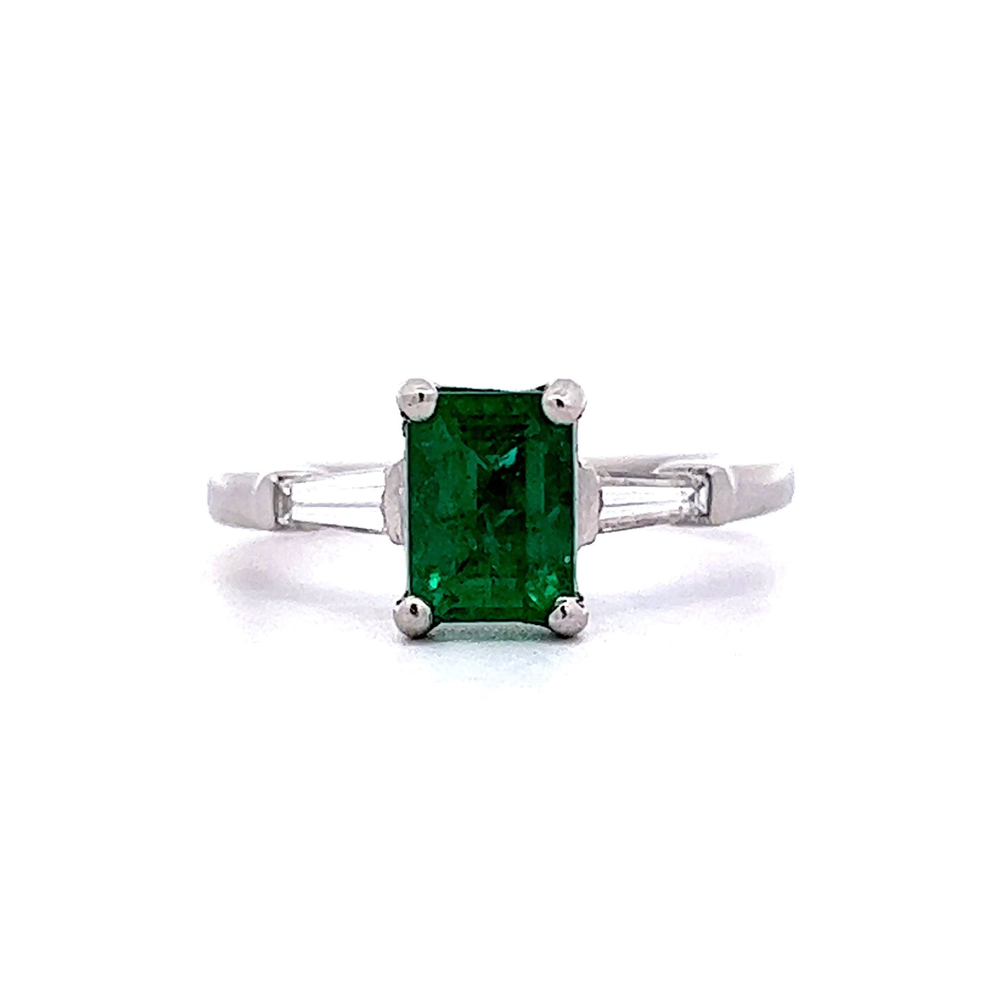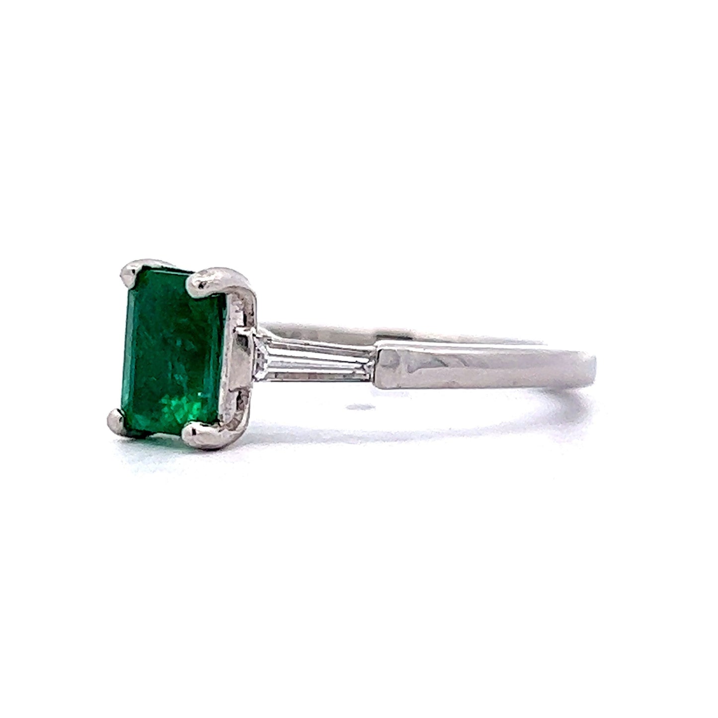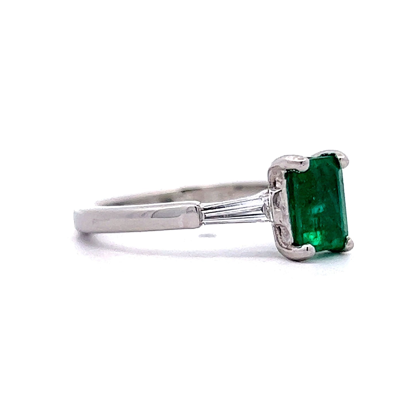 Perfect for emerald lovers! This Mid-Century engagement ring features a 1.12 carat emerald and accent diamonds in platinum. The emerald cut green emerald features a deep seafoam hue. Eye-catching colorful. Two (2) .14 carat tapered baguette diamonds flank the center gemstone. The diamonds have a near colorless color grading and add a bright sparkle to the deep green emerald. From the profile, a strong Mid-Century style basket holds the collection of gemstones finished in polished platinum.