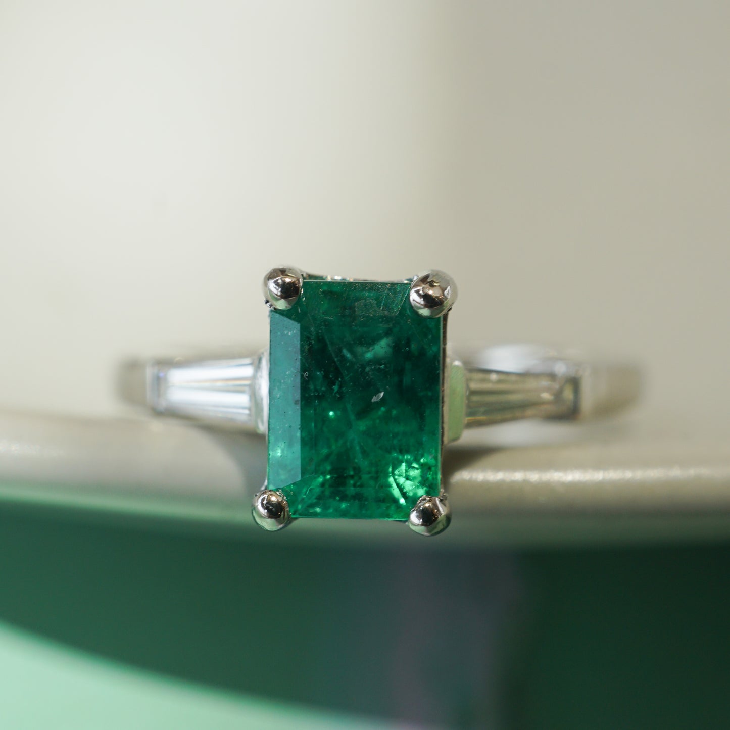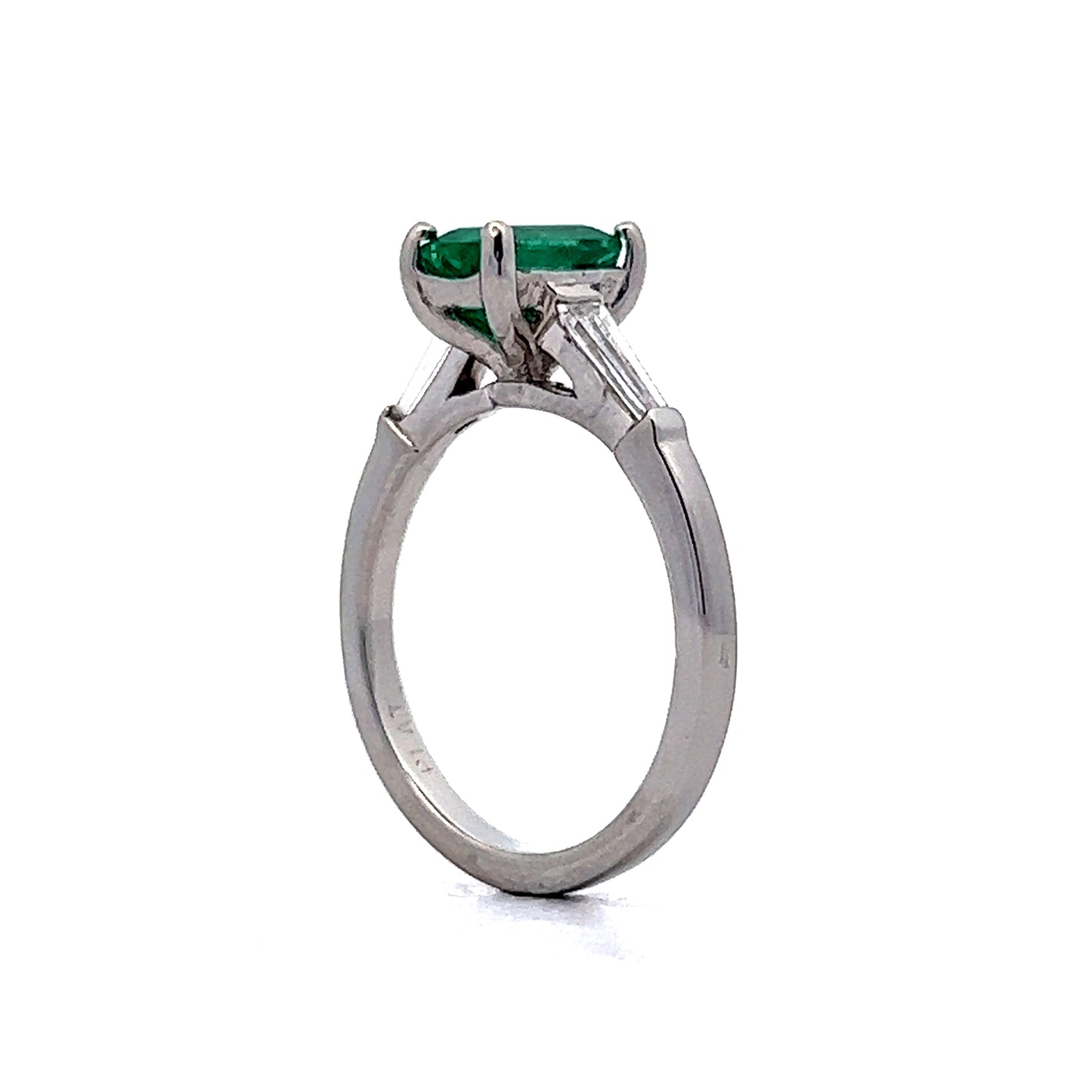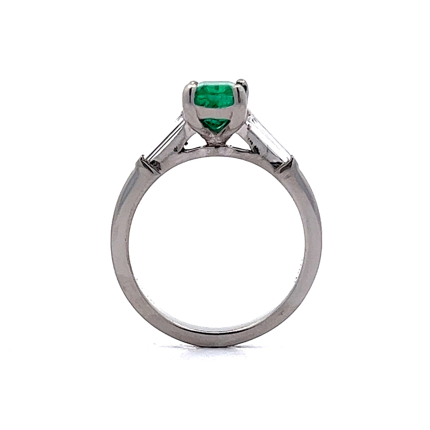 Perfect for emerald lovers! This Mid-Century engagement ring features a 1.12 carat emerald and accent diamonds in platinum. The emerald cut green emerald features a deep seafoam hue. Eye-catching colorful. Two (2) .14 carat tapered baguette diamonds flank the center gemstone. The diamonds have a near colorless color grading and add a bright sparkle to the deep green emerald. From the profile, a strong Mid-Century style basket holds the collection of gemstones finished in polished platinum.