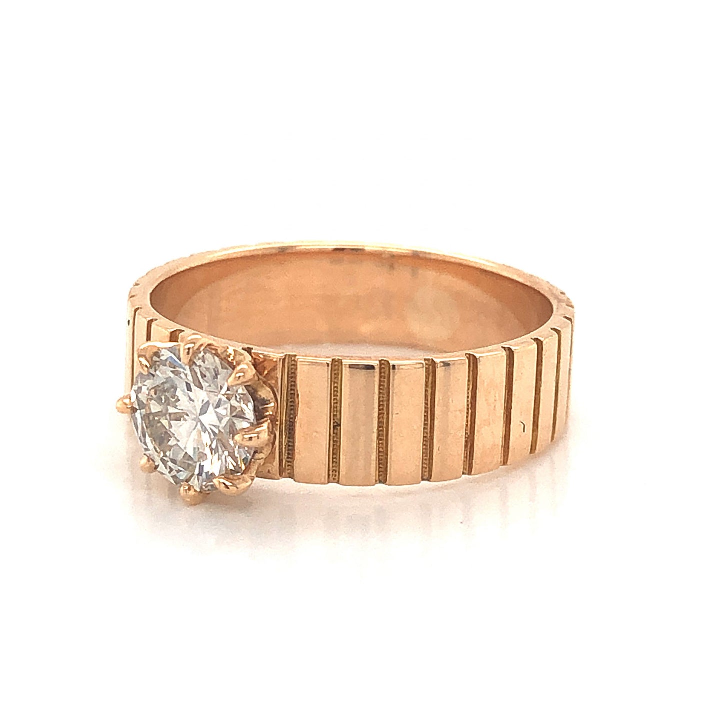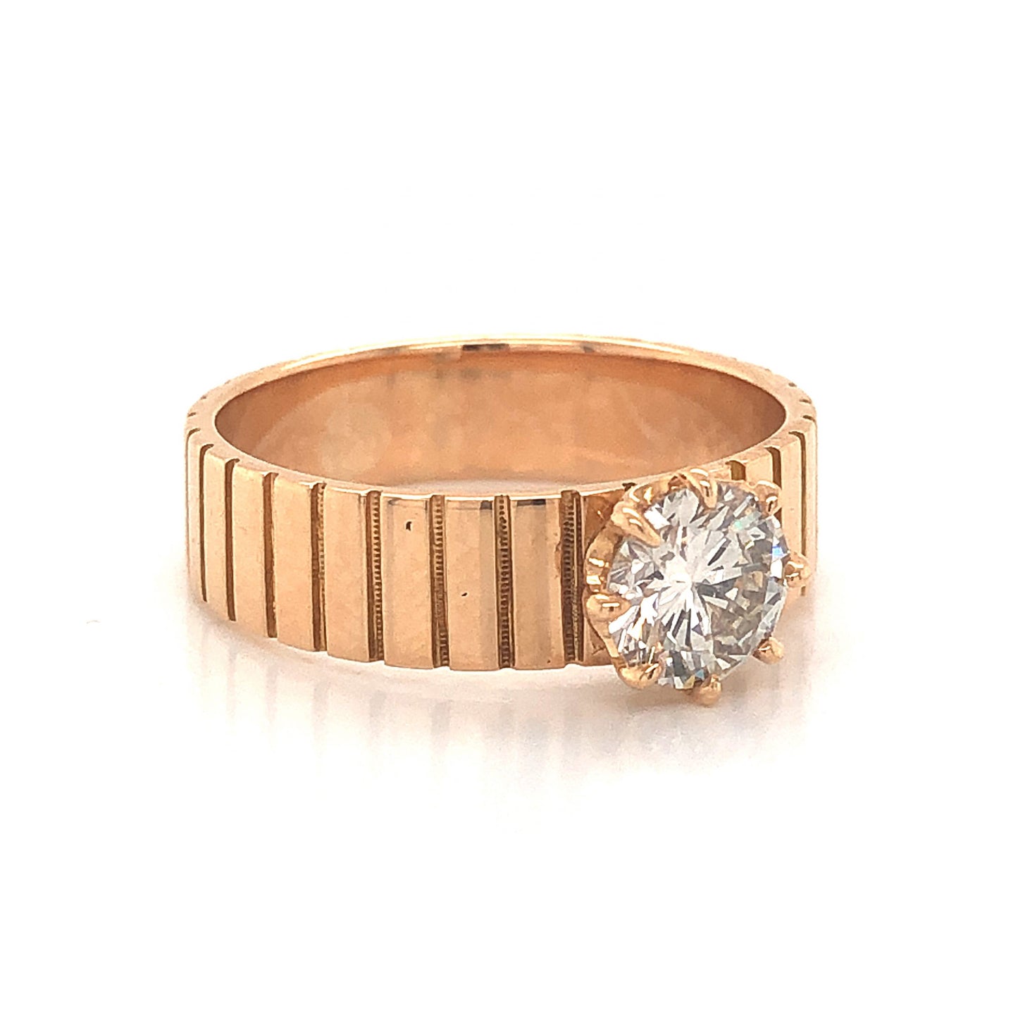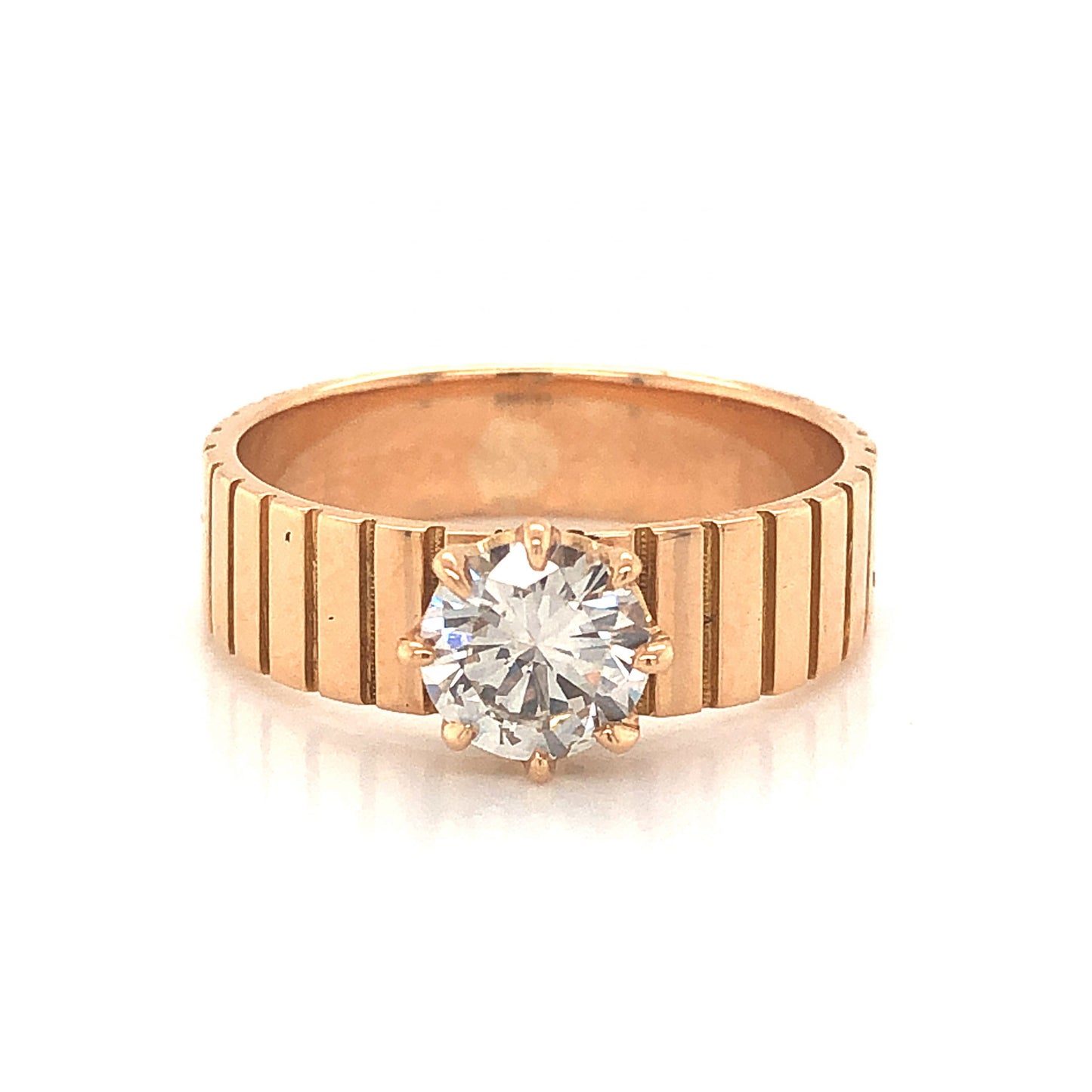 This stylish Mid-Century solitaire engagement ring features a .70 carat Round Brilliant cut diamond in 14 karat yellow gold. The eye clean white diamond is set in eight (8) prongs and is cut for maximum brilliance and fire. The band measures 4.87mm wide and features striped engravings around its flat profile. This ring is fashionable, easy to stack with any style of wedding band and is truly one of a kind!