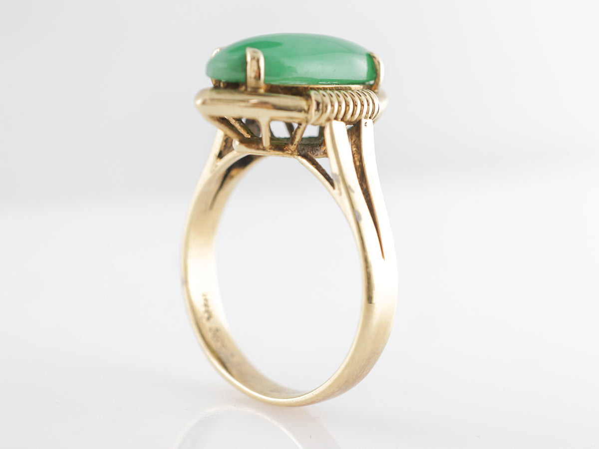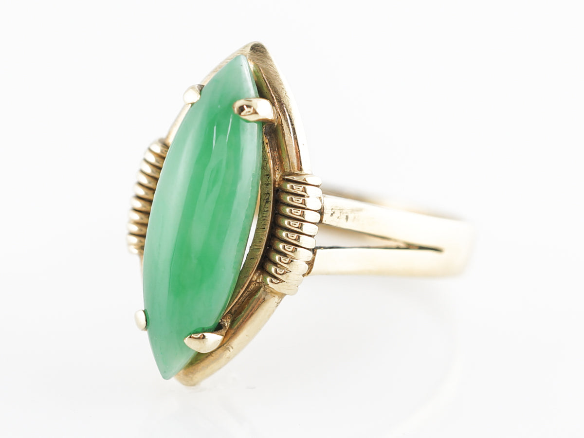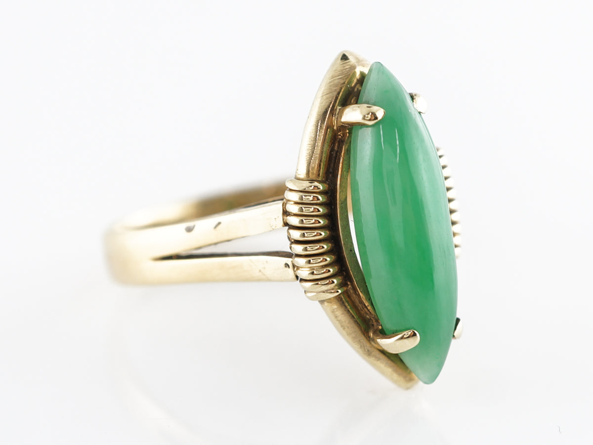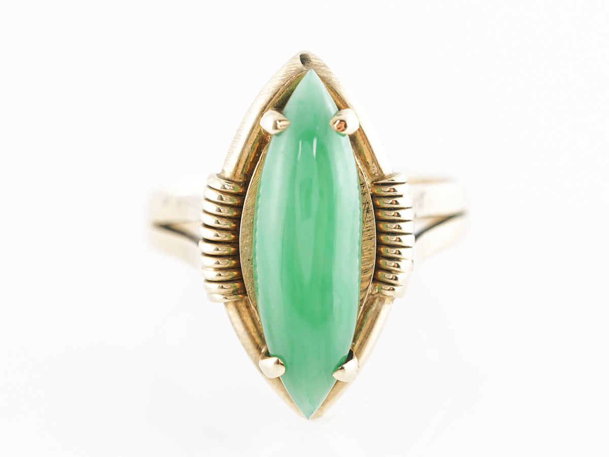 Mid-Century Cabochon Jadeite Cocktail Ring in 14k. This fabulous Mid-Century cocktail ring features a smooth marquise shaped green jadeite set in 14 karat yellow gold. The mounting is very unique with prongs holding the gemstone, and slightly below a golden border outlines the stone and is wrapped in a few wires at the shoulders. From the side profile the ring sits very high, for a prominent and memorable ring!