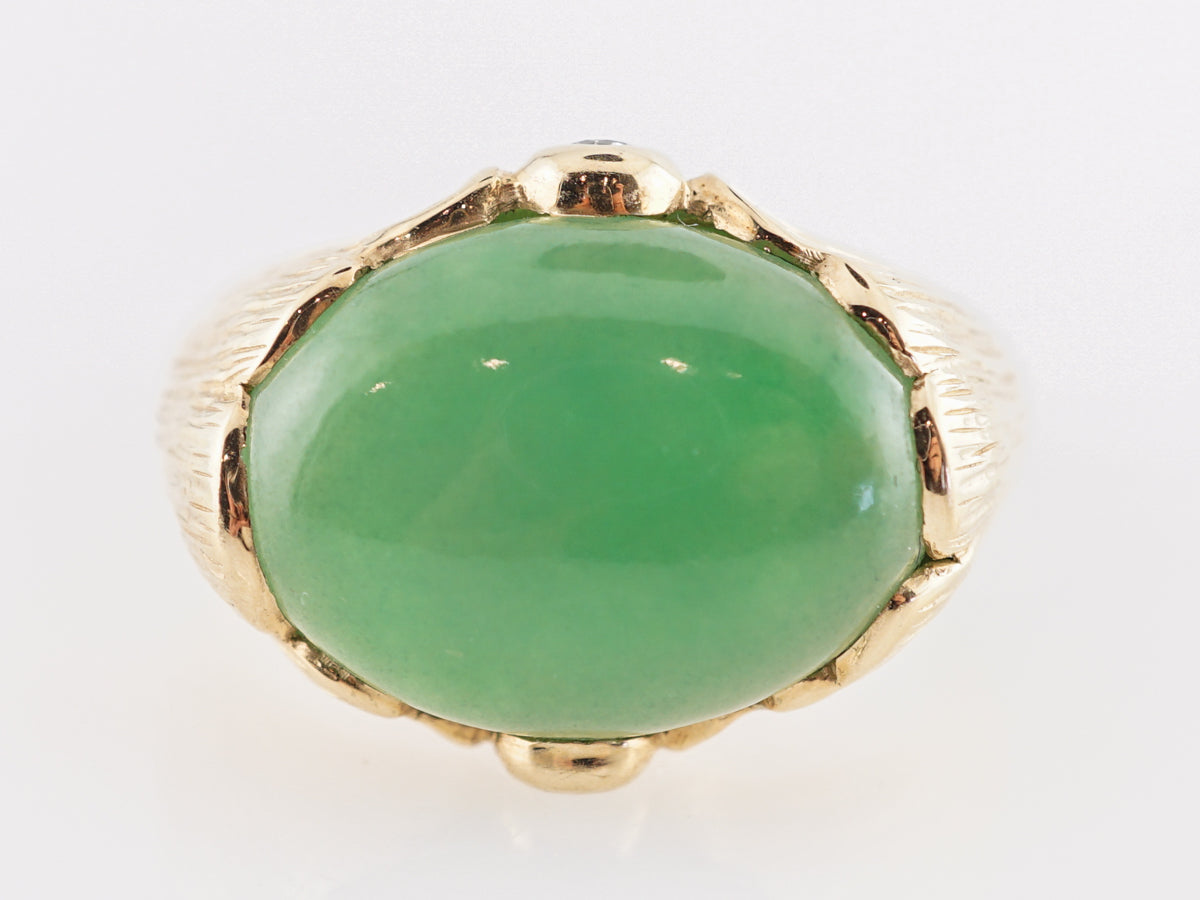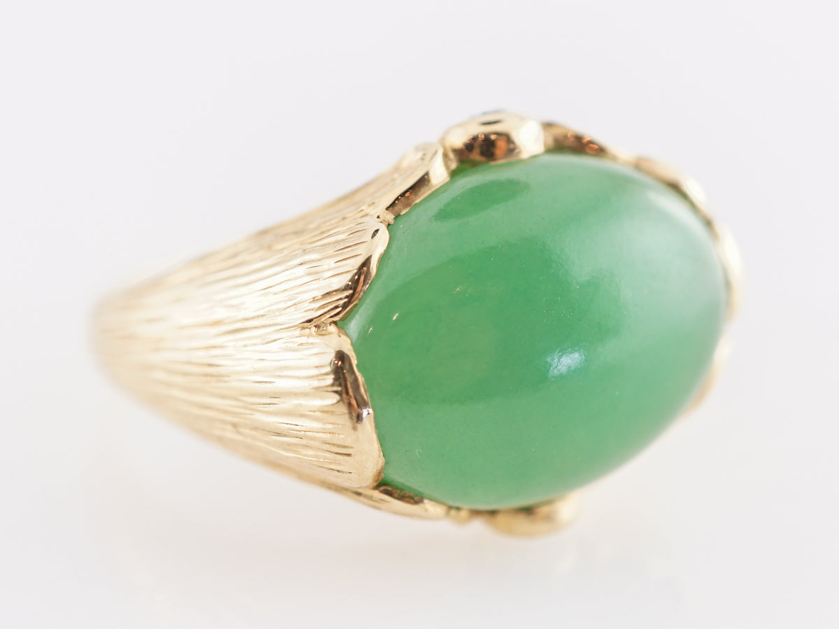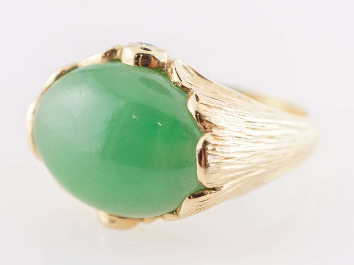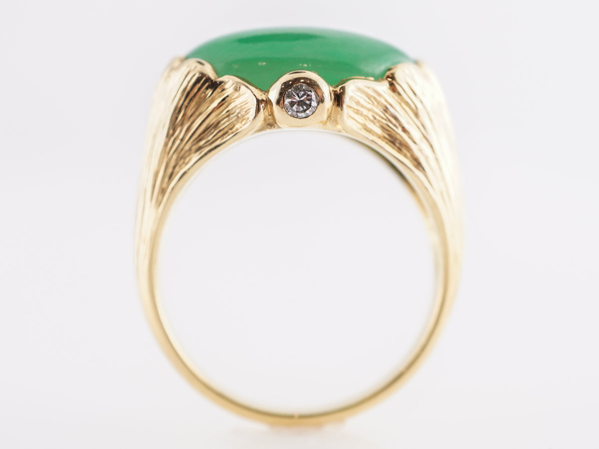 Mid-Century Chrysophase Cocktail Ring in 18k Yellow Gold. This chic Mid-Century cocktail ring features an opaque, 6.86 carat chrysoprase stone in 18k yellow gold. The tone of the natural chrysoprase is soft fern green. The polished cabochon cut gem rests in a setting of 18k yellow gold. The embellishments of the ring resemble wide petals with complementing accent diamonds at each side of the gallery. The two accent diamonds weigh .04ct each. The petite diamonds have a soft warmth to them that create the total package for this treasured piece of jewelry. Created in the Mid-Century Era from the 1940s 1960s, this cocktail ring is a fashion-forward piece of vintage jewelry!
