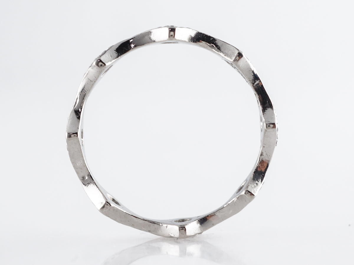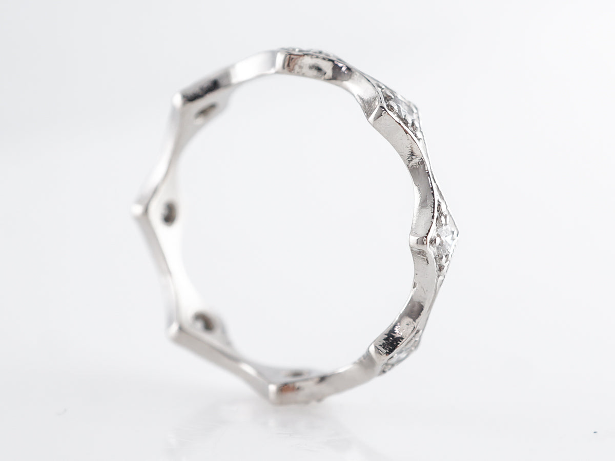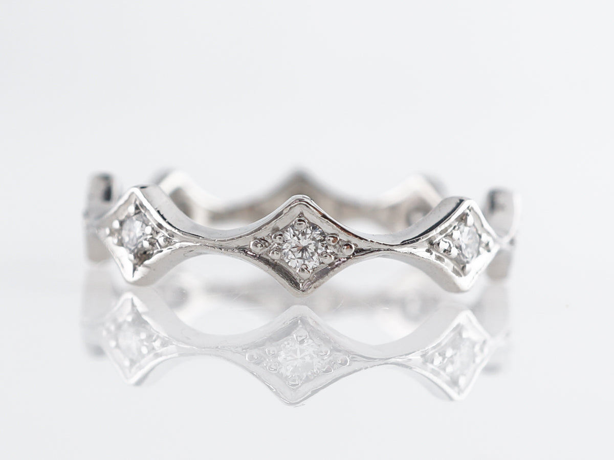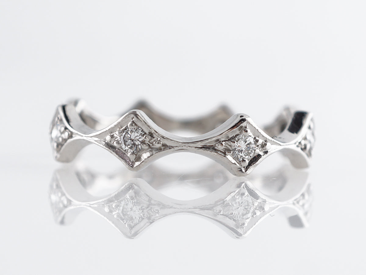 Mid-Century Diamond Eternity Ring in Platinum. This Mid-Century platinum and diamond band features a peaked scalloped edge bead set with round brilliant diamonds. The diamond eternity band is set with eight (8) round brilliant diamonds with a total weight of .16 carats. The platinum is finished in a high polish. When stacked with other rings this diamond band creates a negative space between the rings creating a very interesting design.