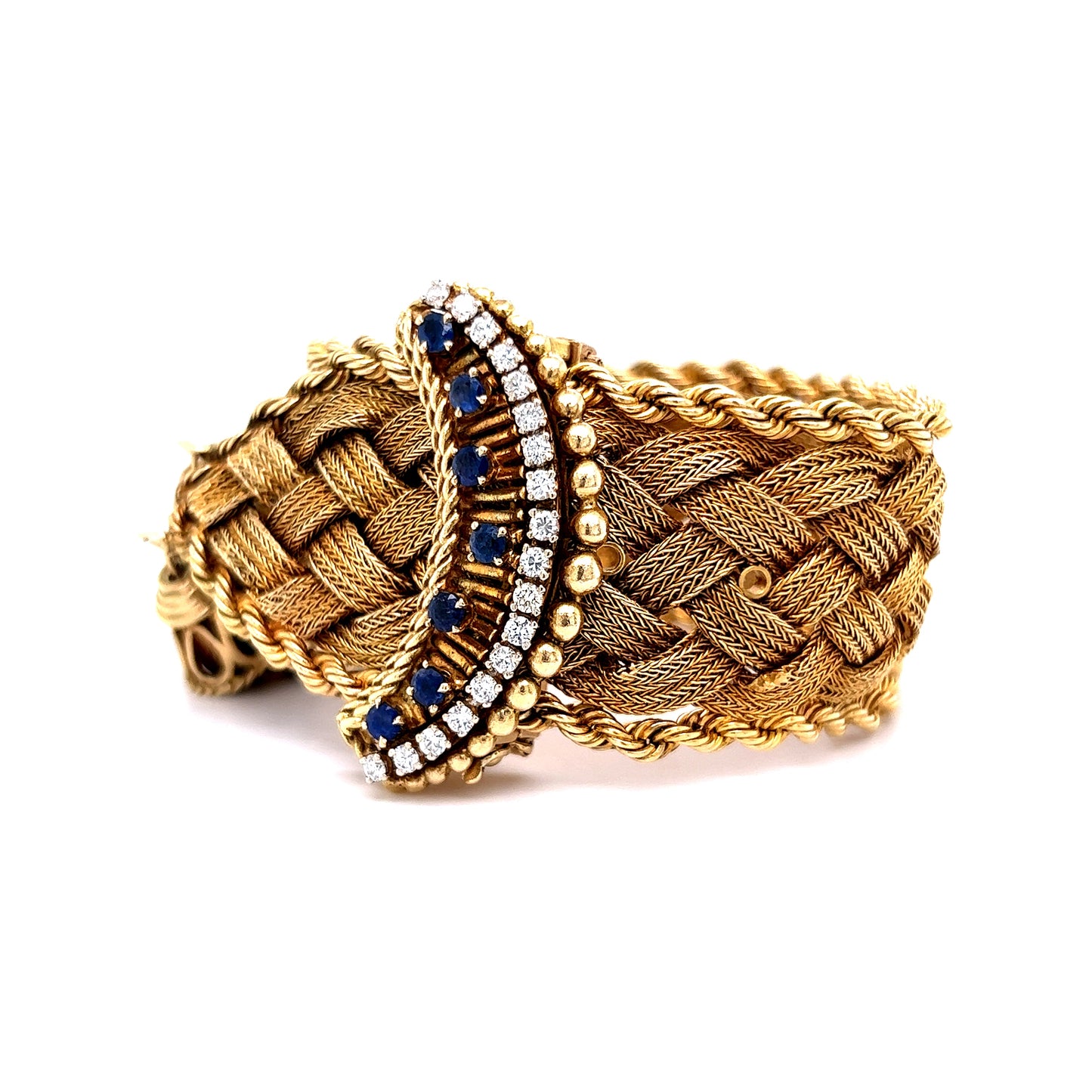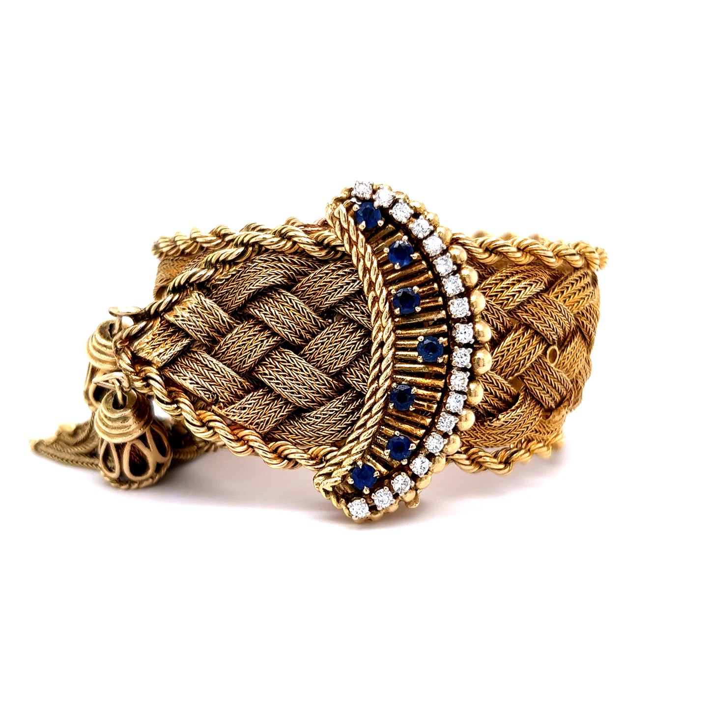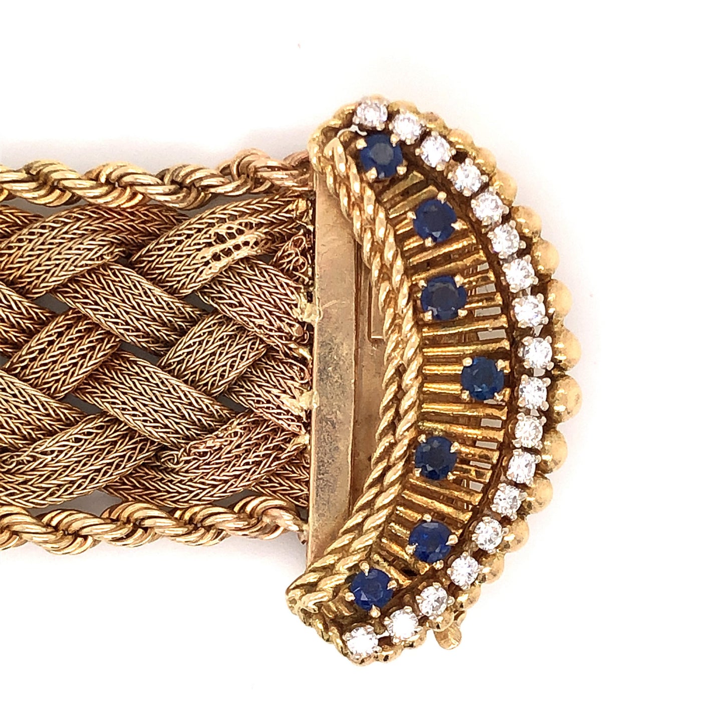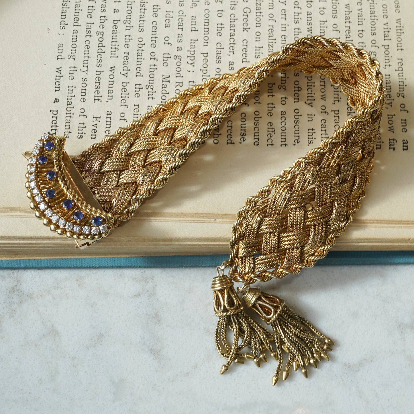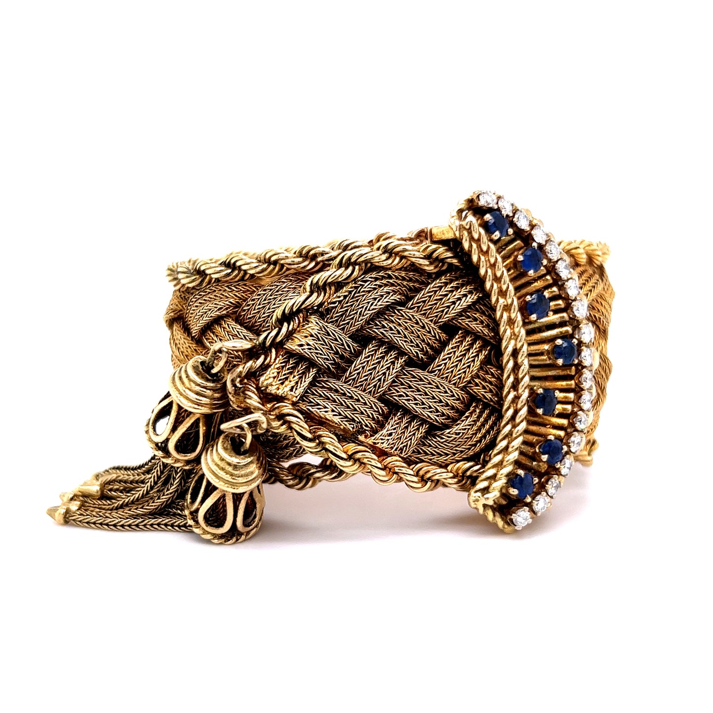 Mid-Century Diamond Sapphire Bracelet in 14k Yellow Gold. This Mid-Century braided bracelet features .63 carats of diamonds and .49 carats of sapphires finished in 14 karat yellow gold. Eighteen (18) .035 carat diamonds and seven (7) .07 carat sapphires accent the clasp of the bracelet. The braided structure of the bracelet is 1 wide by 9 long. Two yellow gold tassels finish the bracelet creating a unique, dangle accent. A magical piece of Mid-Century jewelry!