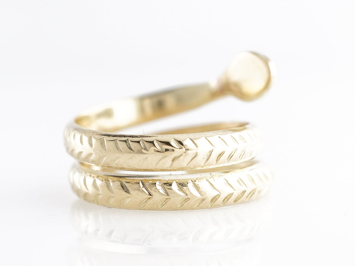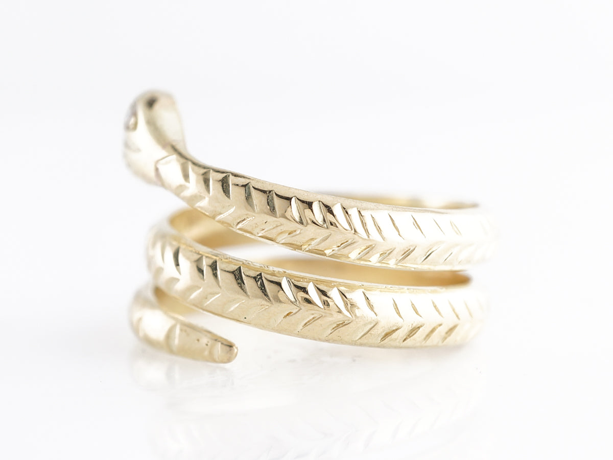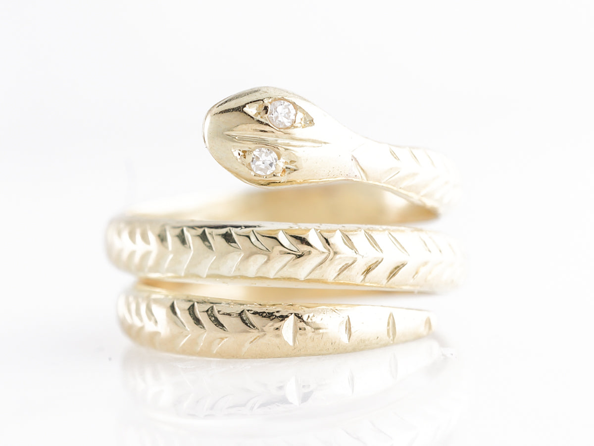 This Mid-Century snake ring has two (2) .03 carat diamonds for eyes and is set in 14 karat yellow gold. The snake is brought to life by delicate carvings that imitate scales down the body that wraps around the finger multiple times. The snake ring has been a popular stay in fine jewelry for hundreds of years and this one is bright and fun!