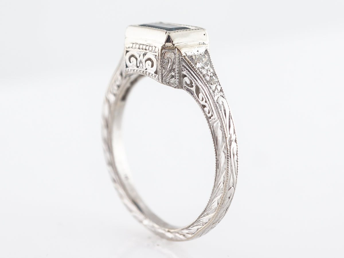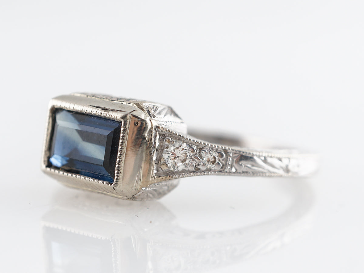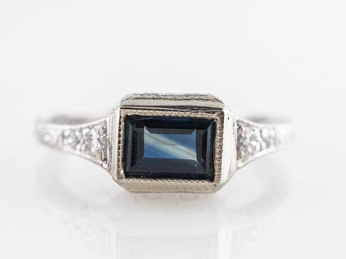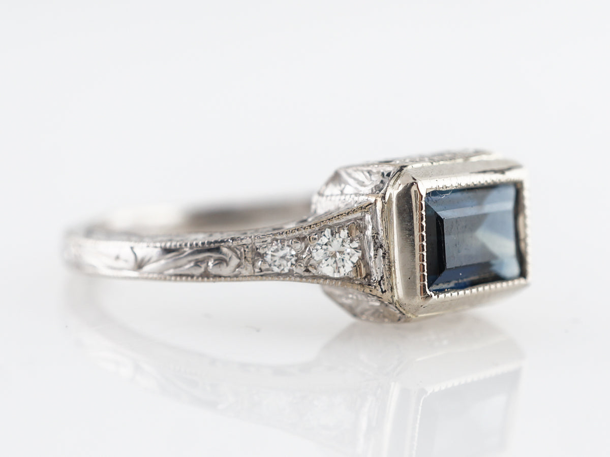 Mid-Century Emerald Cut Sapphire Ring with Diamond in 18K. This magnificent Mid-Century ring features a 1.03 carat emerald cut sapphire with diamond accents in 18 karat white gold. The sapphire is bezel set with milgrain detail and tapers just so slightly down to the shank with more milgrain holding the pave accent diamonds. The amazing cobalt blue of this vintage sapphire is a real sight to behold.