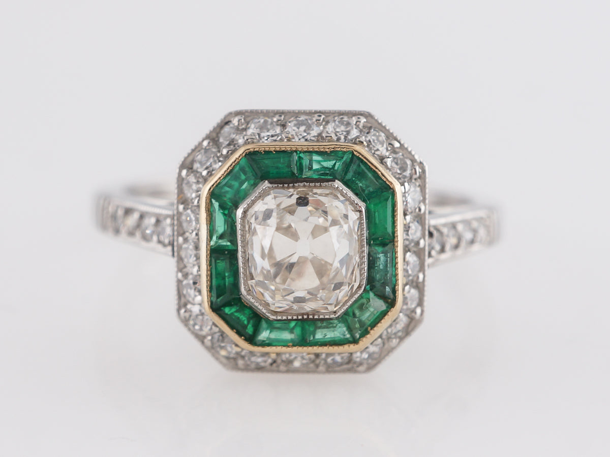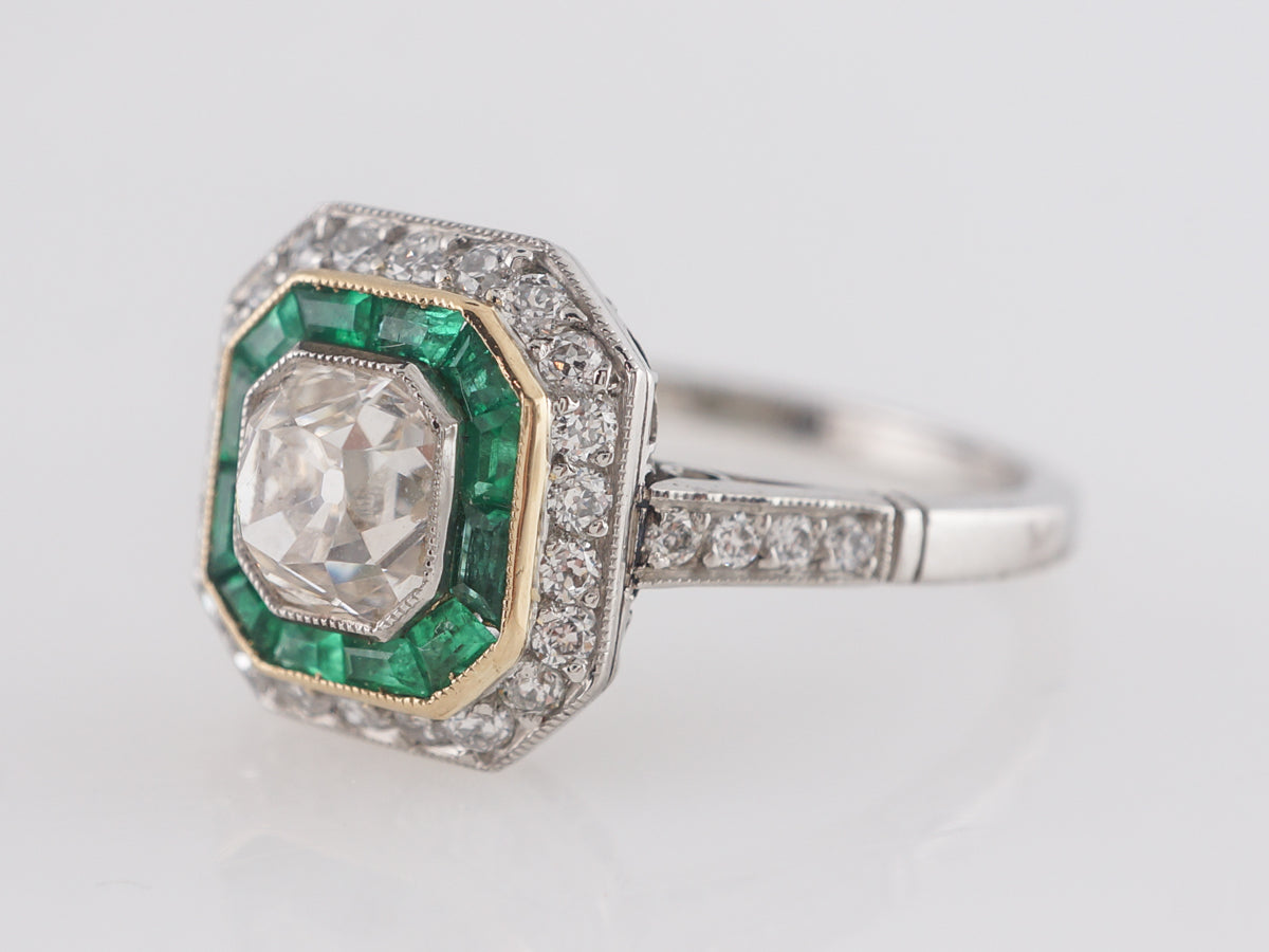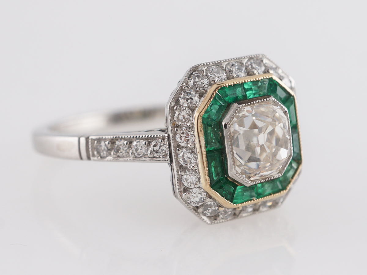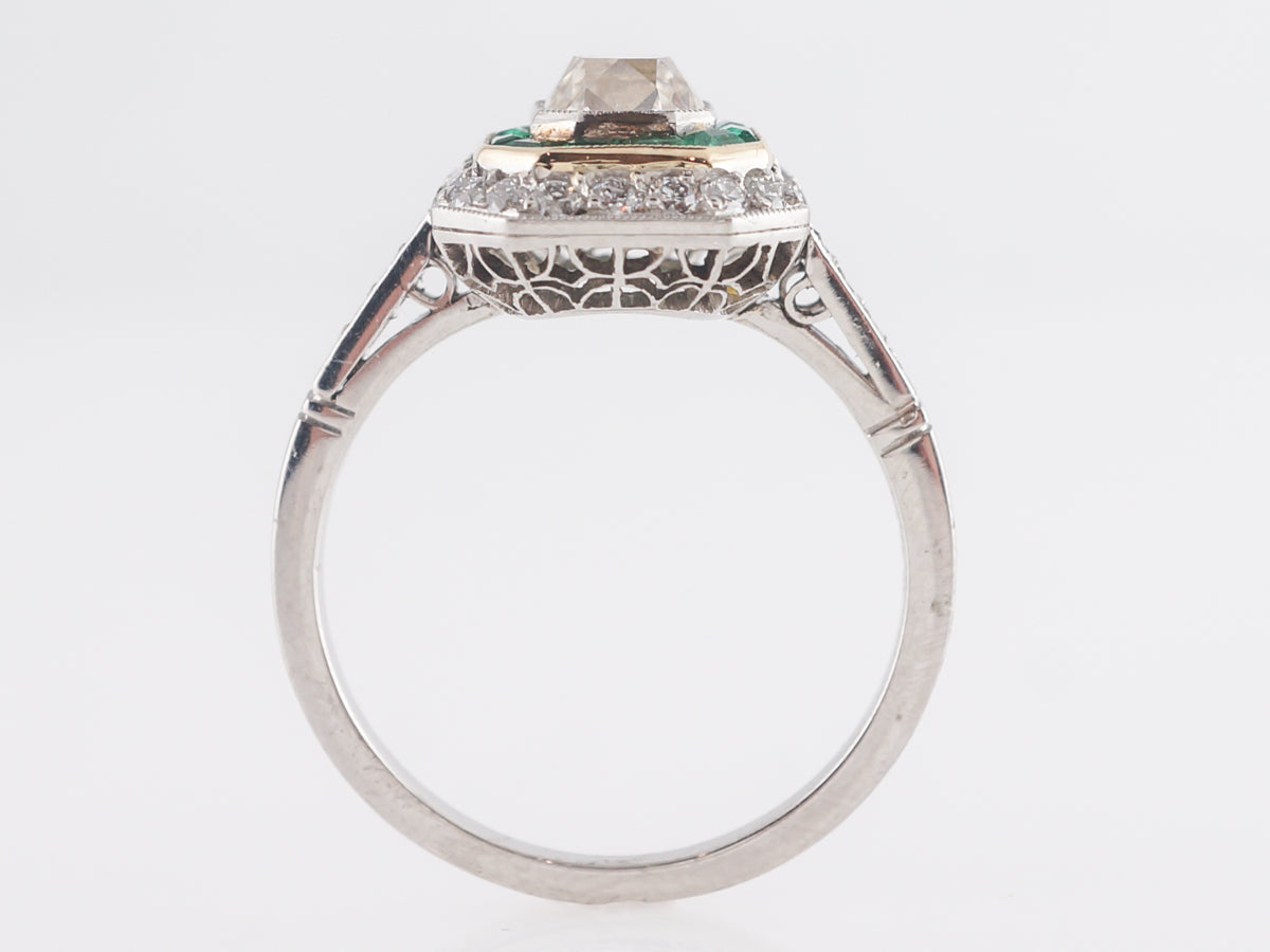Mid-Century Emerald Diamond Ring in 18k Yellow Gold and Platinum. This lovely Mid-Century ring is a perfect item for the season. The primary stone is a .79ct genuine natural diamond, surrounded by layers of natural emerald and additional diamonds that drip halfway around the shimmering platinum band. Total diamond weight = 1.34ct. From the profile, the Mid-Century design incorporates a mesmerizing decorative pattern in platinum, underneath a yellow gold layer that holds the .80 emerald and featured primary diamond. A treasure for any engagement!