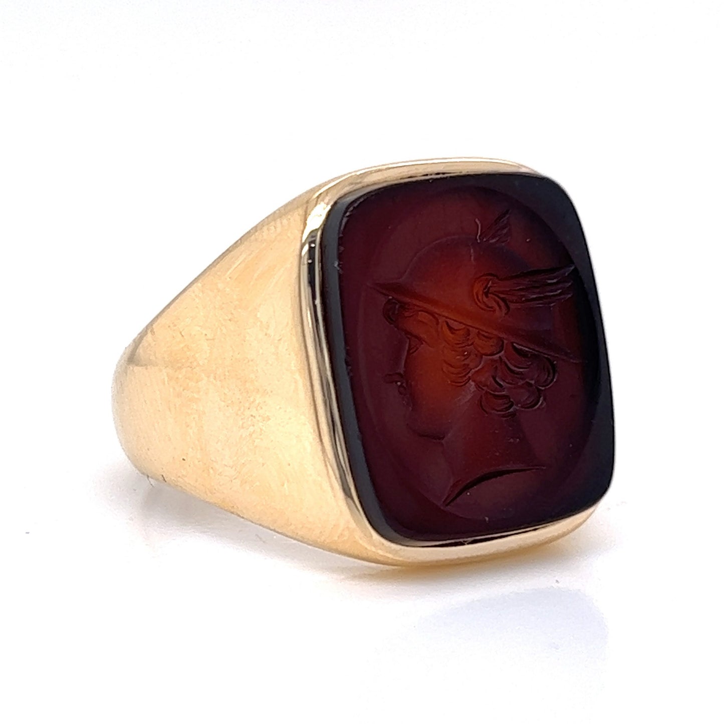 This rare Mid-Century men’s ring features an engraved red sardonyx set in 14 karat yellow gold. Also known as an Intaglio ring, this style of jewelry can originated as far back as 5000 BC and often depicts Neoclassical impressions of warriors and emperors. This Mid-Century right hand ring features a deep Vermillion hue. A brother to Cameo jewelry. The red gemstone is bezel set on a thick 14 karat yellow gold band. Perfect for lovers of Signet Rings!
