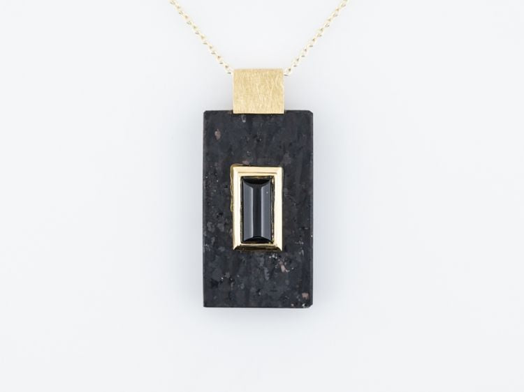 This vintage mid-century pendant is a mix of textures, colors, gemstones, gold and stone creating a very modernist design. The rectangular slate piece creates a bold backdrop for the sugar loaf cabochon onyx piece framed in a high polish 14-karat yellow gold bezel. The slate piece measures .75 inches in width and just under an inch in length. Currently the pendant is being sold with a 14 karat 24 inch cable chain. The gold brush finished bail can accommodate a larger chain or any alternative necklace that measures under 4 mm in thickness.