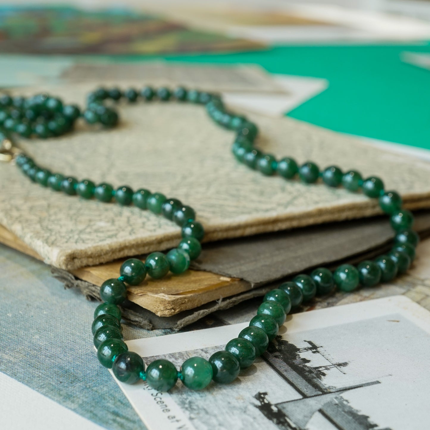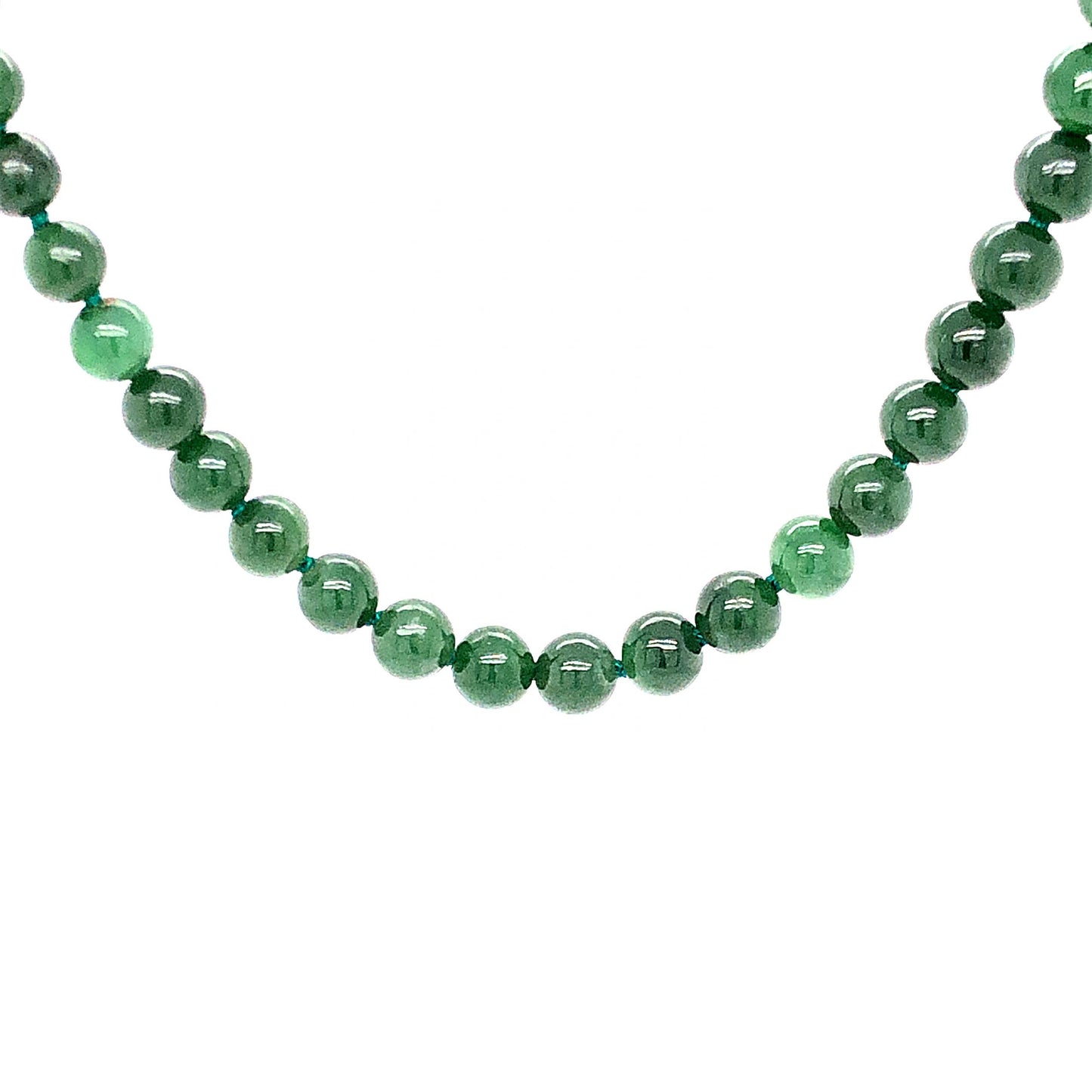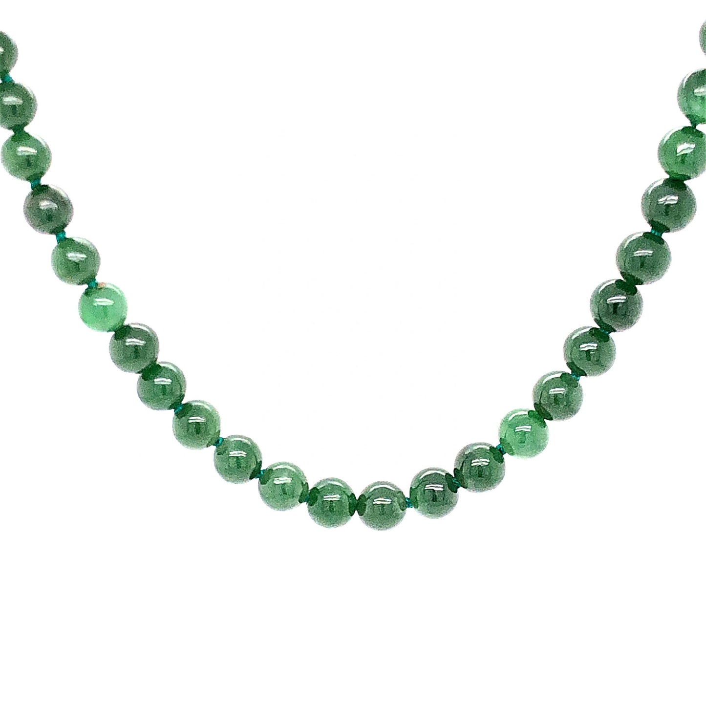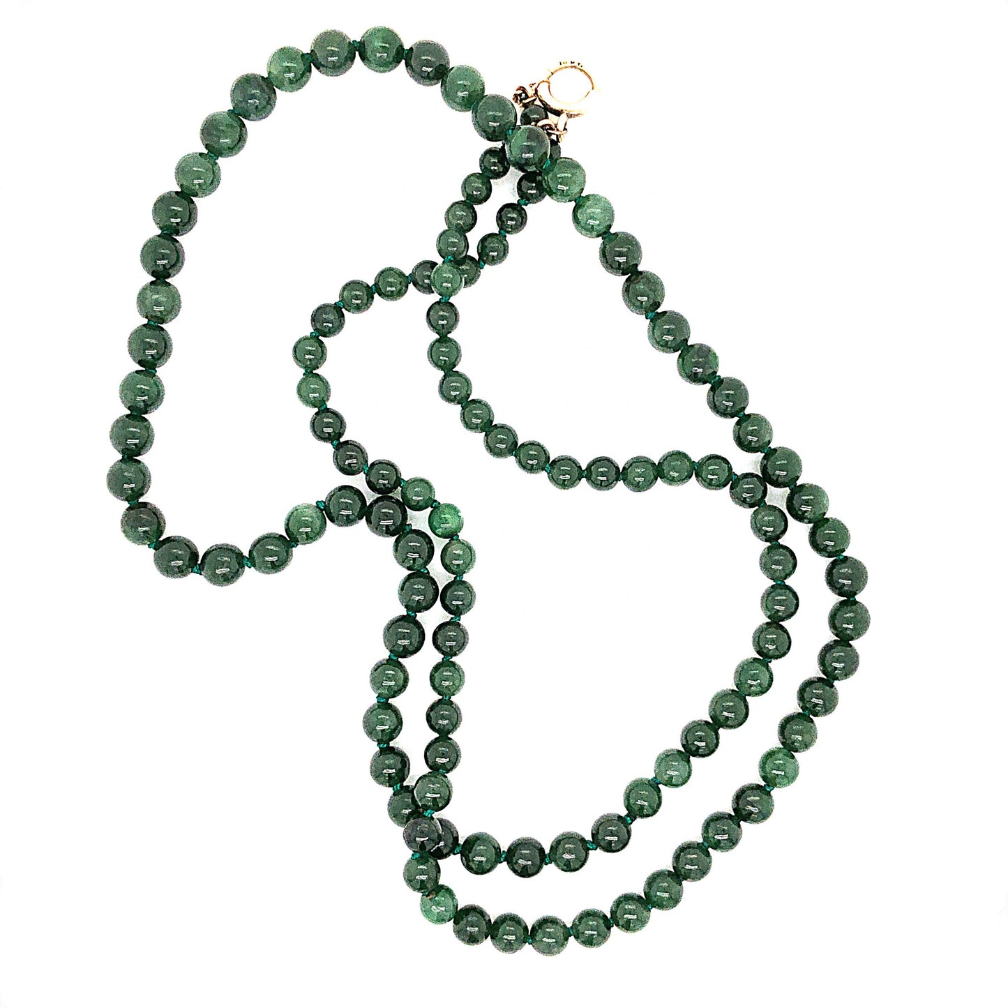 Mid-Century Nephrite Beaded Necklace with 14K Gold Clasp. This Mid-Century beaded necklace features a string of one-hundred sixteen (116) green nephrite jades and a 14 karat yellow gold clasp. Measuring 26” in length, each nephrite jade stone on this necklace features a spectrum of dark green to classic jade green hues. The cool green tone of the nephrites is then finished with a lovely 14k yellow gold clasp. A worldly necklace with down-to-earth style!