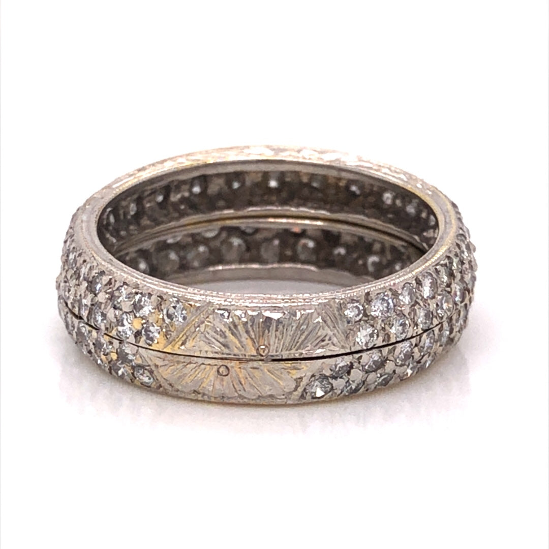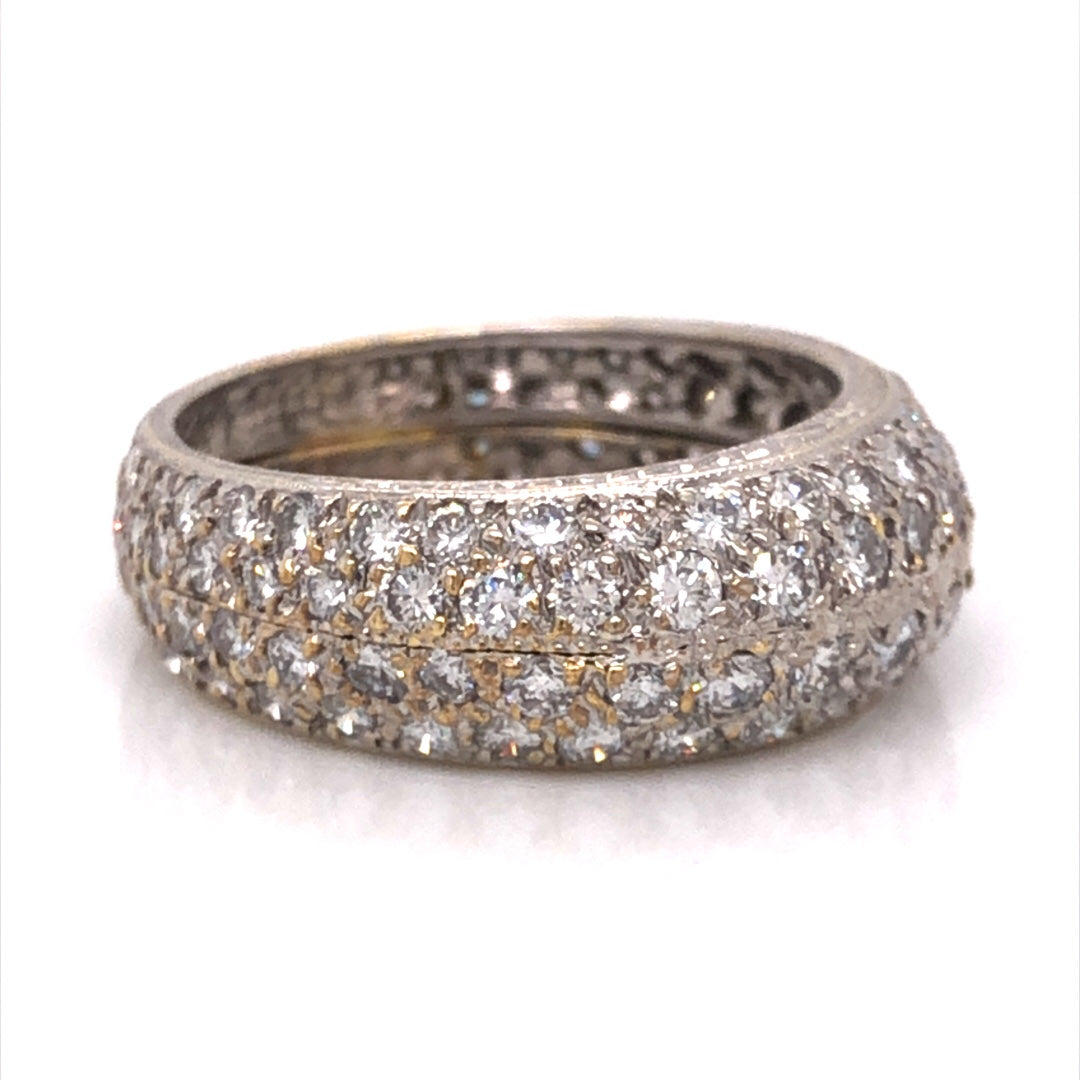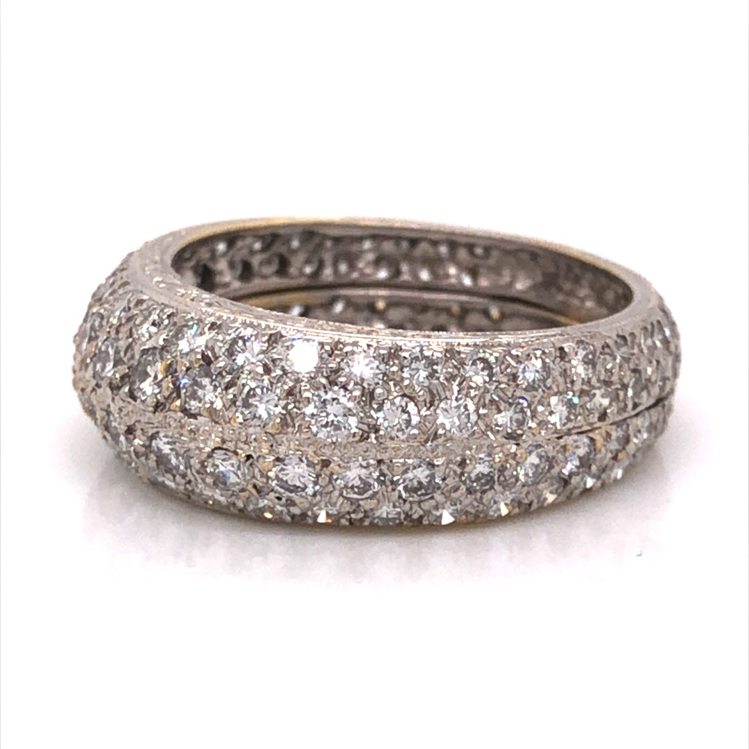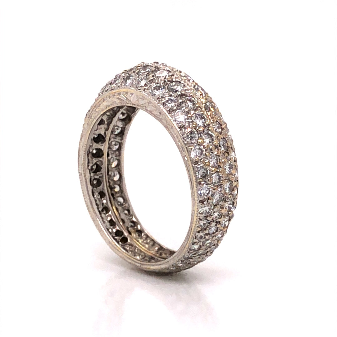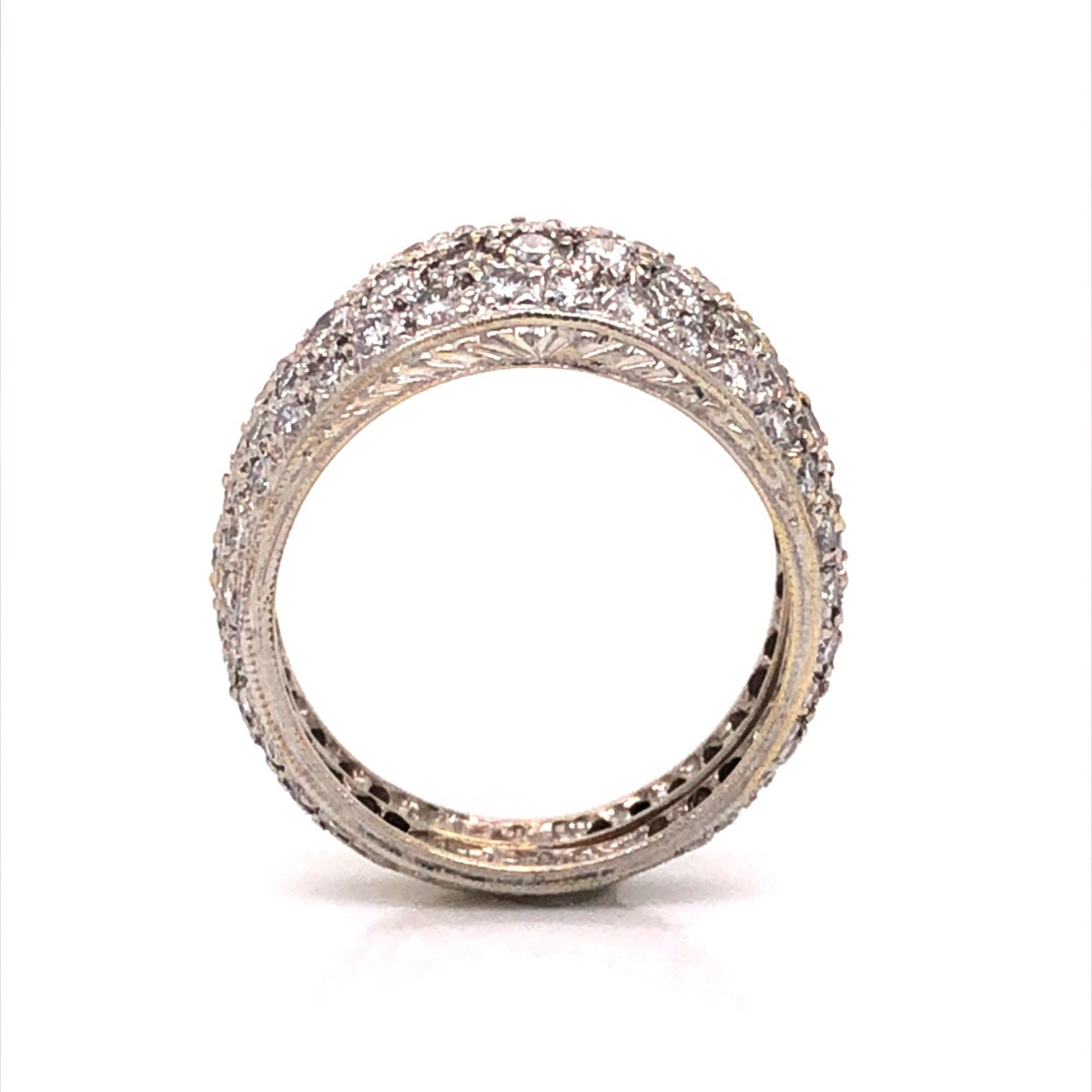 A Mid-Century treasure! This one of a kind vintage diamond cocktail ring features a pave of Round Brilliant cut diamonds in 18 karat white gold. The collection of sparkling diamonds, totaling 2.08 carats, reflect sparkle and light on the sculptural ring. Fashionable flower engravings decorate the center of the band. Complete with an engraved shank edge. This right hand cocktail ring will dazzle you for years to come!