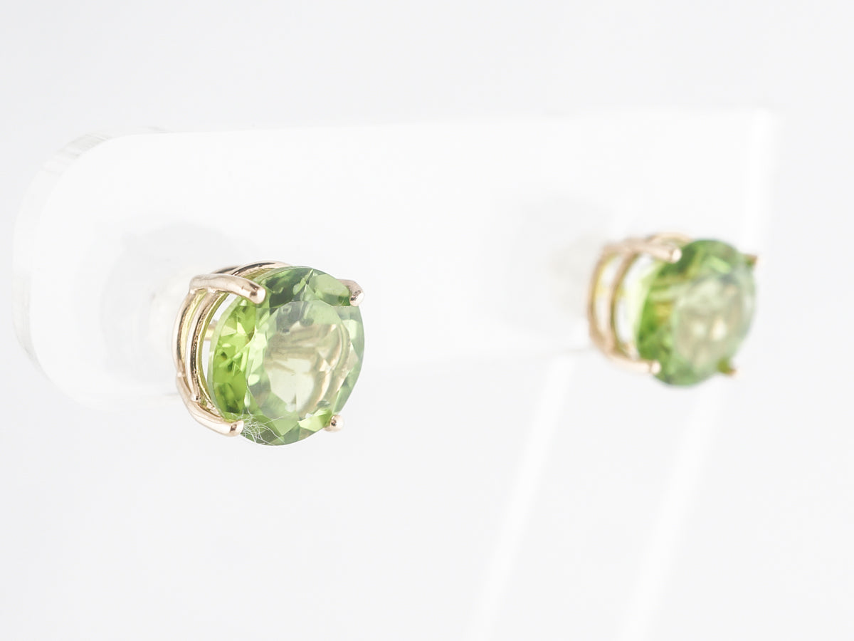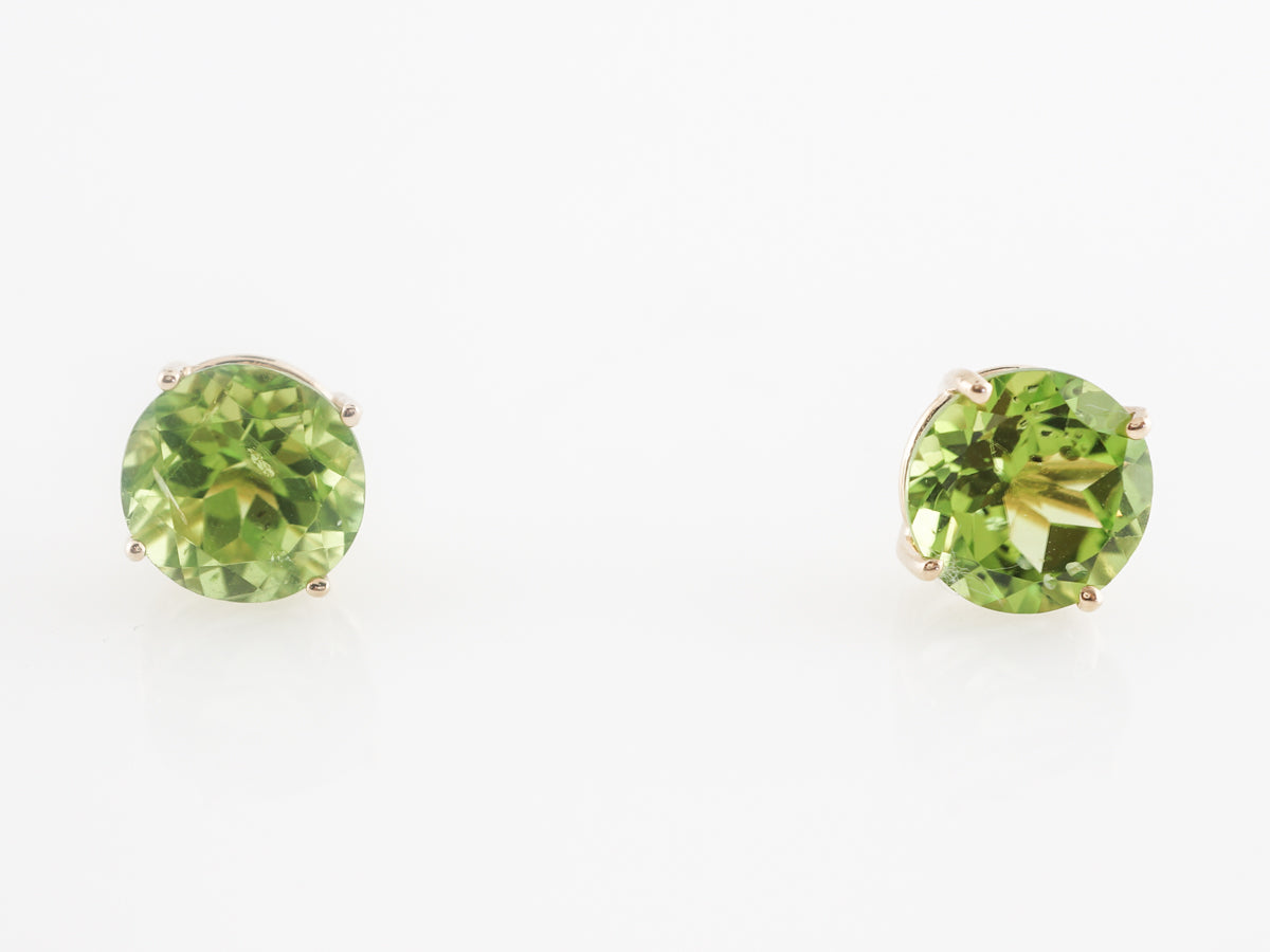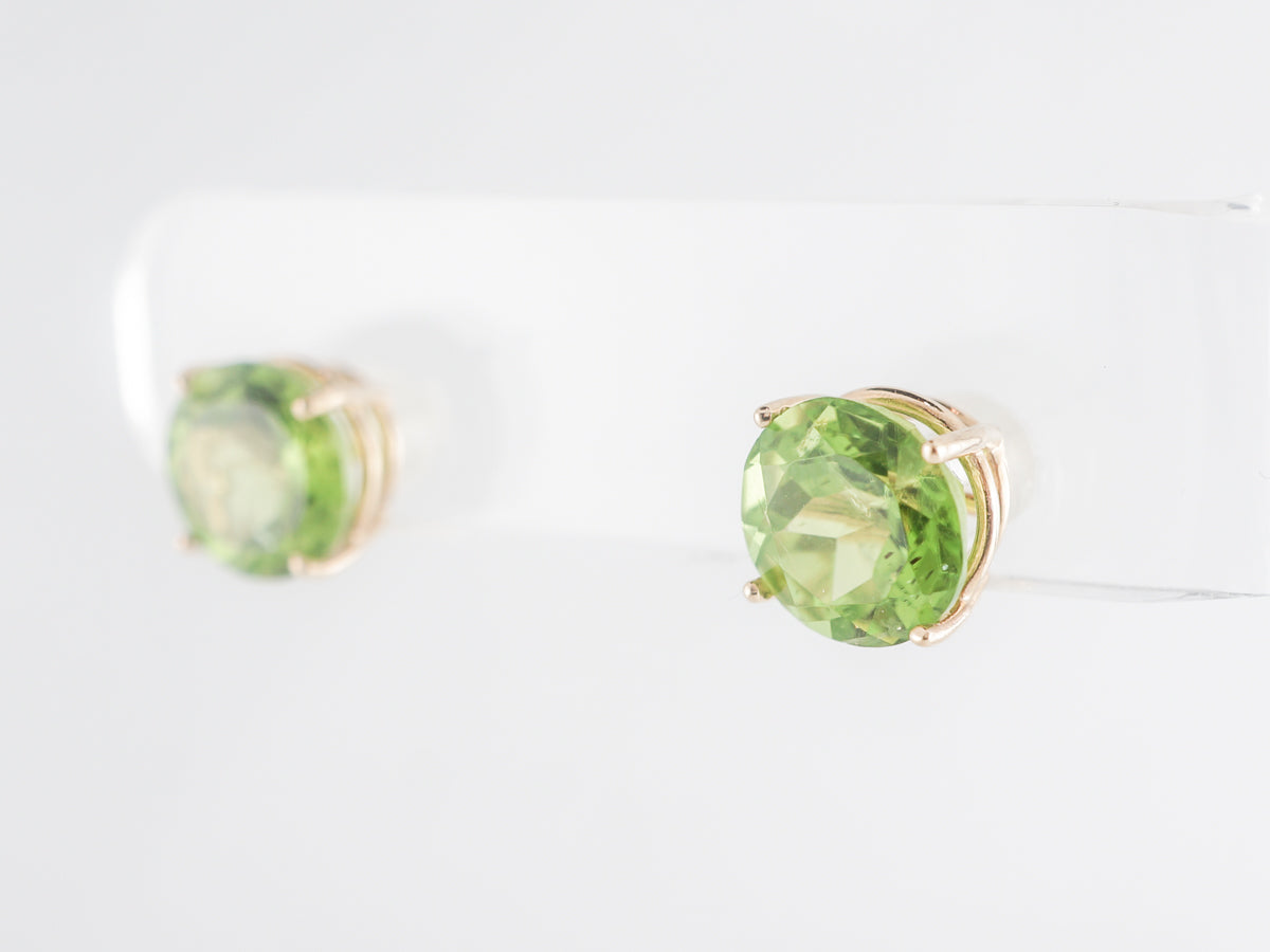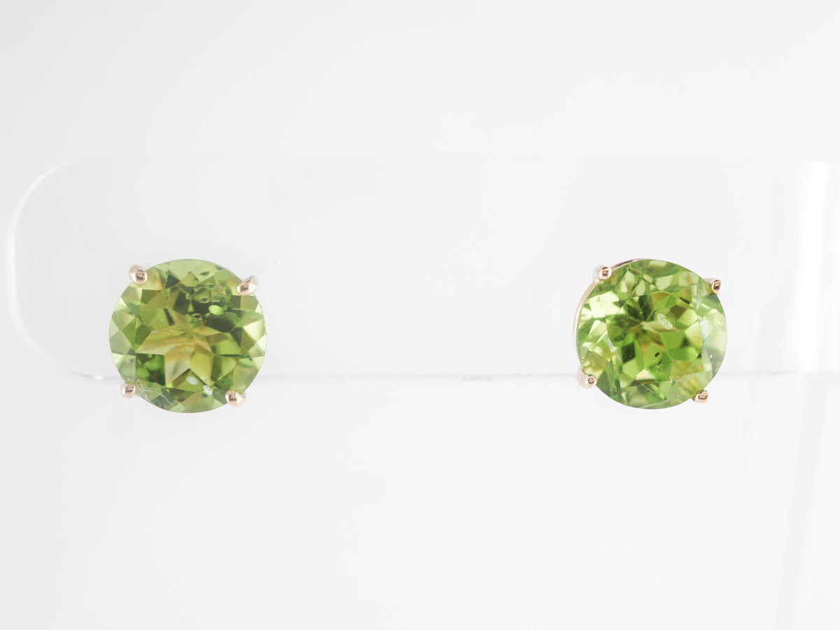 Mid-Century Peridot Earring Studs 14K Yellow Gold. These Mid-Century stud earrings feature 9.02 carats of round cut peridot set in 14 karat yellow gold. The gemstones are set with four (4) prongs each and have an incredible light green color. Every jewelry collection should have a set of stud earrings, and these have an impressive size and lovely color!