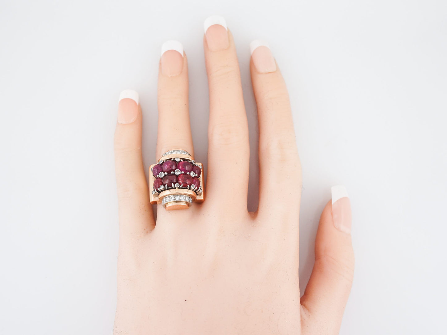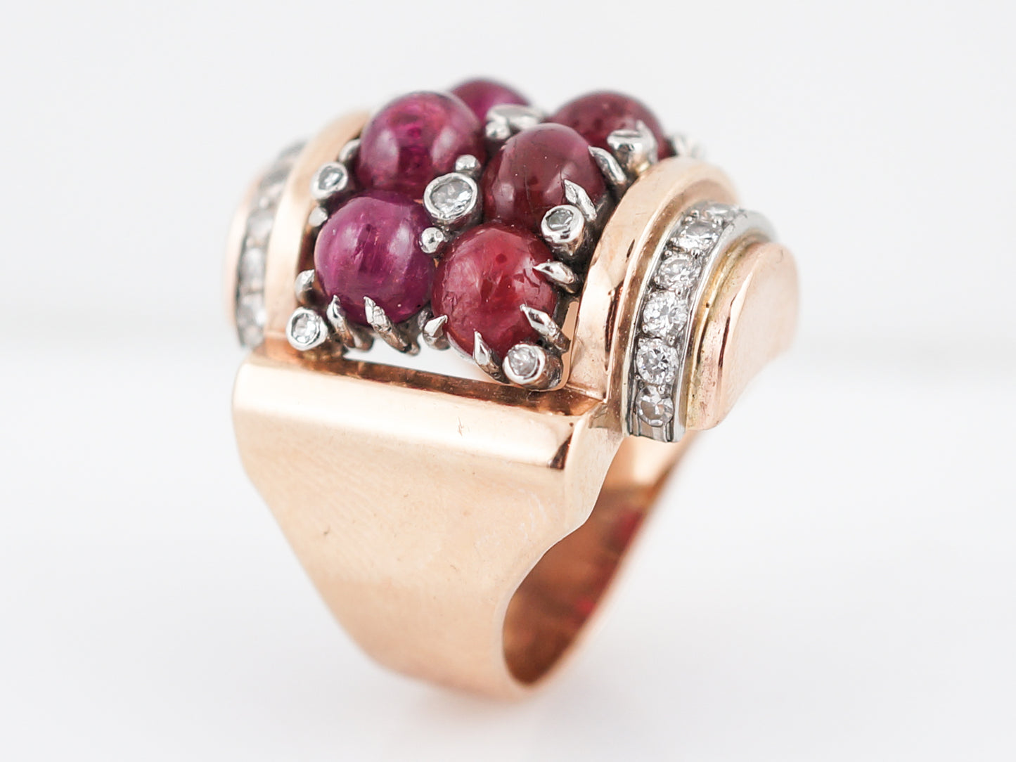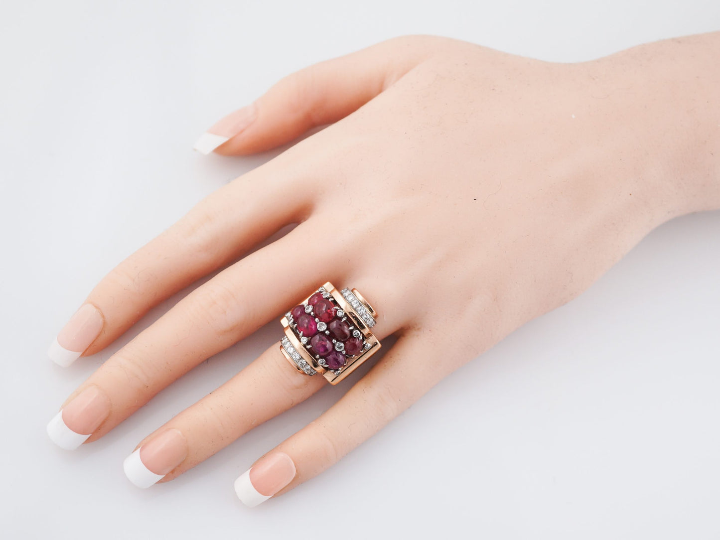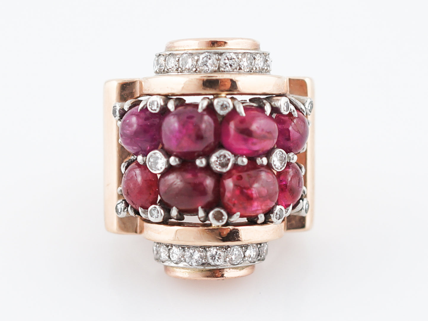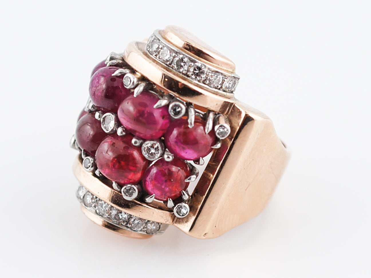 Extraordinary 1940s Retro diamond and ruby rose gold cocktail ring makes quite an impact. The cocktail ring features eight (8) large cabochon rubies with a total over 9.57 carats of rubies. There is an additional thirty-three (33) diamond set between the rubies. The rolling rubies and diamonds magnify the true Retro design.