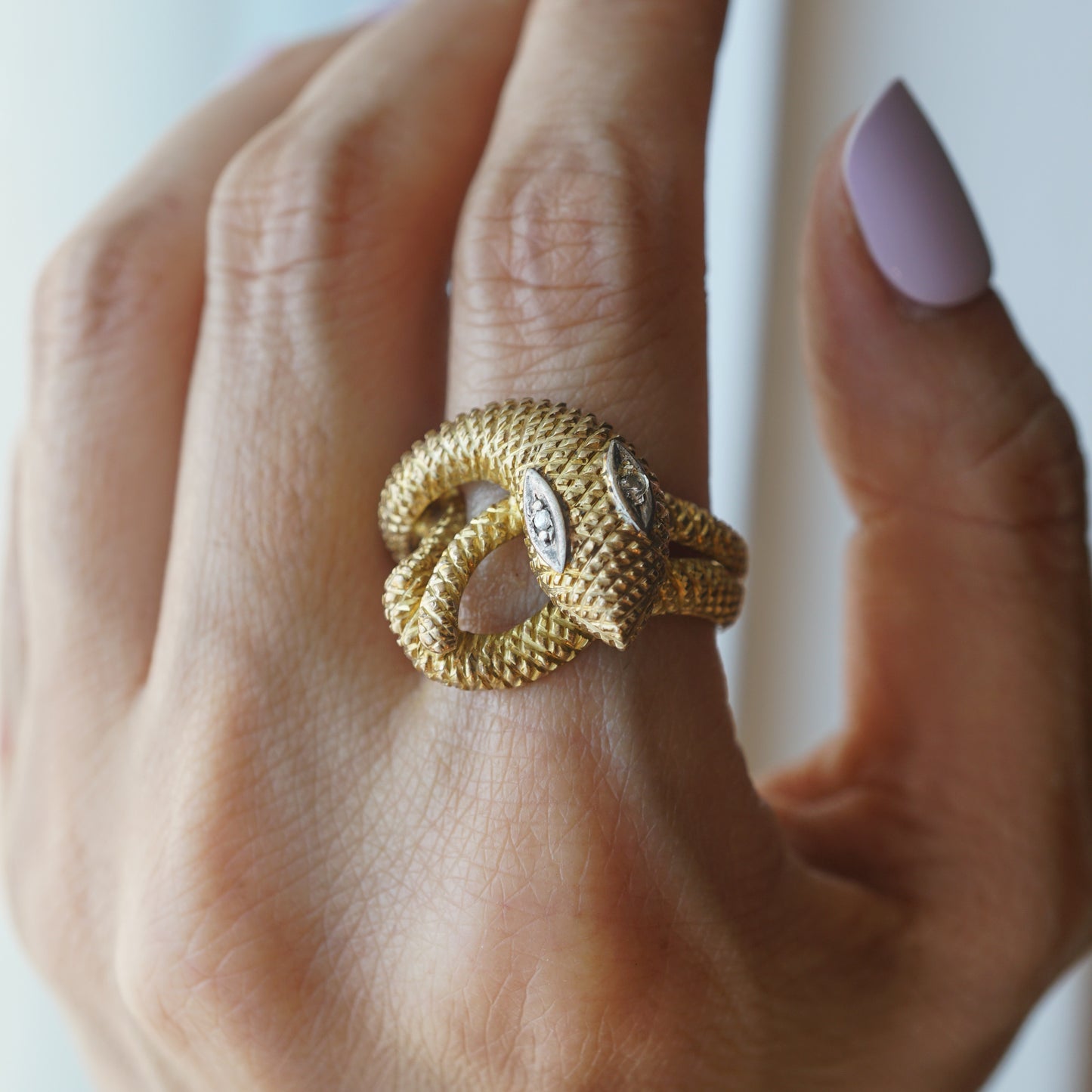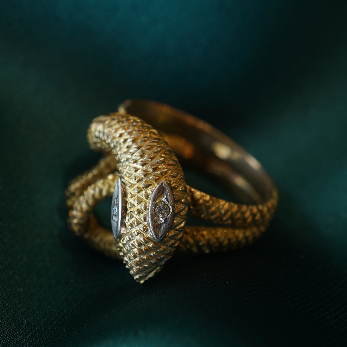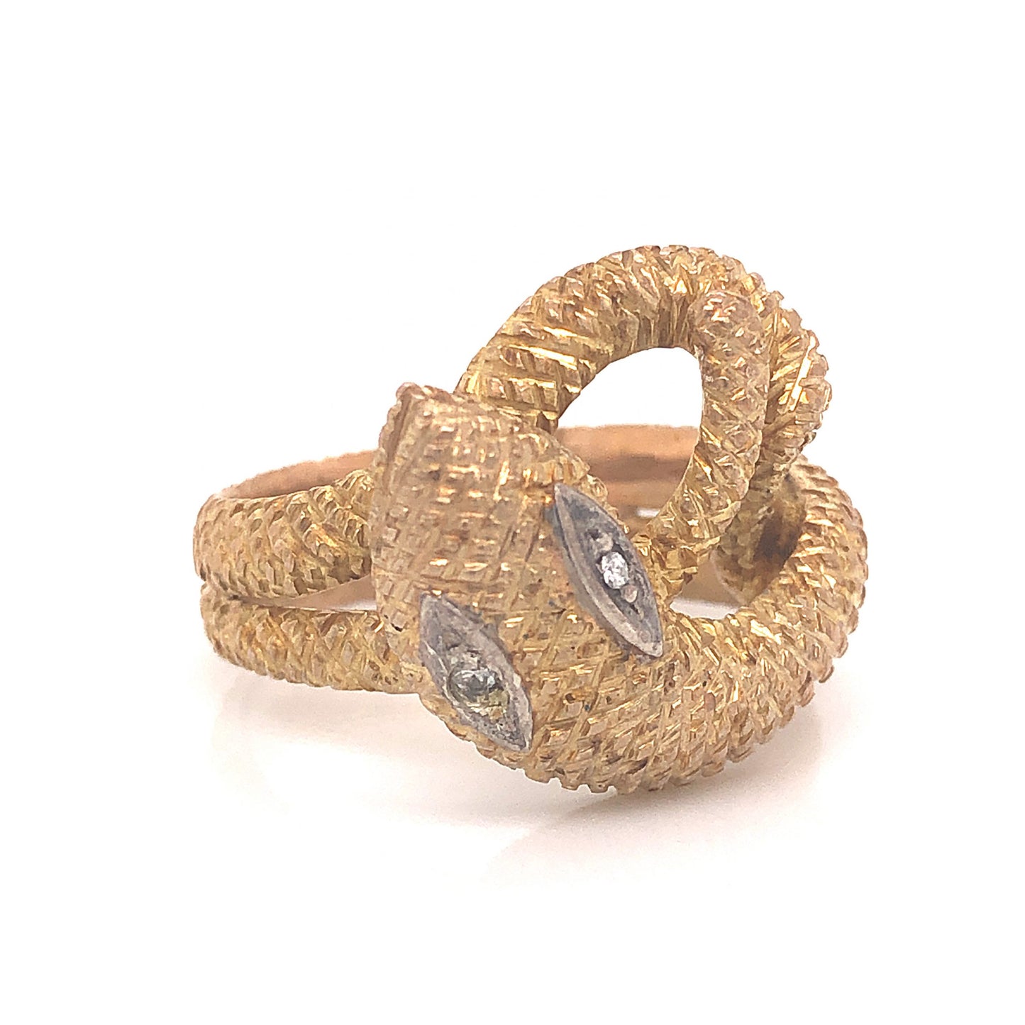 A vintage ring with a timeless design – this statement snake ring features two (2) Round Brilliant cut diamonds on an engraved 14 karat yellow gold band. Stylish and shimmering, the diamonds decorate the 14 karat white gold snake’s eyes. The body of the serpent is made in 14 karat yellow gold and winds around the finger. A fabulous work of art. Shop More Rings.