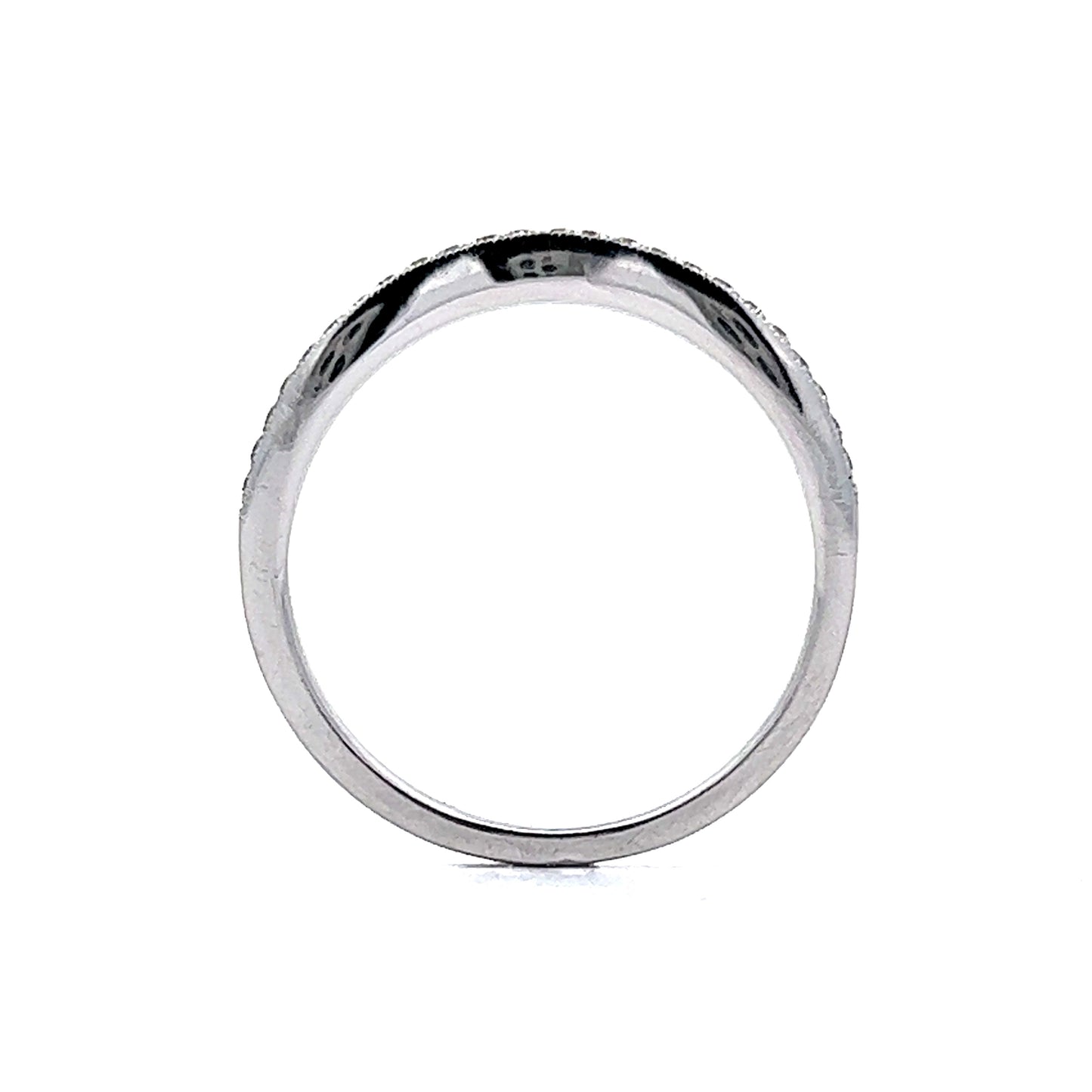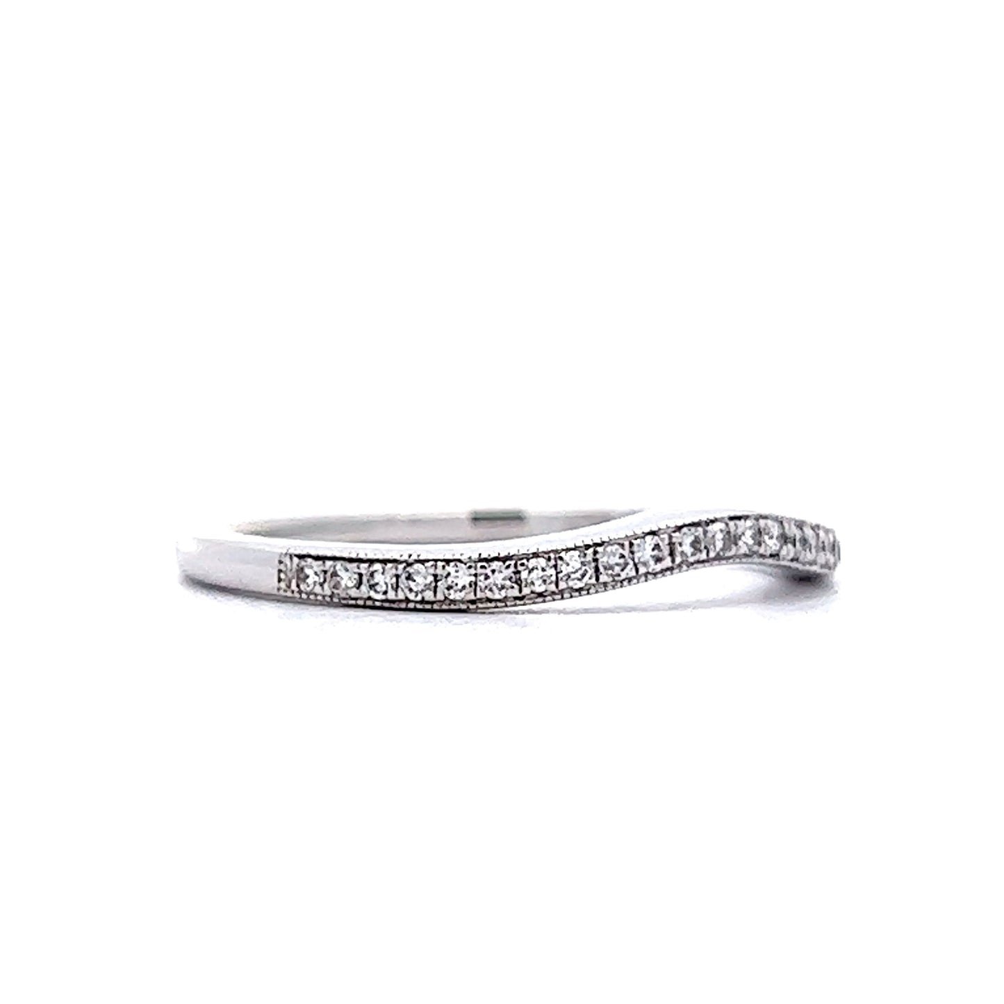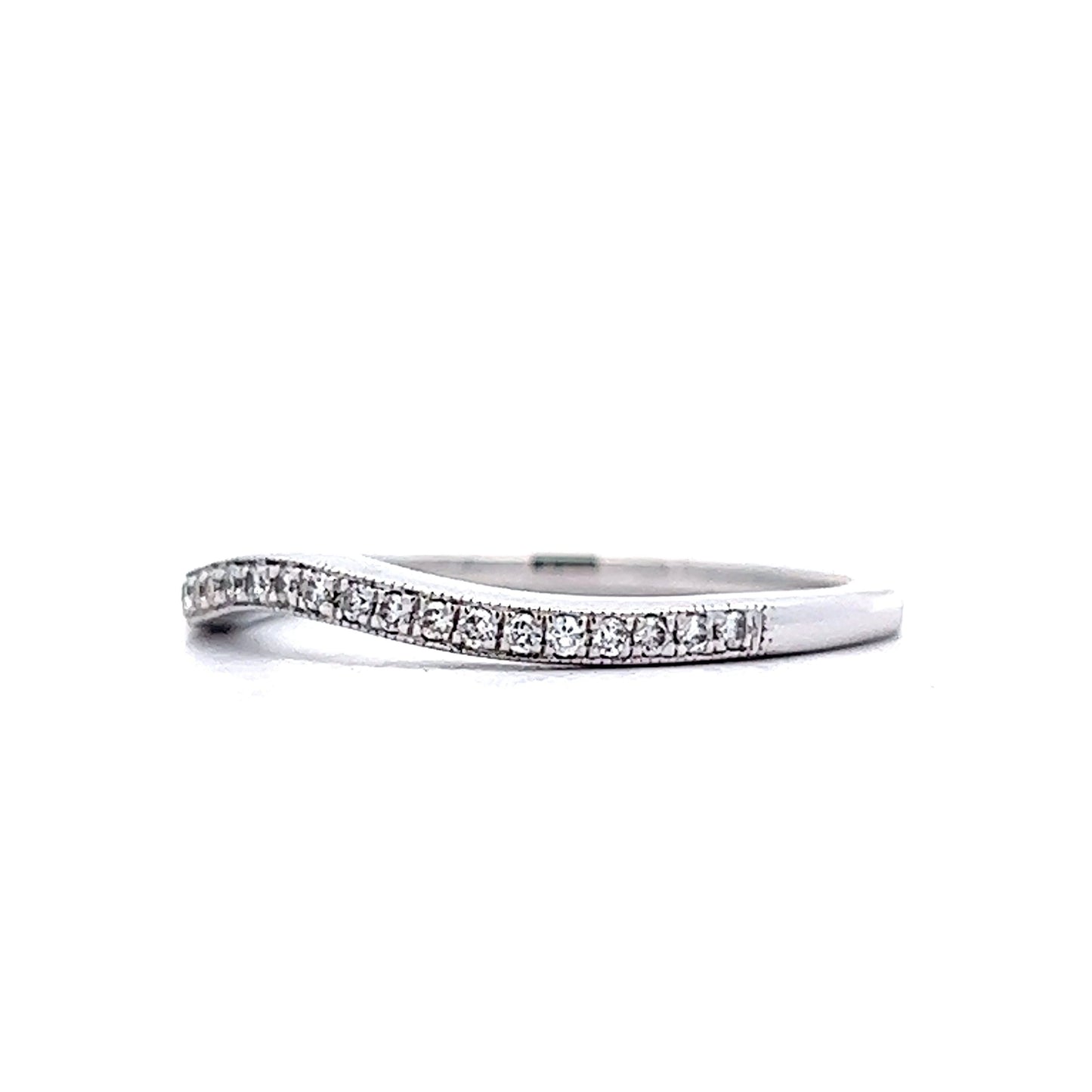 Milgrain Contoured Diamond Wedding Band in White Gold. This modern diamond wedding band features a gentle curve and is bordered with milgrain. Round brilliant cut diamonds adorn the top of the band and provide the sparkle and are bordered with fine milgrain detailing. The band has a gentle curve that will allow it to snuggle in next to a wider engagement ring.