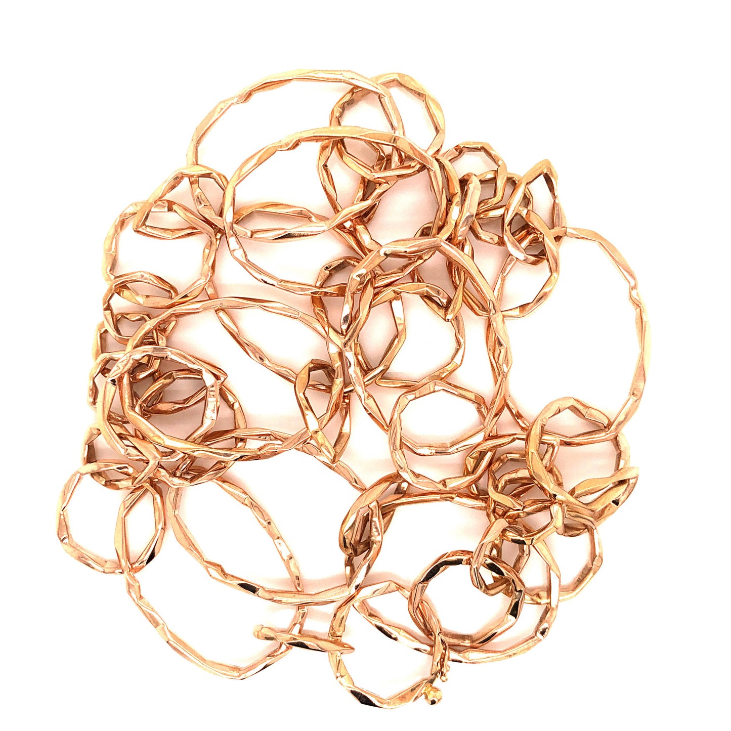 From the NYC-based jewelry designer Mimi So, this striking modern necklace features hammered, ornate links in 18 karat rose gold. The necklace measures 28 inches long and has a rustic design. Textured fashionable. Shop More Designer Jewelry.