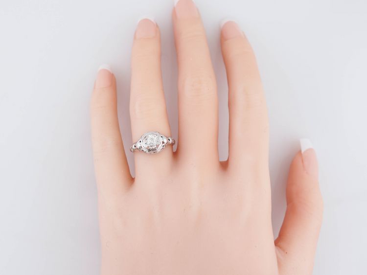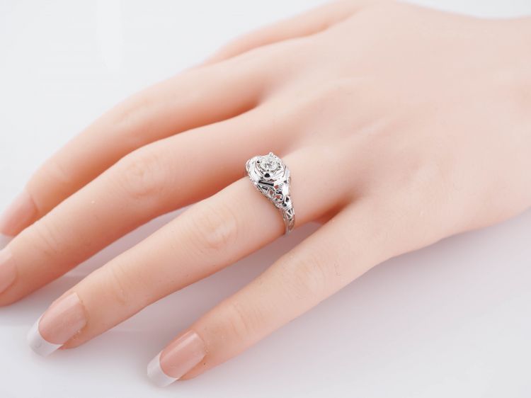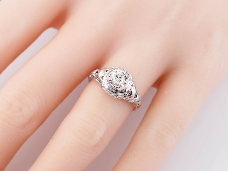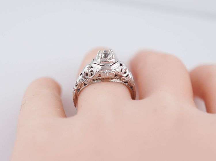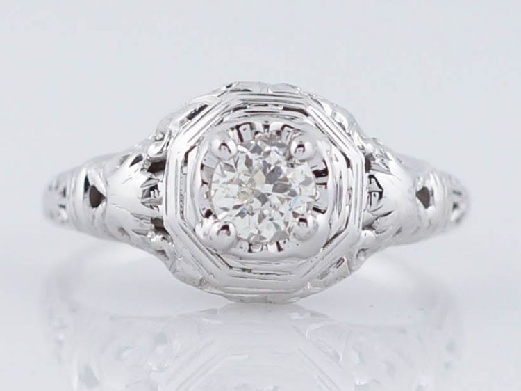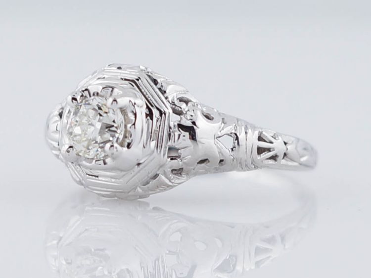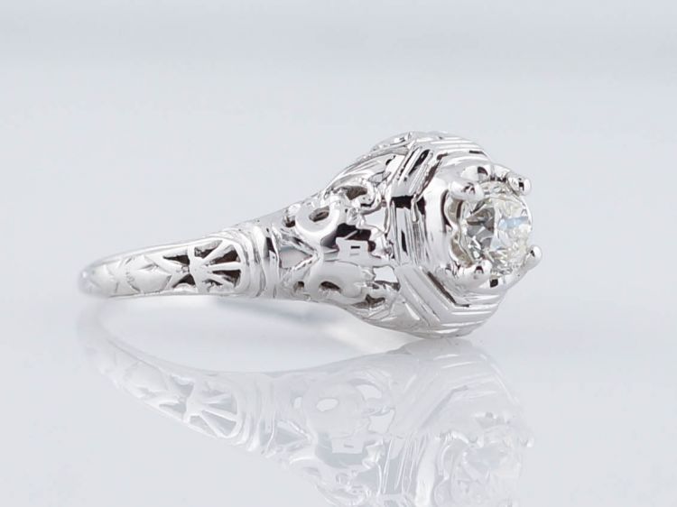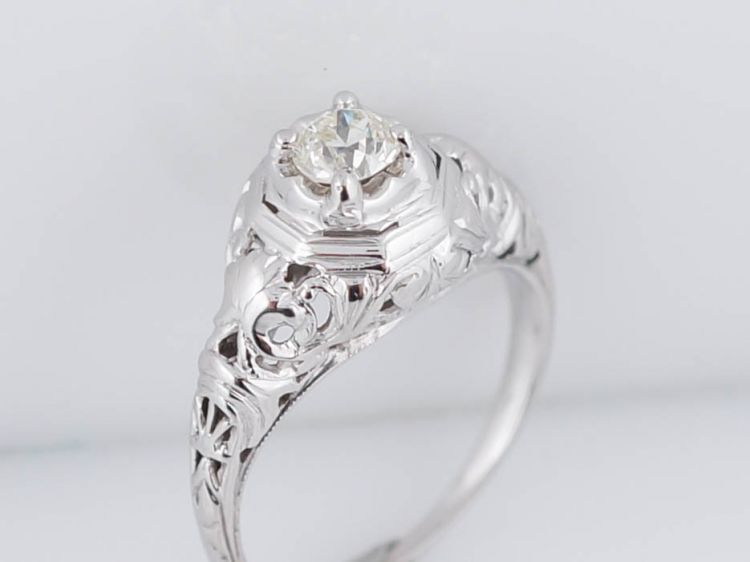 Mine Cut Art Deco Diamond Filigree Engagement Ring in 18k. This original solitaire engagement ring features a .31 carat old mine cut center diamond finished in 18 karat white gold. The mounting features bold, scrolling, geometric filigree work from the gallery and top view. This ring is a stunning solitaire that that would look beautiful with an antique wedding band.