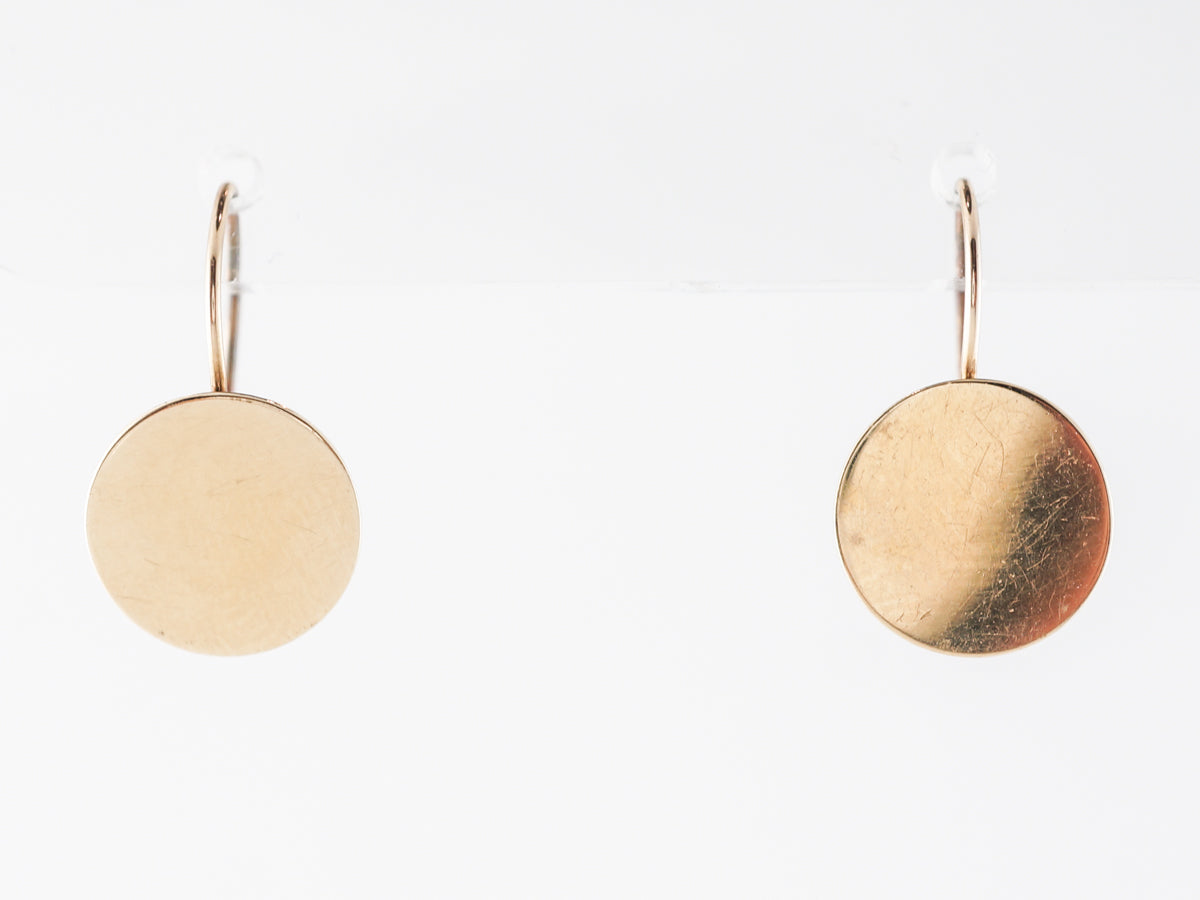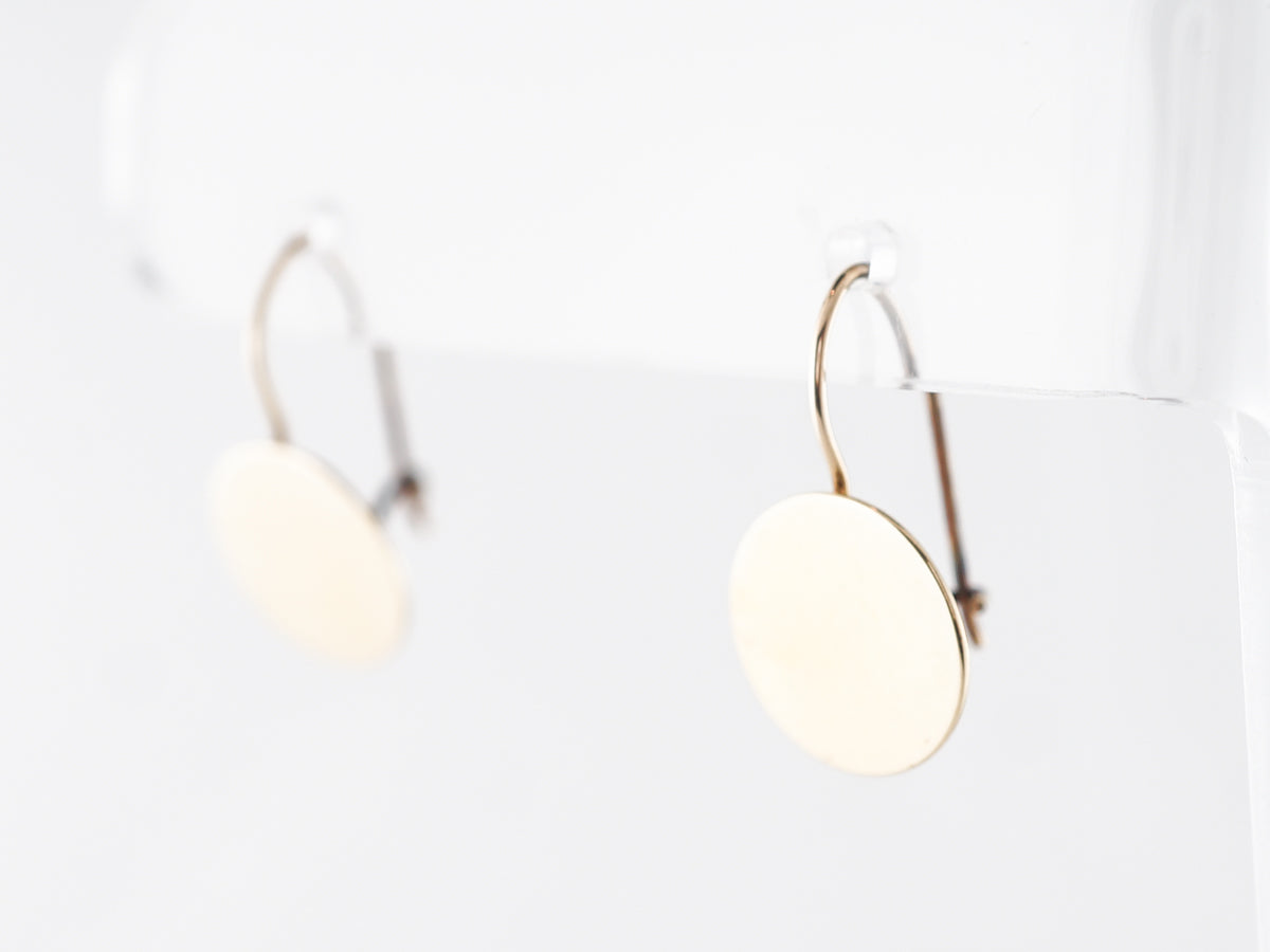 Minimal Disc Earrings in 14k Yellow Gold. These modern dangle earrings are the perfect pair for everyday wear with their flat discs of 14 karat yellow gold. Secured with an ear wire, these will have very slight movement.