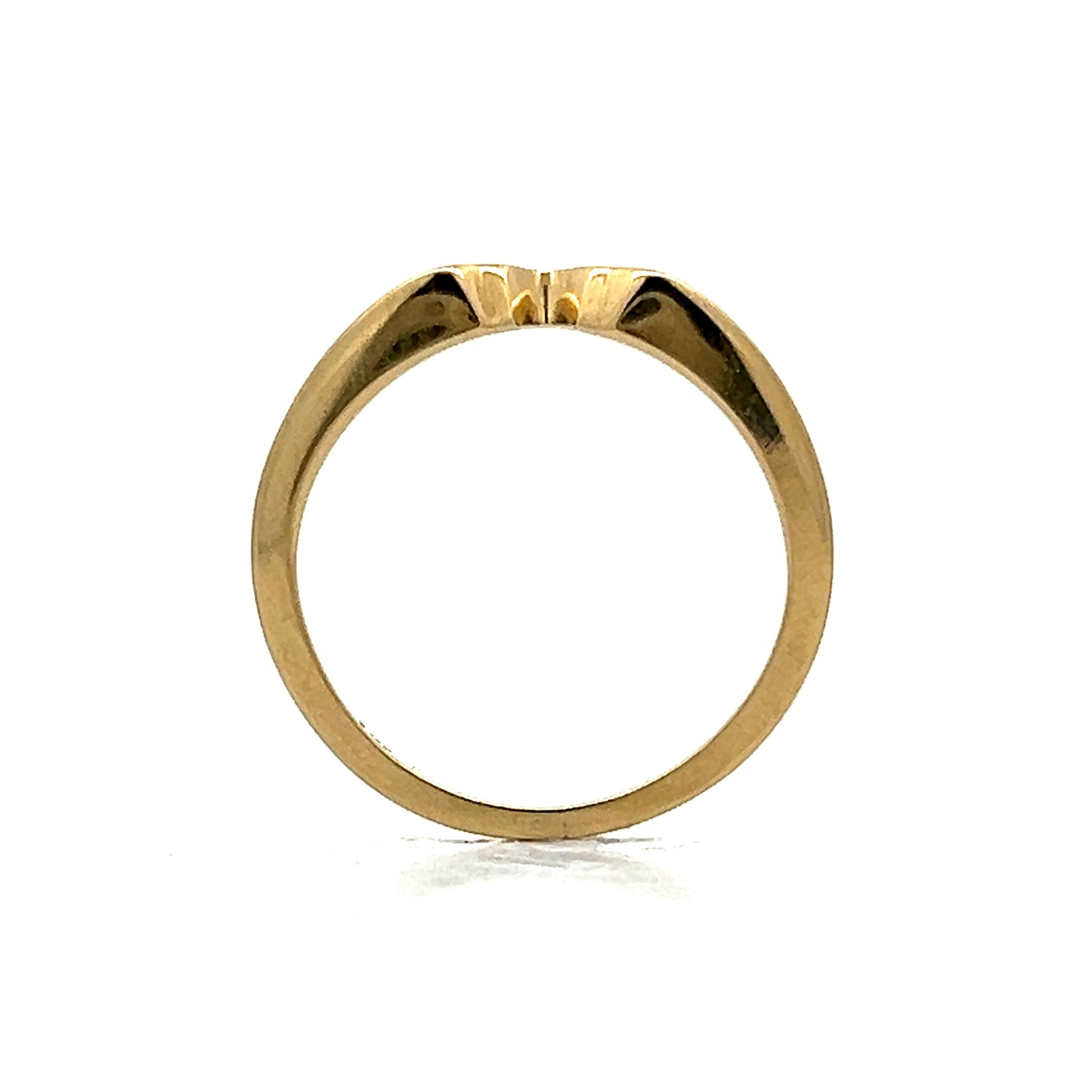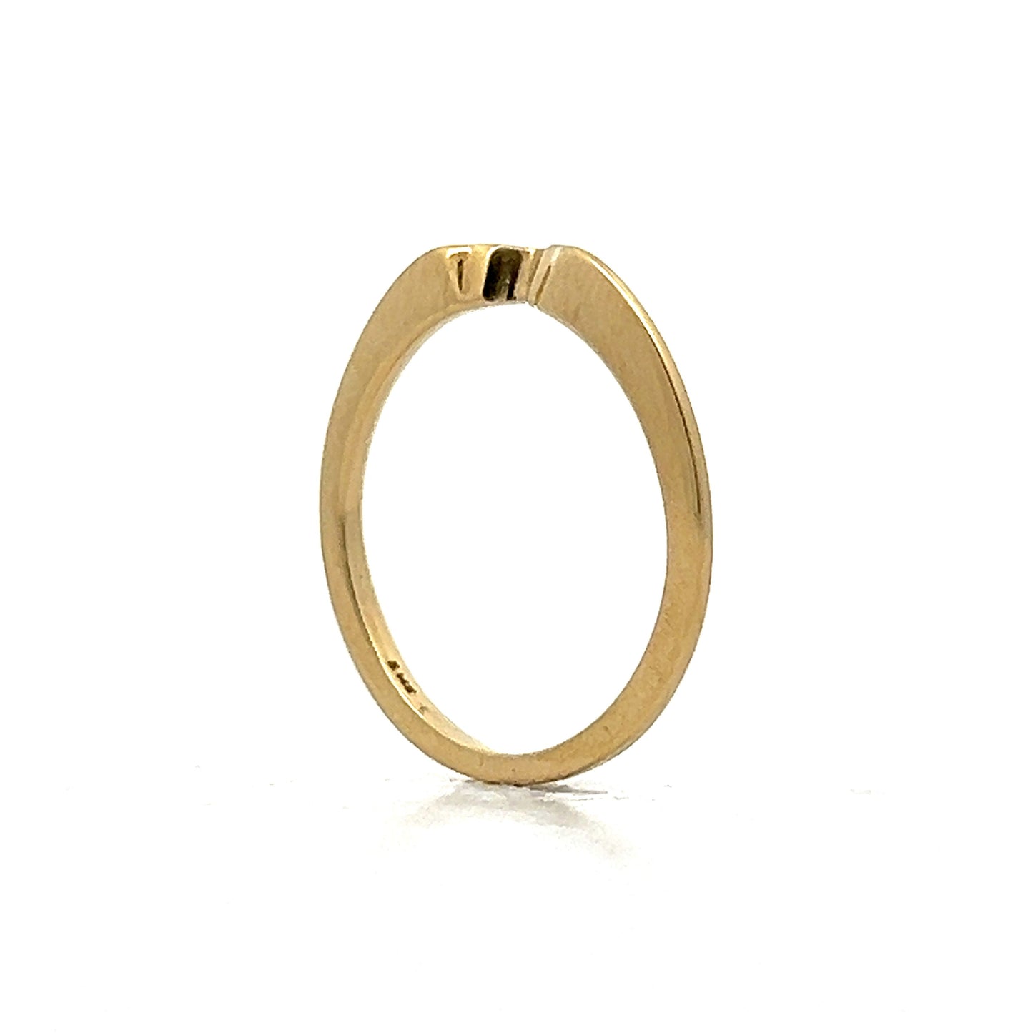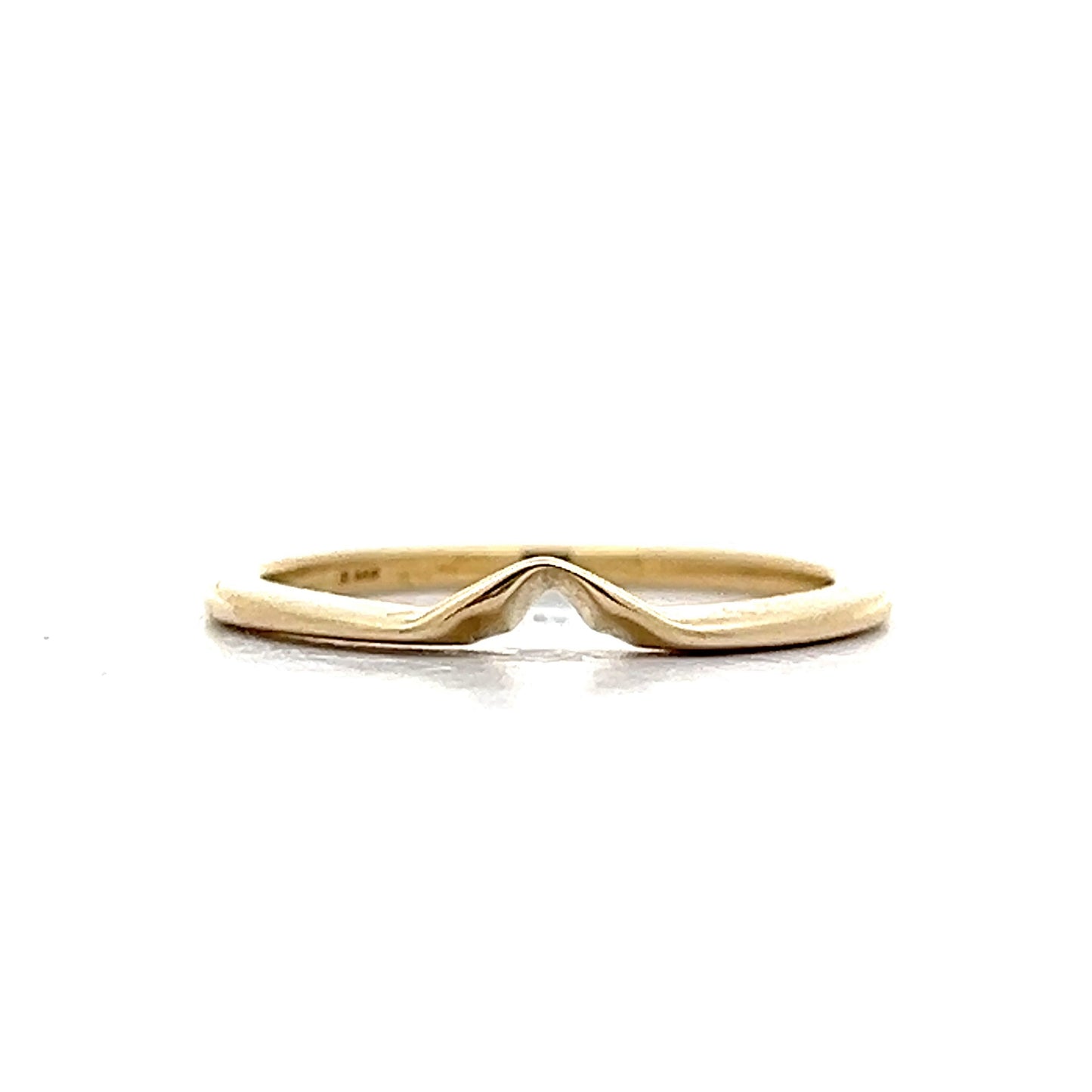 This V-shaped contour wedding band, crafted in 14 karat yellow gold, embodies a sleek and minimalist design. Its slight V shape adds a distinctive twist to the traditional band, making it a perfect complement to a low profile engagement ring. The polished finish highlights the ring's radiant gold, offering a subtle yet elegant look. Ideal for those who appreciate modern aesthetics, this contoured band represents a blend of contemporary style and refined simplicity, celebrating your unique commitment with understated charm.