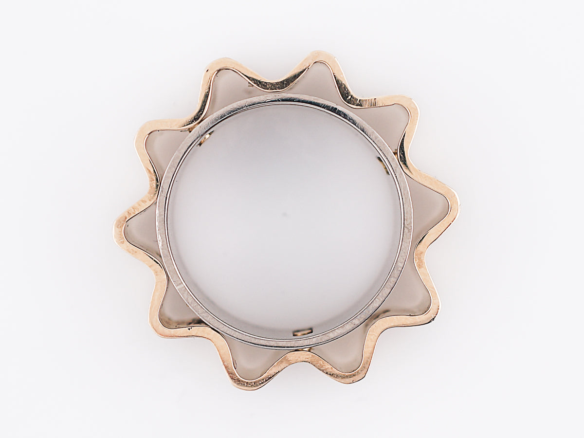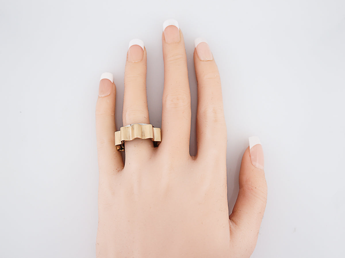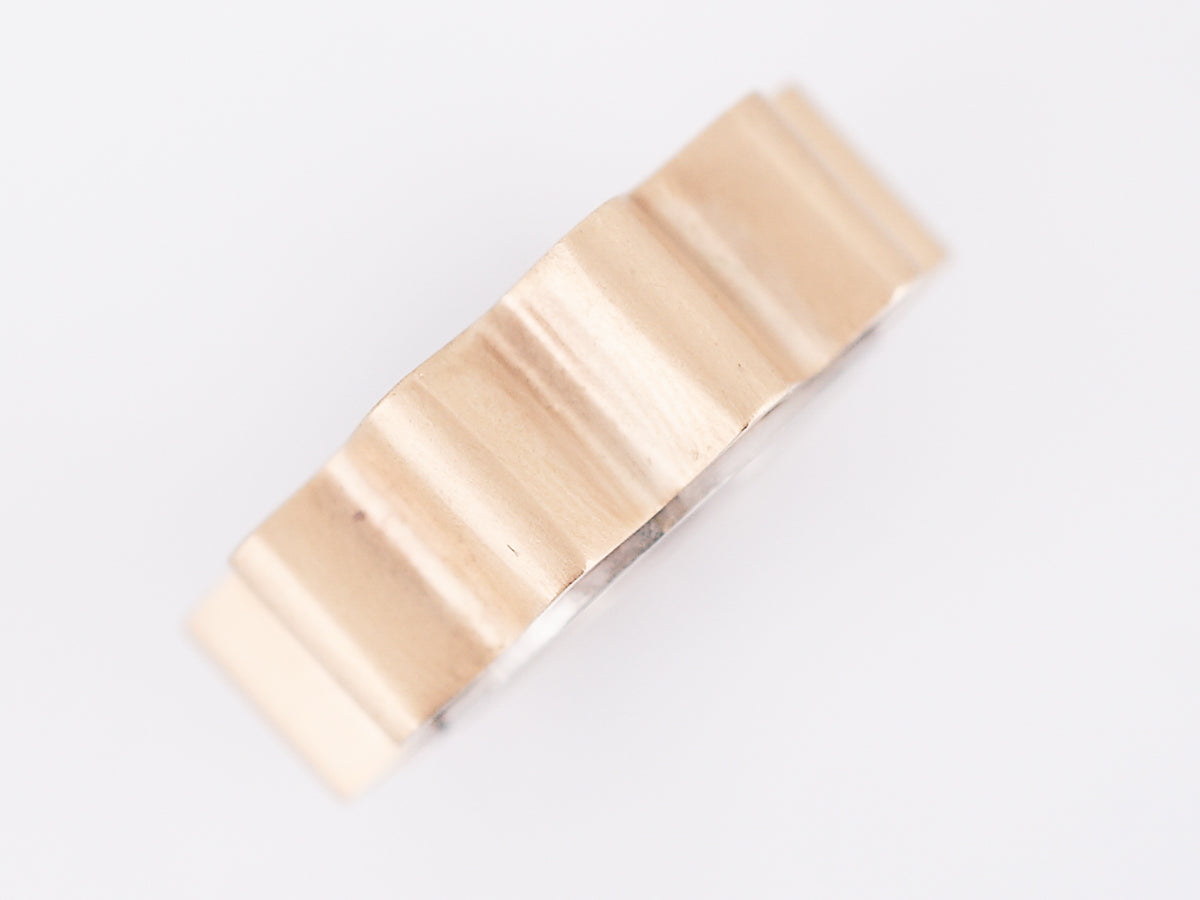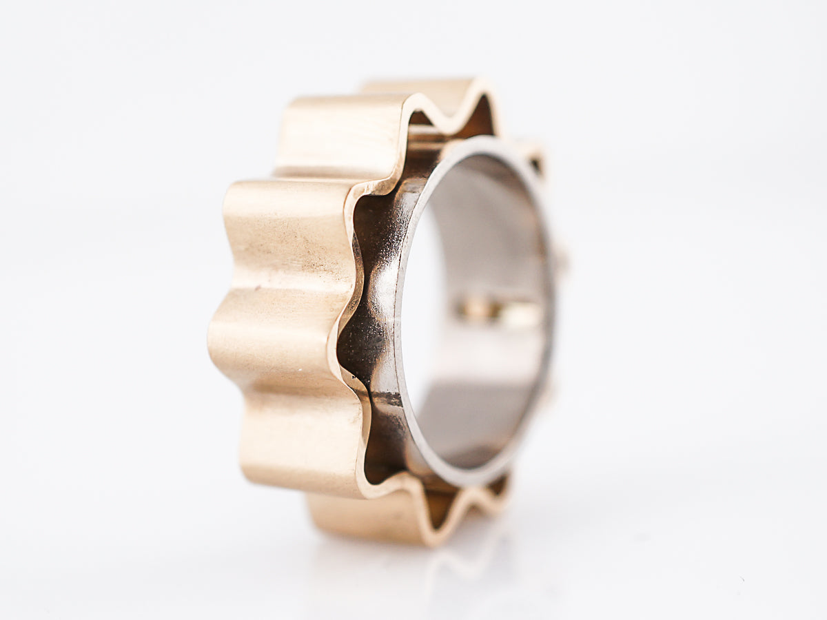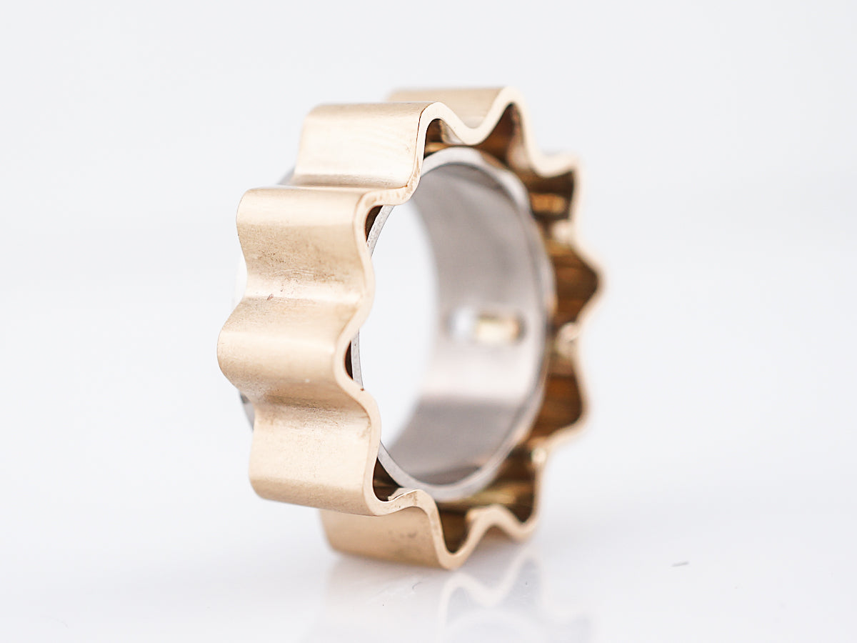 This Modern Era ring is made in 18 karat yellow and white gold, with a matte, satin finish. The outer yellow gold portion of the ring looks almost like a gear with soft waves, and the inner white gold portion is a flat high polish band that the outer portion moves back and forth from. Measuring about 8 millimeters, this ring is a great statement and a perfect piece for those who tend to fidget.