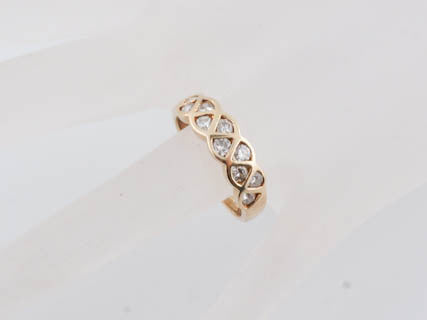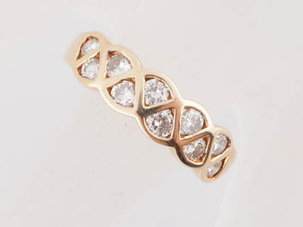 This lovely Modern wide diamond band features ten (10) round brilliant diamonds channel set in triangular openings across the top of the ring.