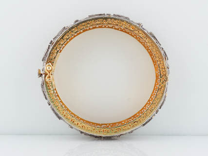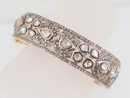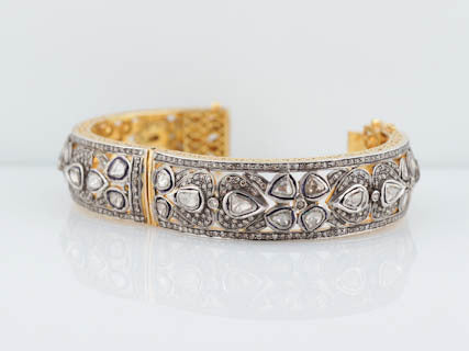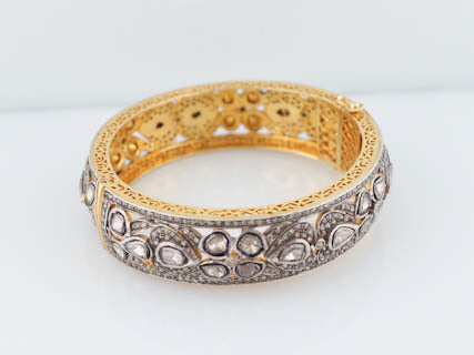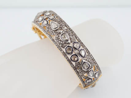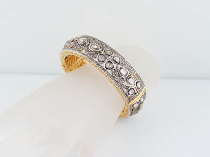 Antique Style 12.42 cttw Wide Rose Cut Diamond Bangle Cuff Bracelet in 14kt Yellow Gold and Sterling Silver