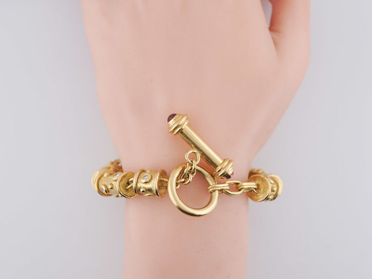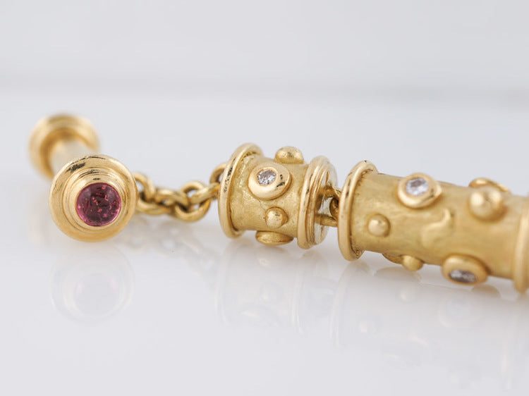 This modern antique style tubular link bracelet features 1.68 carats of round brilliant cut diamonds. Set in 18k yellow gold, the bracelet consists of tubular links with the diamonds bezel set. The clasp has two cabochon cut pink tourmalines for an extra touch of color. Weighing in at 80.8 grams of gold, this beautiful bracelet can be worn for just about any occasion.