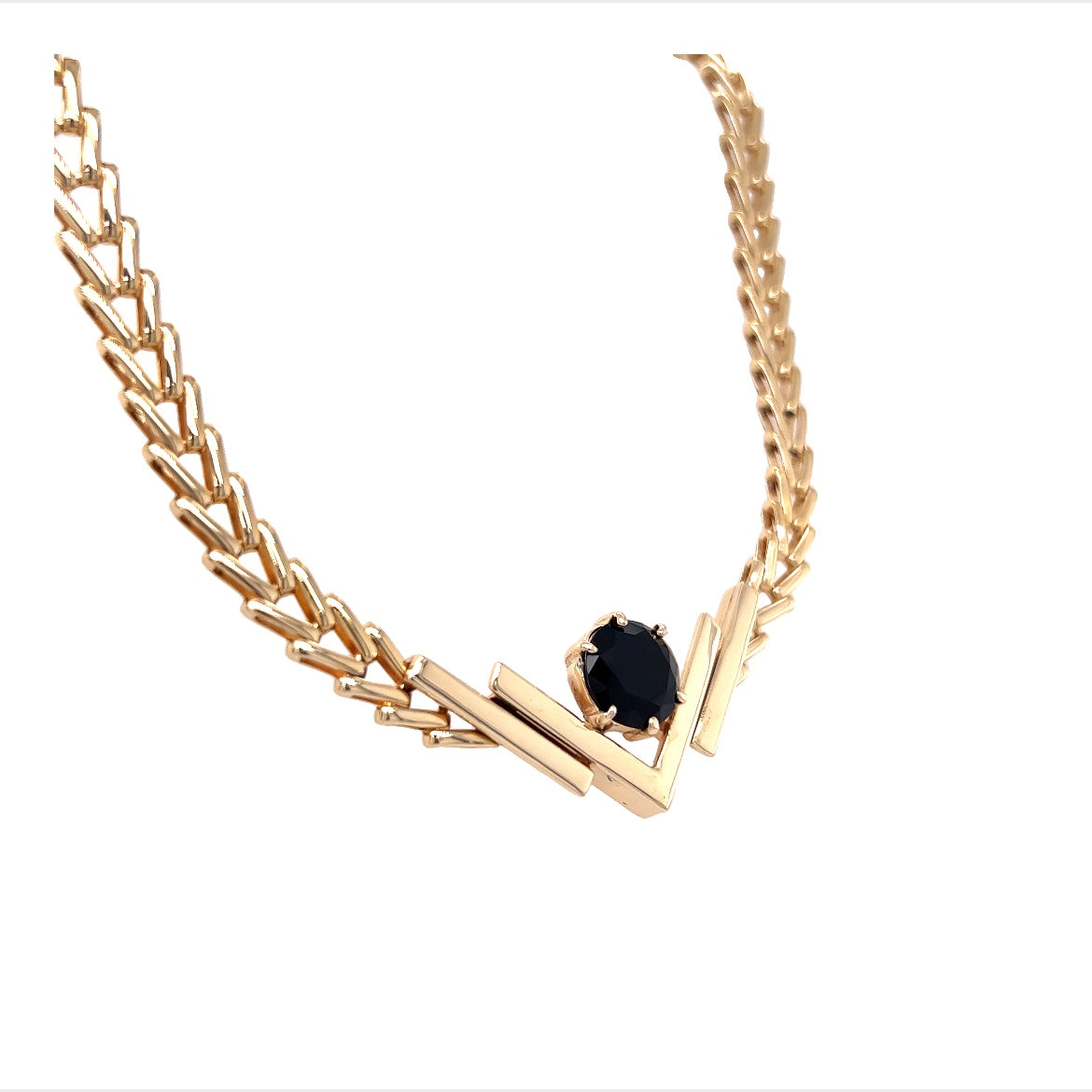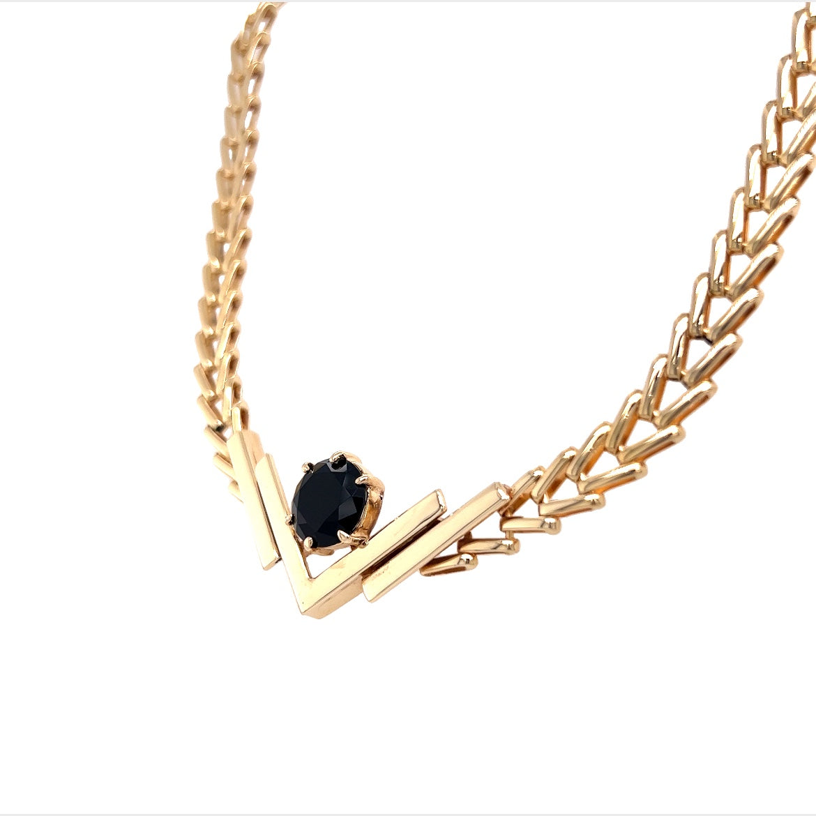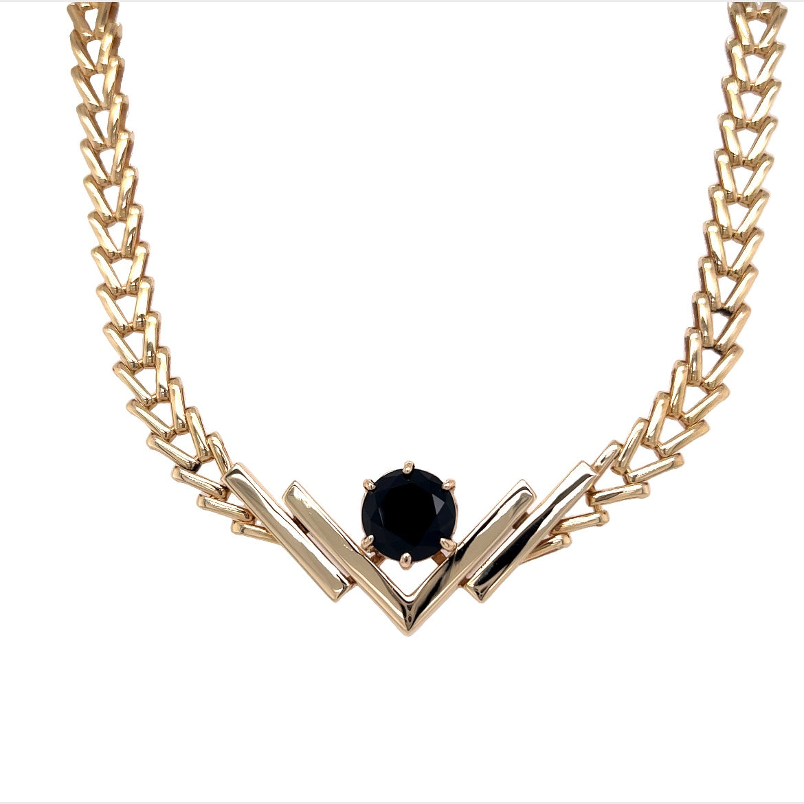 Vintage-inspired in black onyx and gold! This iconic Modern Black Onyx Collar Necklace in 14k Yellow Gold makes an unforgettable statement. A mesmerizing 2.79 carat round cut black onyx is artfully set above the golden V pendant. Complete with a boxy curb link chain necklace. The necklace measures 16 inches long and lays perfectly along the collarbone. An elegant modern necklace with a chic hardware feel.