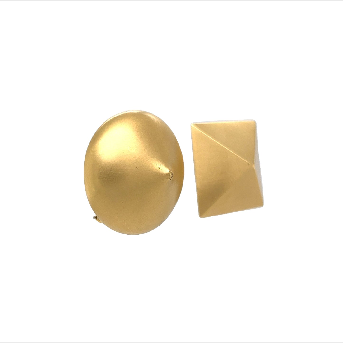 Chic fashion forward. These wonderfully mismatched post earrings are made with 18k yellow gold. Geometric and full of 90s inspired style. They were made by Pedro Boregaard who used to work for Tiffany Co. before starting his own line. These Modern geometric earrings have a satin finish, giving them a distinctly modern look. These earrings are sure to make a splash because of their substantial size and how they dont match but go together perfectly.
