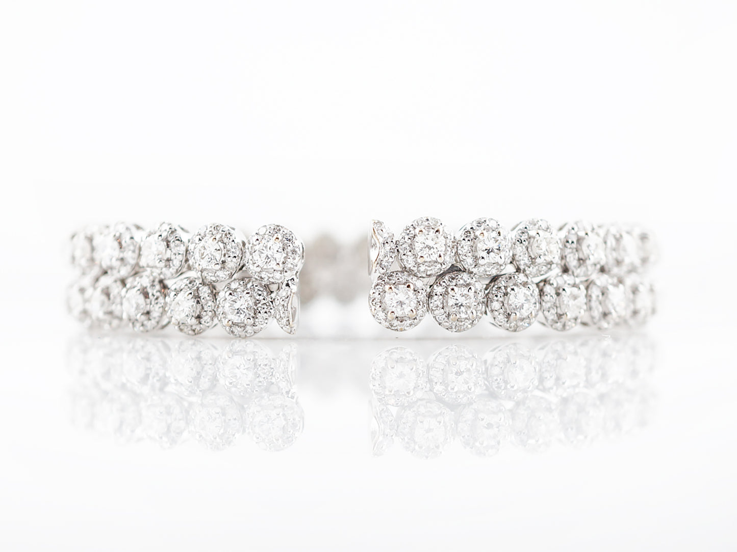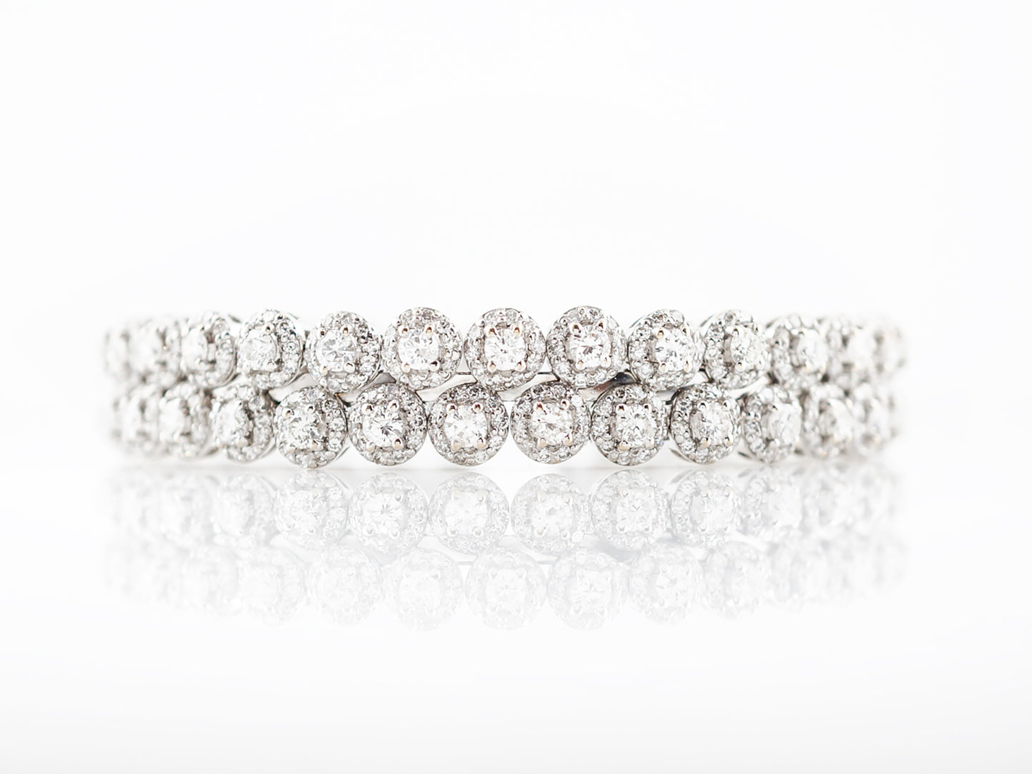 This Modern bracelet is covered with round brilliant cut diamonds. This cuff is made up of two rows of diamonds each with its own halo of smaller diamonds. This bracelet is as comfortable as it is striking. The18k white gold setting is a perfect compliment to the glittering white diamonds.