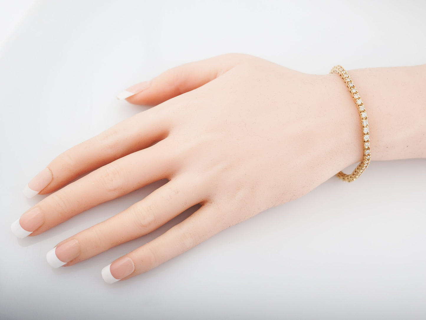 This classic Modern 14k yellow gold bracelet features fifty-five (55) round brilliant cut diamonds running the length of the bracelet. The diamond quality shines through the brilliance of the diamonds.