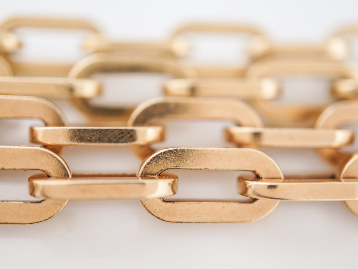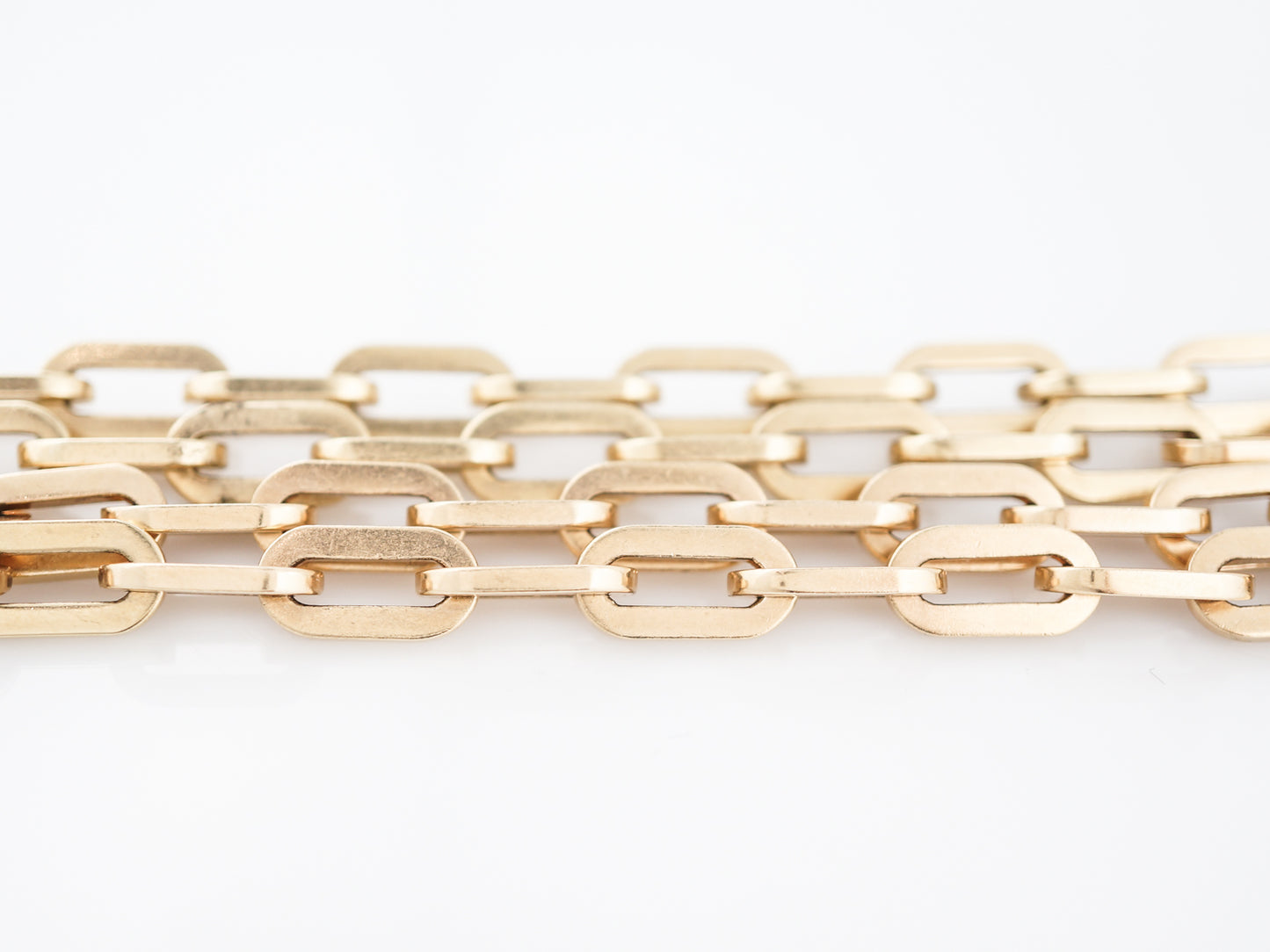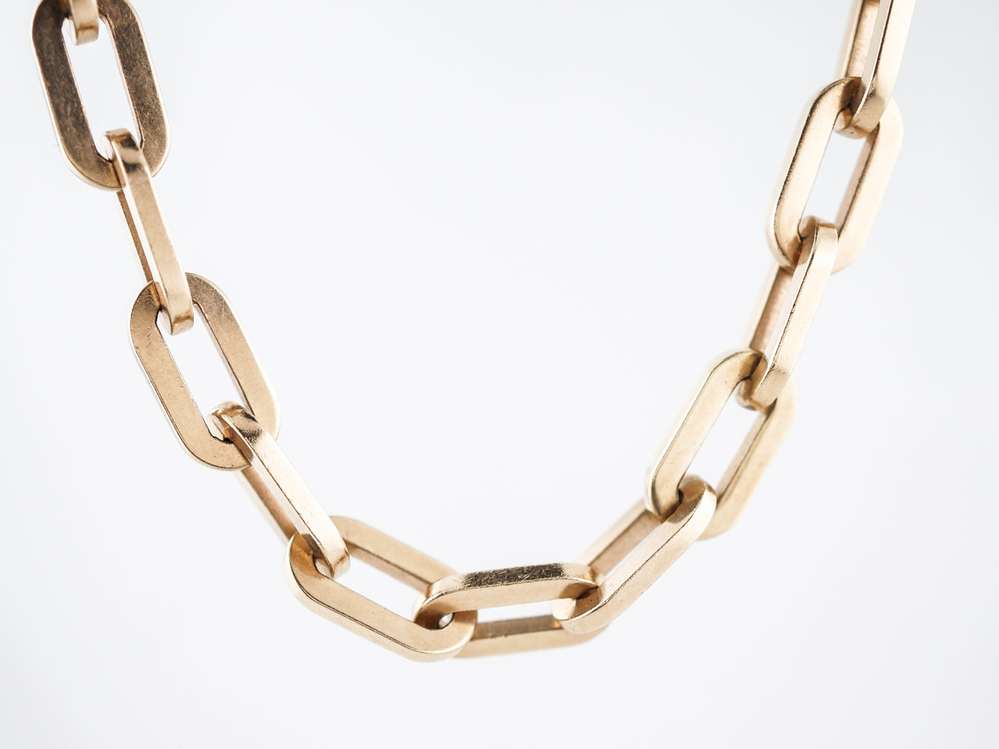 This modern and substantial chain features square edged oval links. At 33 long, it could be double wrapped to created a layer effect, or simply worn long. Either way, the heft at 77.8 grams, creates a luxurious necklace with the ability to be worn in multiple ways.