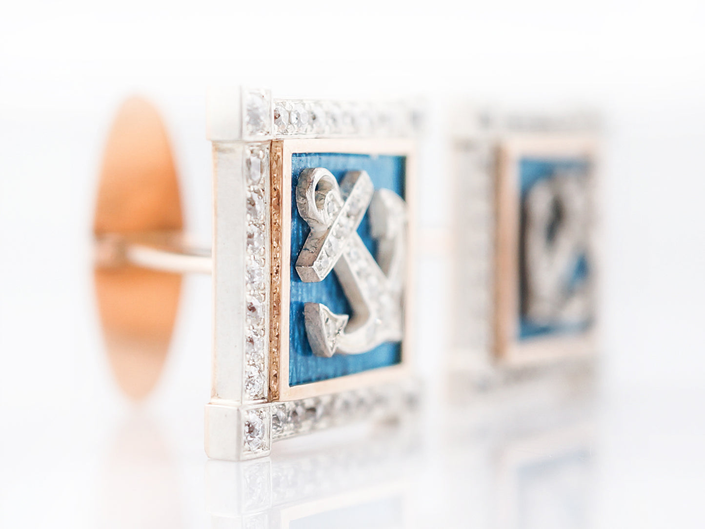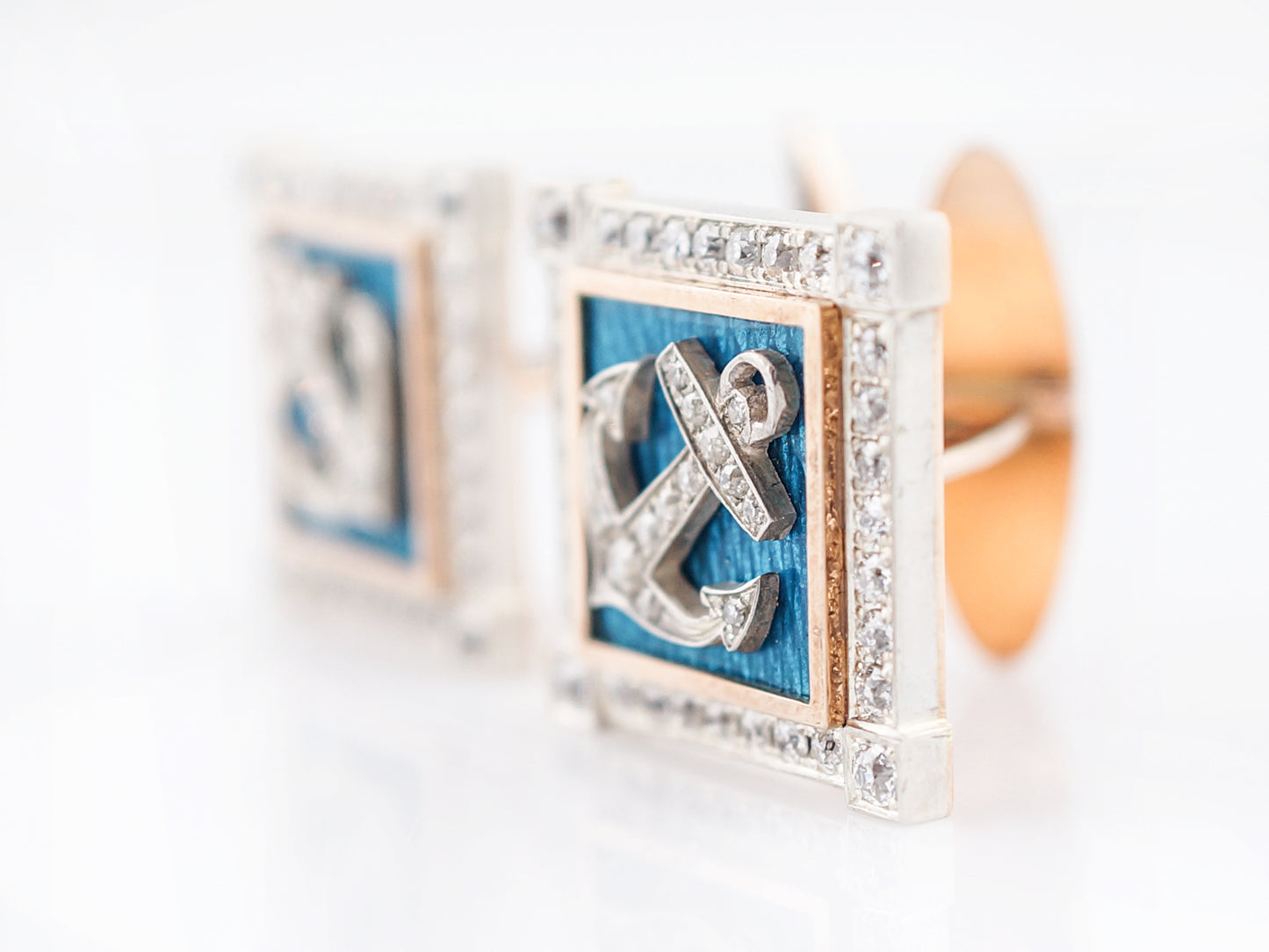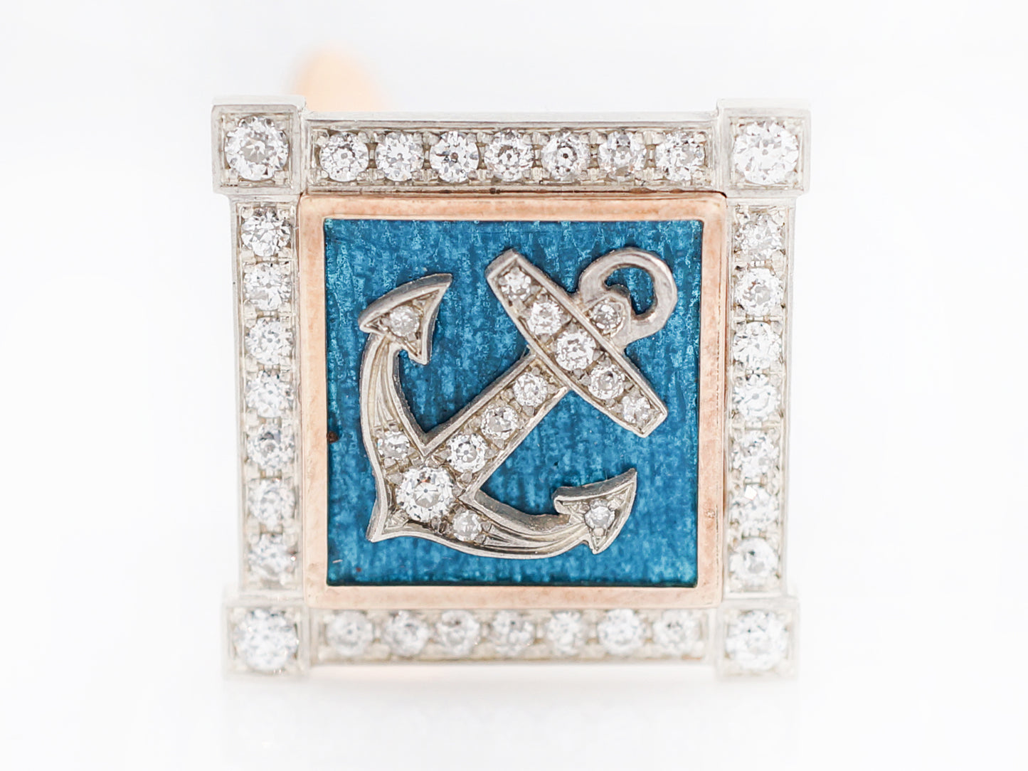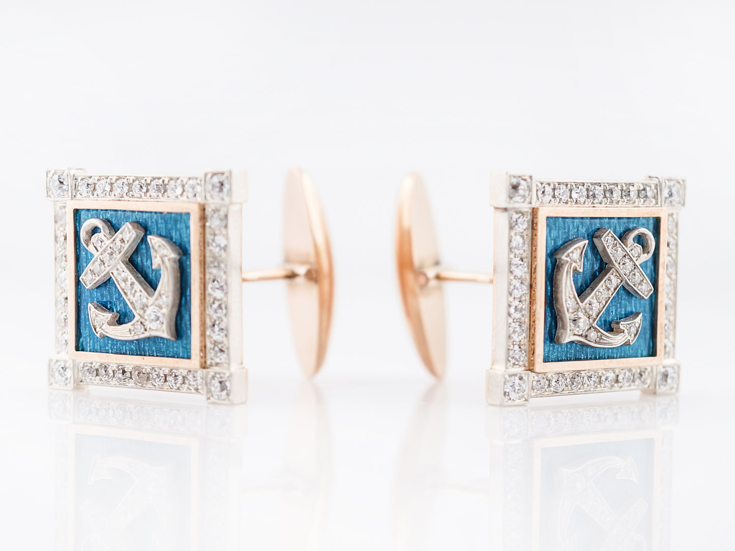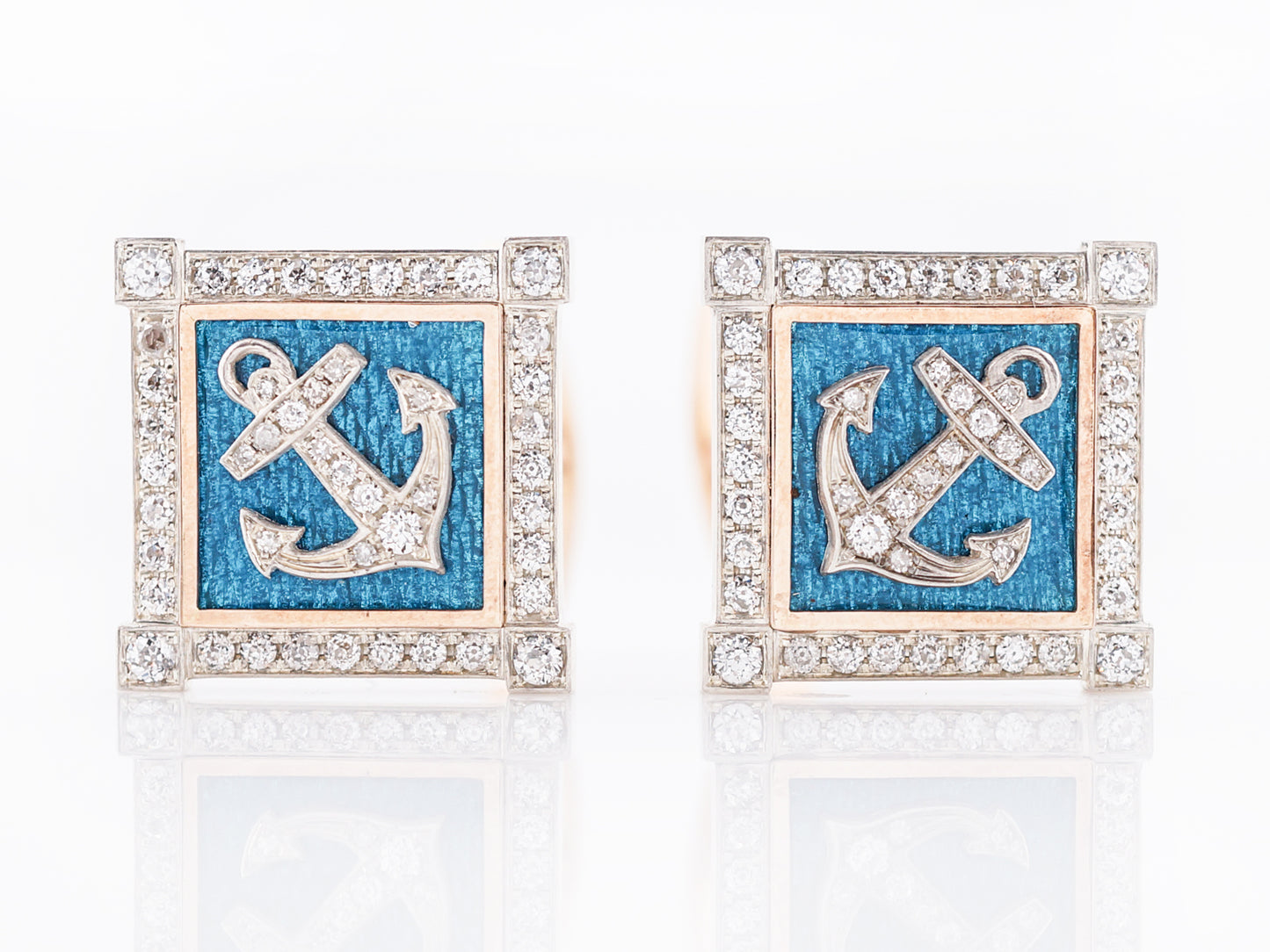 These nautical themed enamel and diamond cufflinks are beautifully made. The anchor motif is completed in 18 karat yellow gold and is bead set with diamonds. The anchor is accented with a turquoise enamel handprinted on the 18 karat yellow gold back. The edge of the cufflink features a diamond bezel also bead set in 18 karat white gold creating a frame around this extraordinary design. The cufflinks are finished in a high polish and have a folding closure.