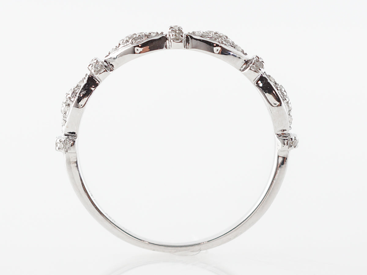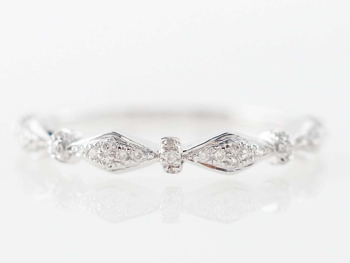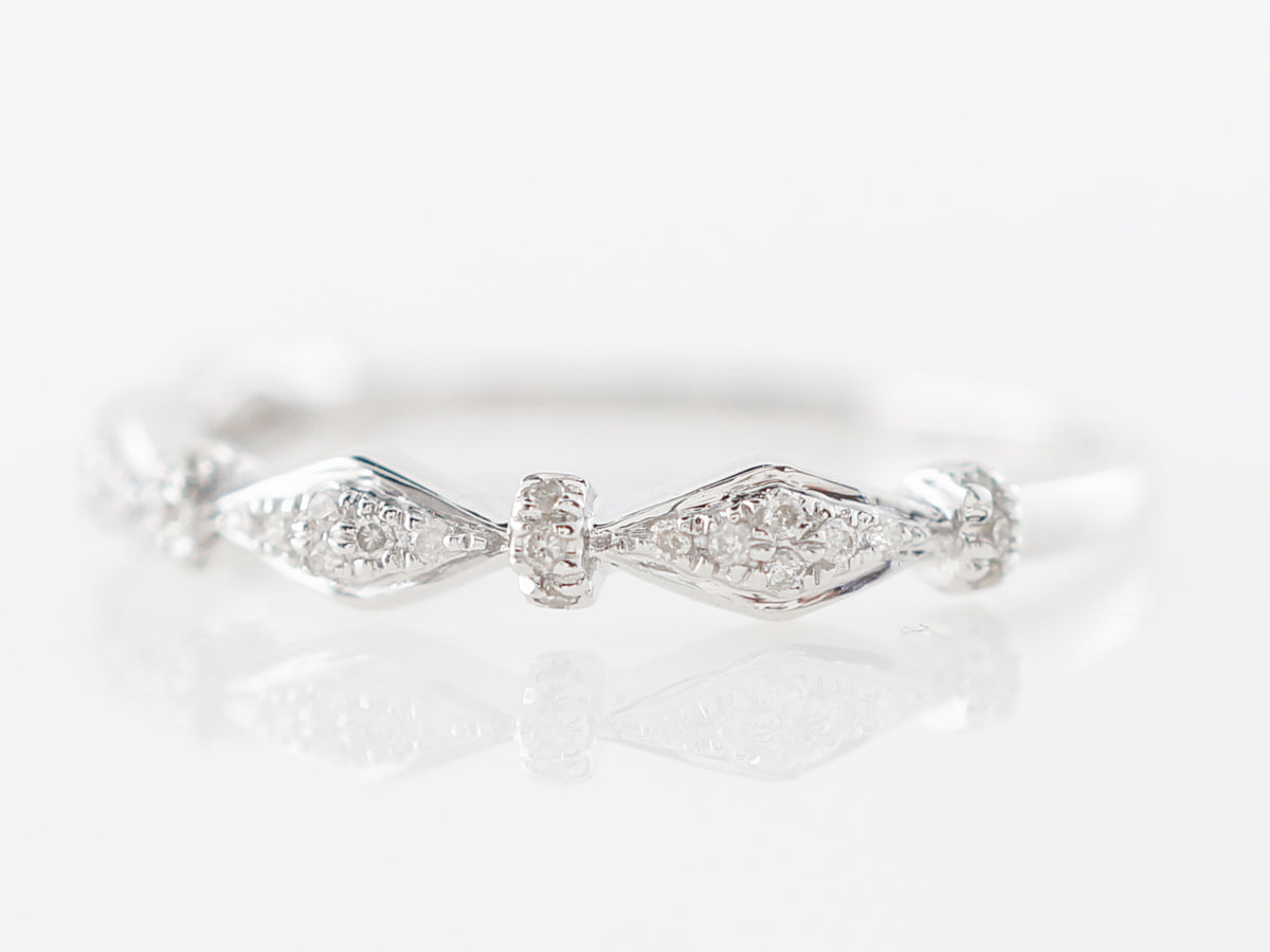 Modern Diamond Wedding Band in 14k White Gold. This modern wedding band features .078 carats of round brilliant cut diamond set across the top of the band. The repeating shapes in 14 karat white gold give a gorgeous geometric feel. This ring will pair nicely with an engagement ring or in a stack of bands.