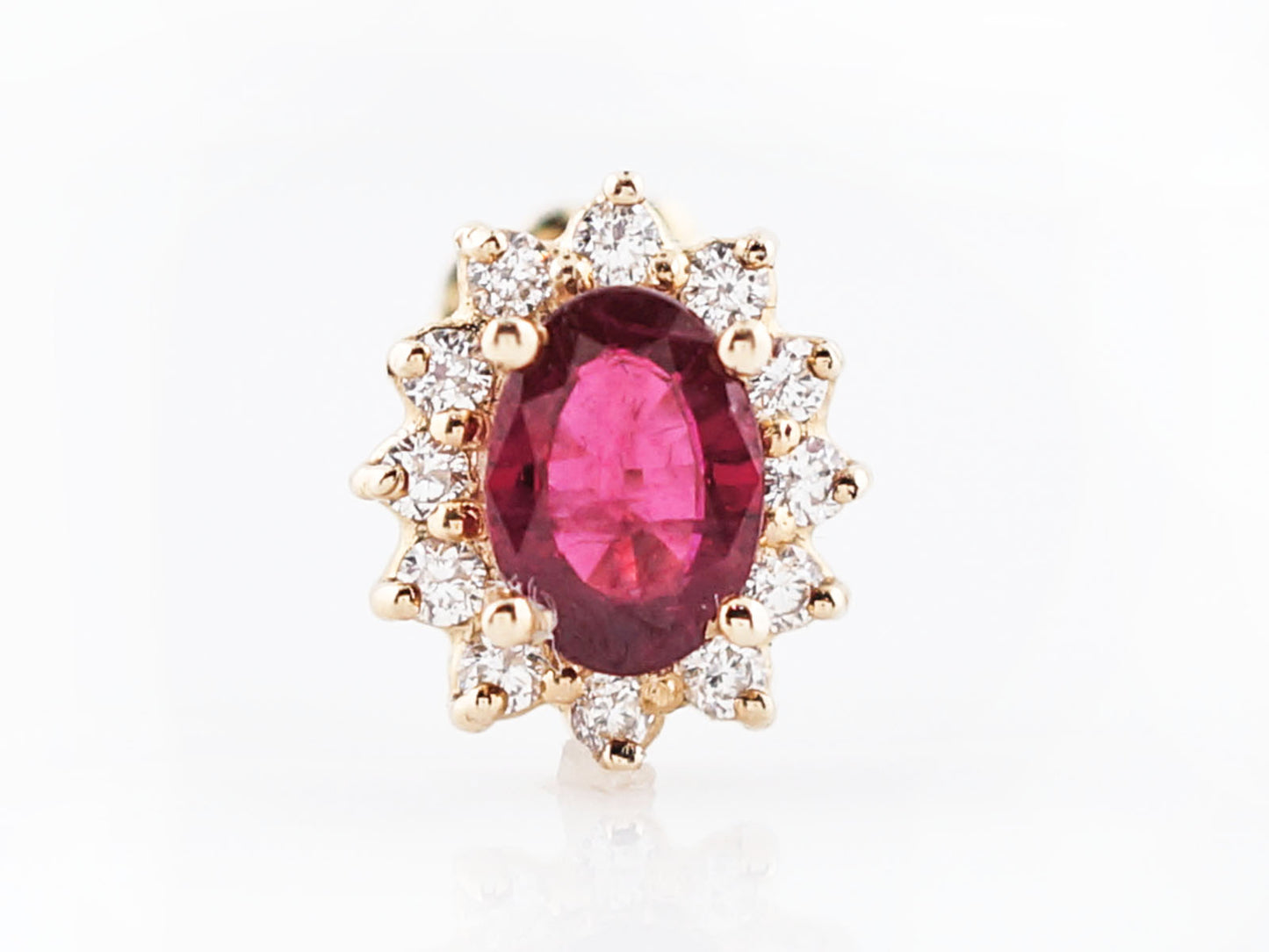 These modern oval cut Ruby earrings have a striking red color and are made even lovelier by the halo of diamonds that surround them. Each earring has an approximately 0. 74 carat ruby that is basket set and has twelve (12) round brilliant cut diamonds weighing approximately .20 cttw all set in 14 karat yellow gold. The perfect gift for a July birthday or as an accent to your everyday wardrobe, once you put them on, youll never want to take them off!