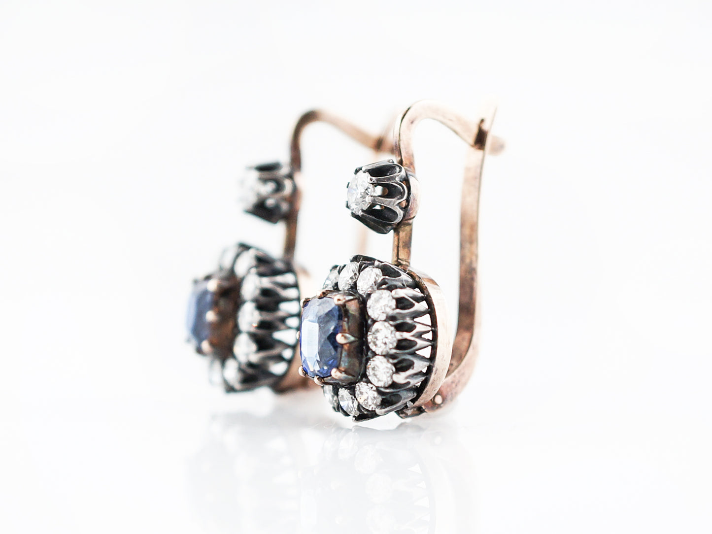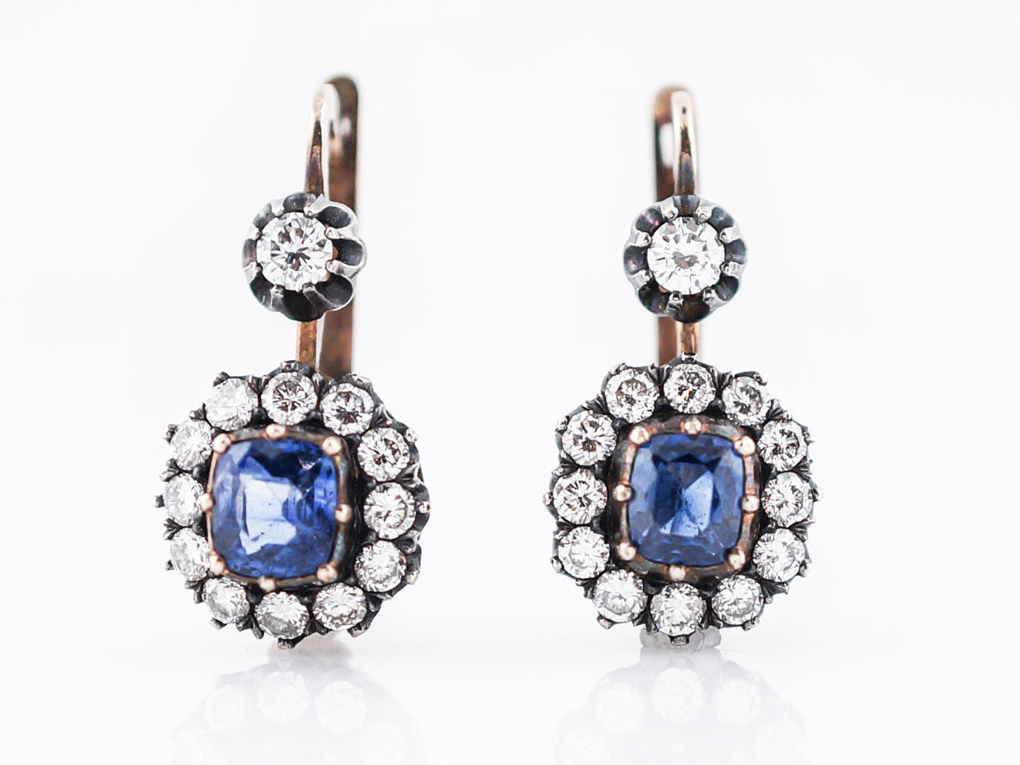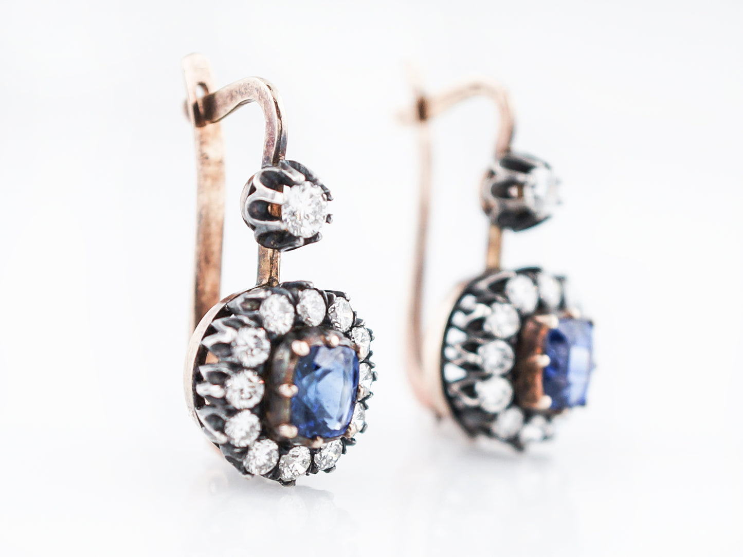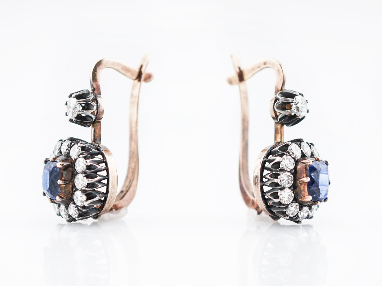 These antique style sapphire and diamond earrings feature oval sapphires and round brilliant diamonds. The earrings are completed in sterling silver and 14 karat rose gold evoking an antique feel. The oval sapphires are surrounded in twelve round brilliant diamonds creating a cluster design. The cluster is further accented with a round brilliant diamond fixed to the post of the earring. The back of the earring is finished a lever back closure. The earring are reminiscent to the feminine designs of the victorian period.
