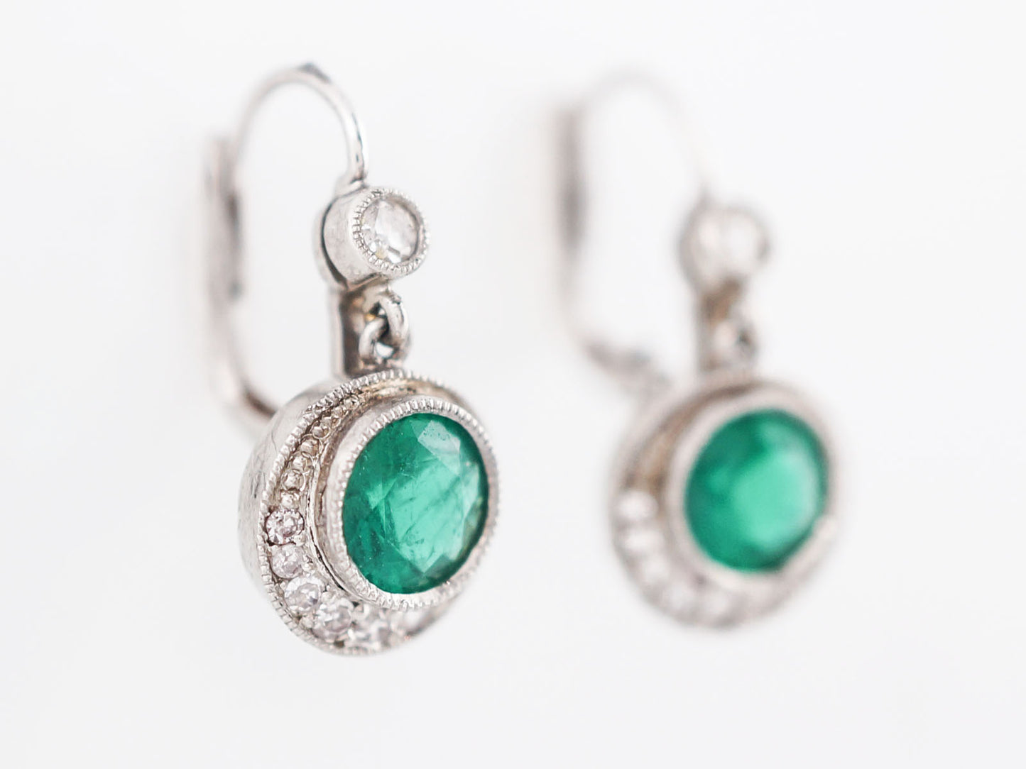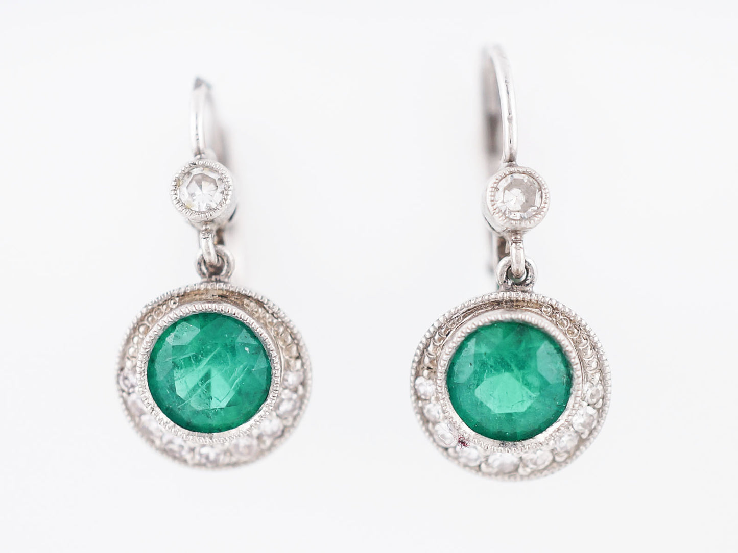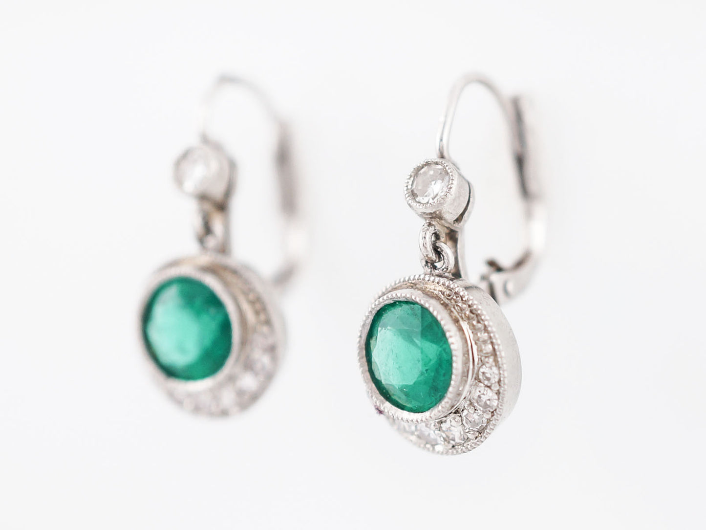 These Modern era dangle style earrings are what we call vintage inspired, meaning youll see hints of things from other decades like milgraining and engraving. Cast in Platinum, each earring features a bezel set diamond attached to a lever back style post. From that diamond hangs a 1.00 carat bezel set round cut Emerald that is surrounded by a halo of diamonds and delicate engraving. These earrings are elegant without being too extravagant.