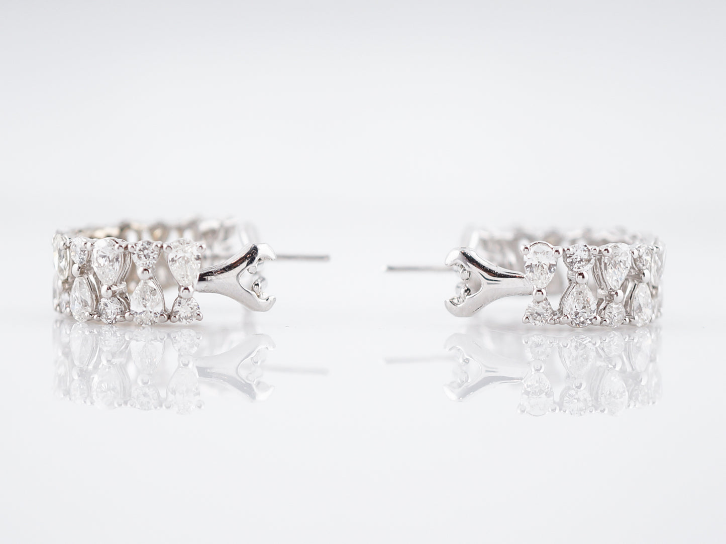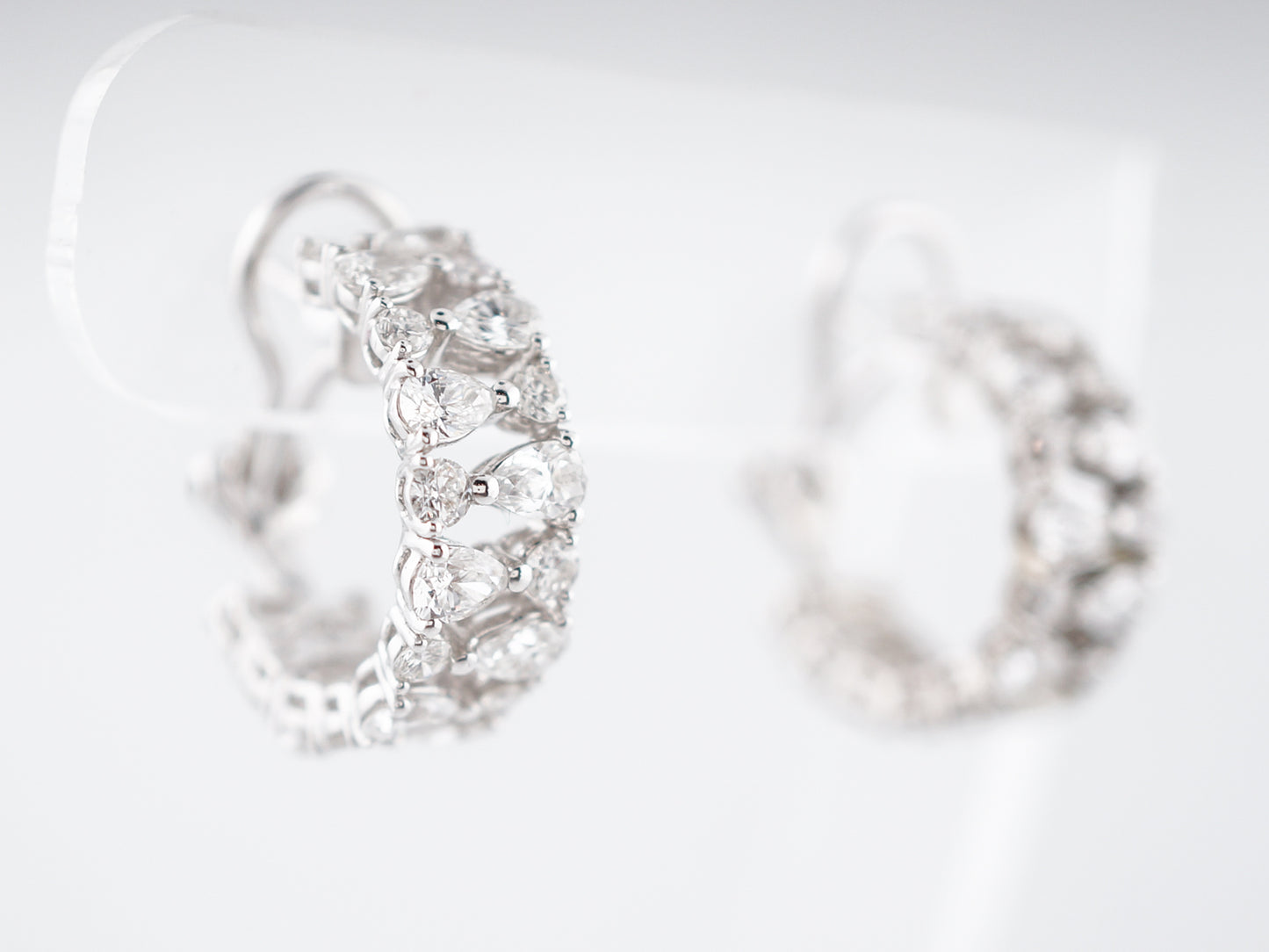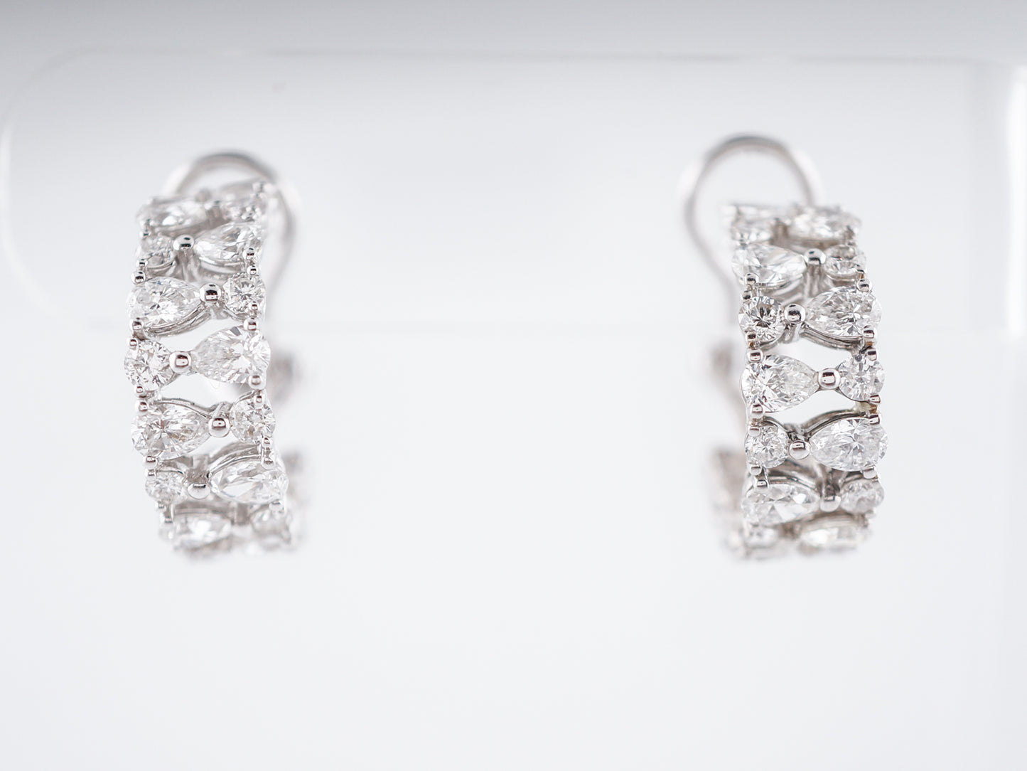 These Modern hoop earrings are composed of a combination of diamonds and 18k white gold. The diamonds are pear shapes and round brilliant cuts and the total carat weight is 4.24 carats. The different diamond cuts alternate creating a pattern in the earrings. There is also negative space in the design that gives these earrings more dimension.