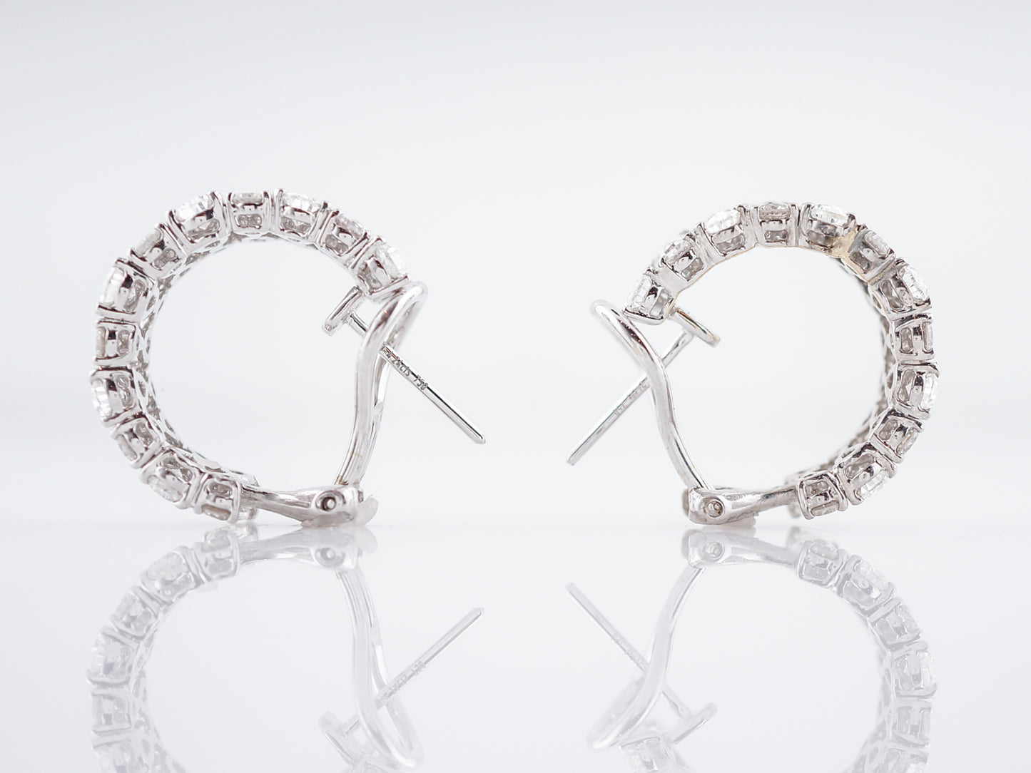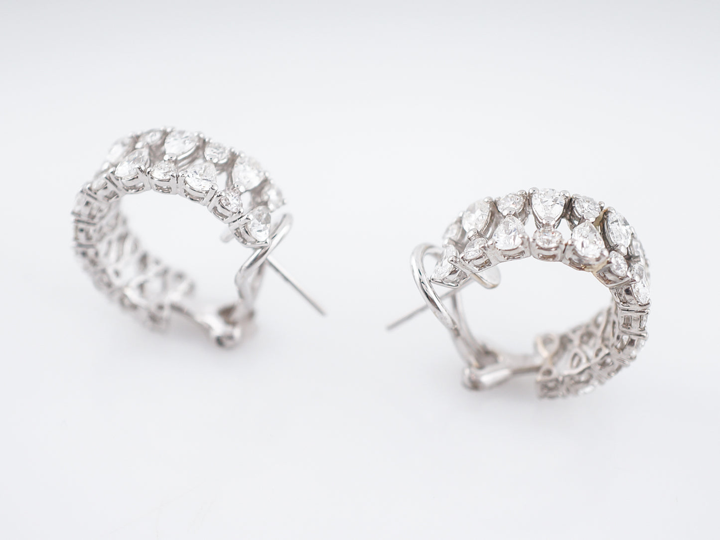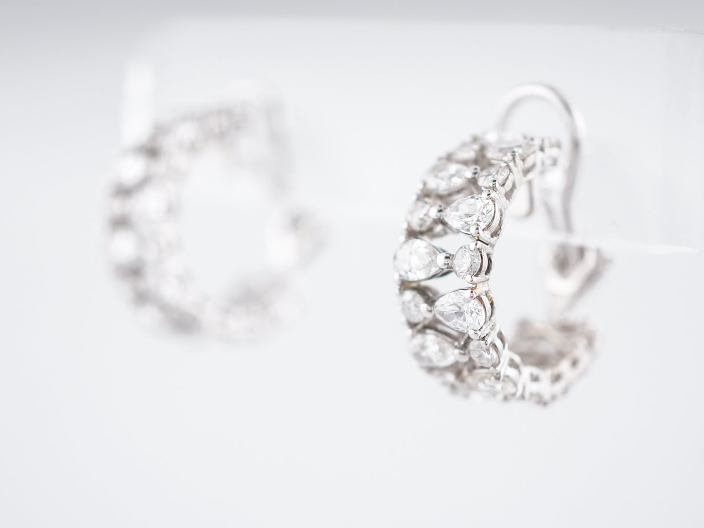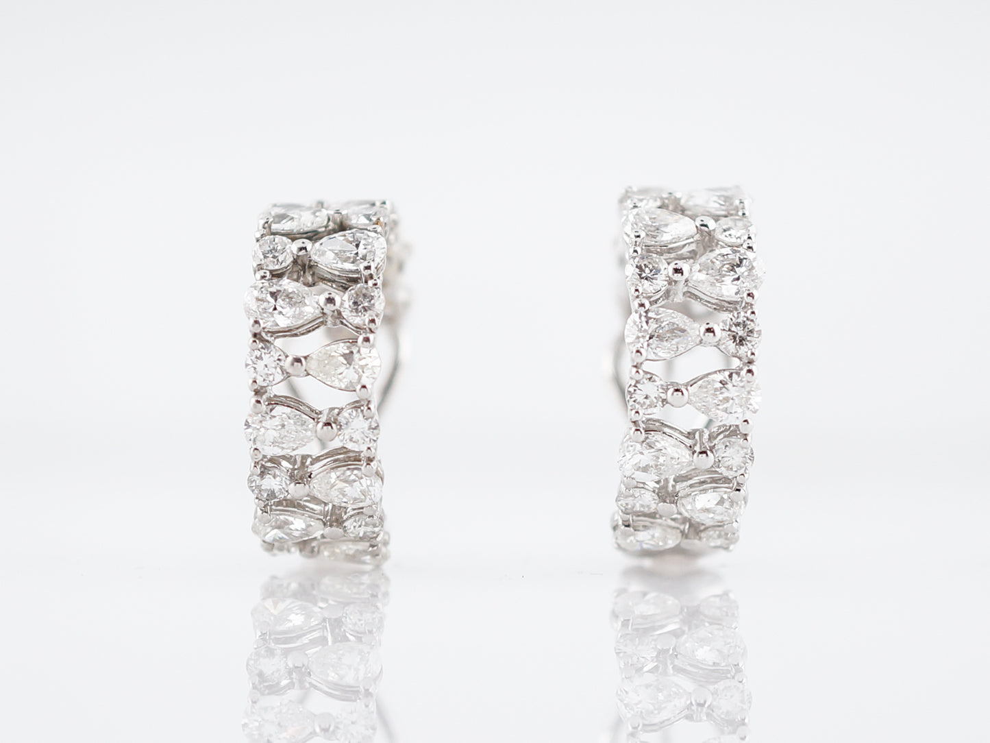 These Modern hoop earrings are composed of a combination of diamonds and 18k white gold. The diamonds are pear shapes and round brilliant cuts and the total carat weight is 4.24 carats. The different diamond cuts alternate creating a pattern in the earrings. There is also negative space in the design that gives these earrings more dimension.