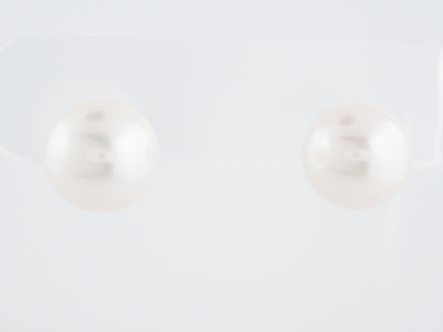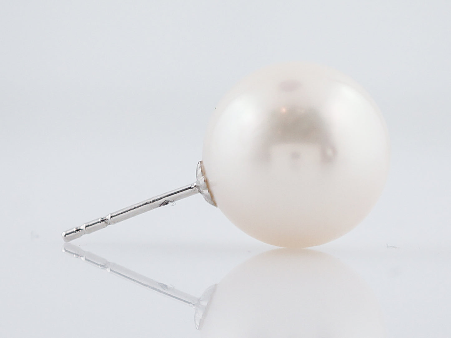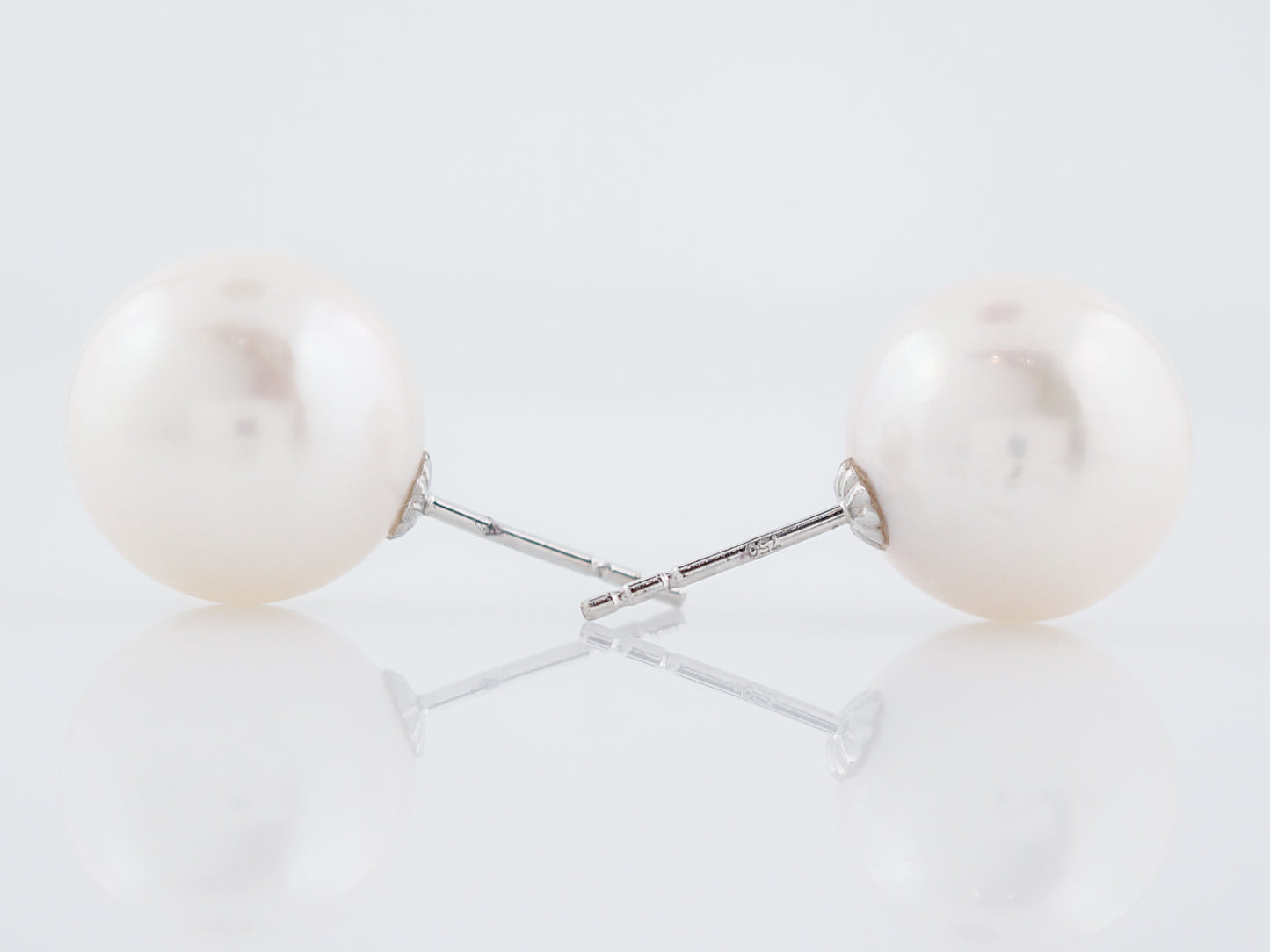 A pair of Modern Era pearl earrings like these should be a staple in every womans jewelry collection. Made with 14 karat white gold posts, these 13mm pearls have a lovely luster and are a crisp white.