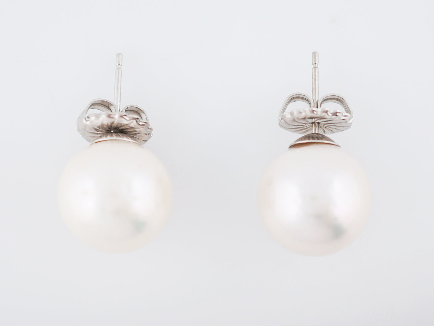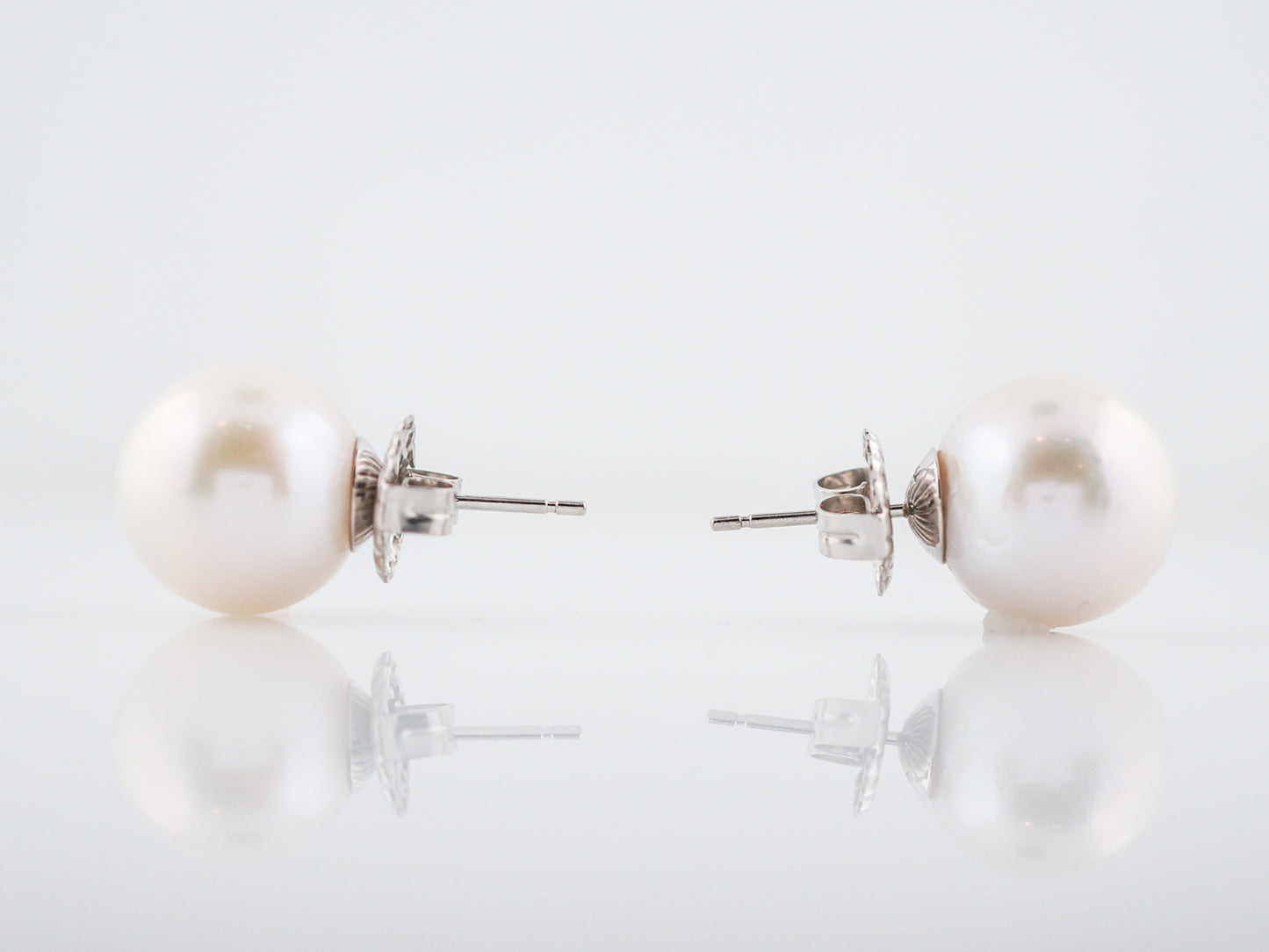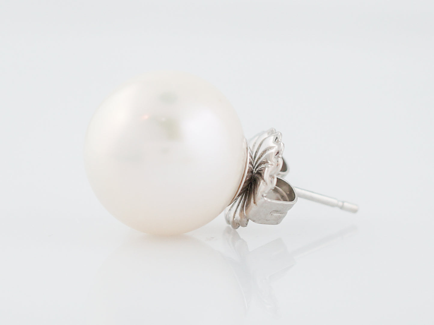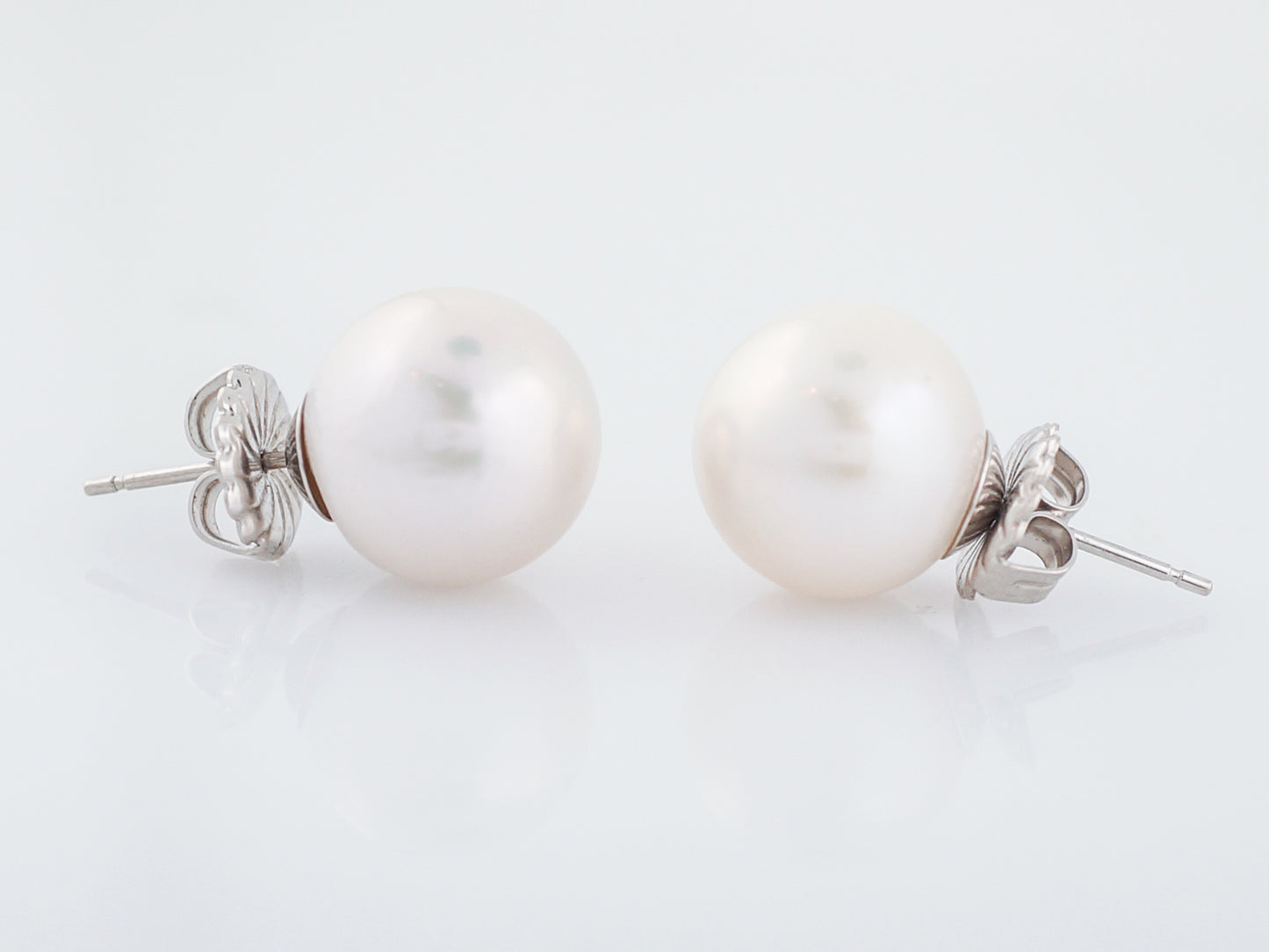 Classic and bold these large pearl stud earrings are the perfect addition to any womens wardrobe. These lovely cultured pearls measure 14.5 mm in diameter. The earrings complete with 14 karat white gold post and 14 karat white gold push backs.